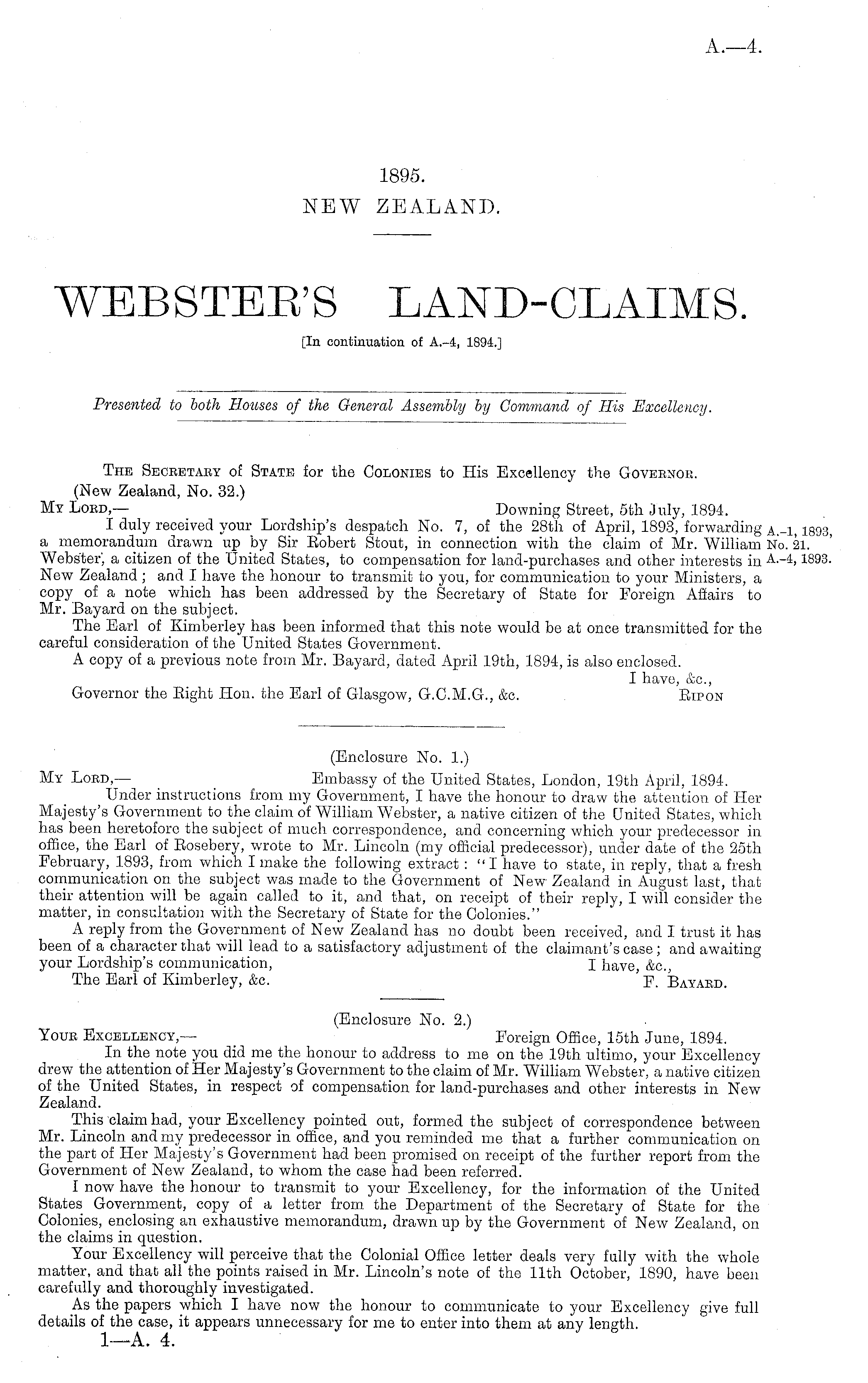 (Enclosure No. 2.) Youe Excellency,— Foreign Office, 15th June, 1894. In the note you did me the honour to address to mo on the 19th ultimo, your Excellency drew the attention of Her Majesty's Government to the claim of Mr. William Webster, a native citizen of the United States, in respect of compensation for land-purchases and other interests in New Zealand. This claim had, your Excellency pointed out, formed the subject of correspondence between Mr. Lincoln and my predecessor in office, and you reminded me that a further communication on the part of Her Majesty's Government had been promised on receipt of the further report from the Government of New Zealand, to whom the case nad been referred. I now have the honour to transmit to your Excellency, for the information of the United States Government, copy of a letter from the Department of the Secretary of State for the Colonies, enclosing an exhaustive memorandum, drawn up by the Government of New Zealand, on the claims in question. Your Excellency will perceive that the Colonial Office letter deals very fully with the whole matter, and that all the points raised in Mr. Lincoln's note of the 11th October, 1890, have been carefully and thoroughly investigated. As the papers which I have now the honour to communicate to your Excellency give full details of the case, it appears unnecessary for me to enter into them at any length. I—A. 4.