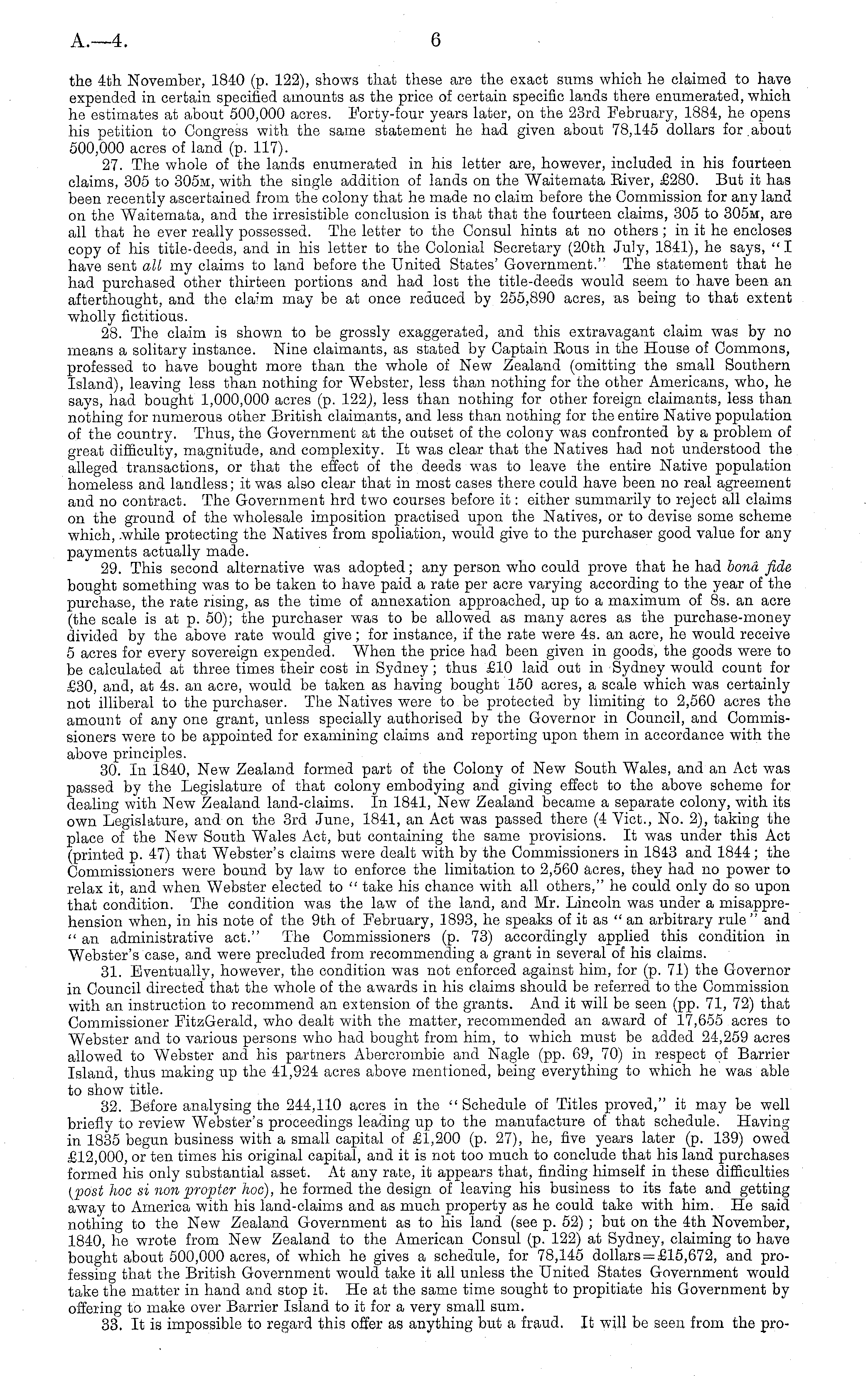 the 4th November, 1840 (p. 122), shows that these are the exact sums which he claimed to have expended in certain specified amounts as the price of certain specific lands there enumerated, which he estimates at about 500,000 acres. Forty-four years later, on the 23rd February, 1884, he opens his petition to Congress with the same statement he had given about 78,145 dollars for.about 500,000 acres of land (p. 117). 27. The whole of the lands enumerated in his letter are, however, included in his fourteen claims, 305 to 305 m, with the single addition of lands on the Waitemata Biver, £280. But it has been recently ascertained from the colony that he made no claim before the Commission for any land on the Waitemata, and the irresistible conclusion is that that the fourteen claims, 305 to 305 m, are all that he ever really possessed. The letter to the Consul hints at no others ; in it he encloses copy of his title-deeds, and in his letter to the Colonial Secretary (20th July, 1841), he says, "I have sent all my claims to land before the United States' Government." The statement that he had purchased other thirteen portions and had lost the title-deeds would seem to have been an afterthought, and the claim may be at once reduced by 255,890 acres, as being to that extent wholly fictitious. 28. The claim is shown to be grossly exaggerated, and this extravagant claim was by no means a solitary instance. Nine claimants, as stated by Captain Bous in the House of Commons, professed to have bought more than the whole of New Zealand (omitting the small Southern Island), leaving less than nothing for Webster, less than nothing for the other Americans, who, he says, had bought 1,000,000 acres (p. 122J, less than nothing for other foreign claimants, less than nothing for numerous other British claimants, and less than nothing for the entire Native population of the country. Thus, the Government at the outset of the colony was confronted by a problem of great difficulty, magnitude, and complexity. It was clear that the Natives had not understood the alleged transactions, or that the effect of the deeds was to leave the entire Native population homeless and landless; it was also clear that in most cases there could have been no real agreement and no contract. The Government hrd two courses before it: either summarily to reject all claims on the ground of the wholesale imposition practised upon the Natives, or to devise some scheme which, while protecting the Natives from spoliation, would give to the purchaser good value for any payments actually made. 29. This second alternative was adopted; any person who could prove that he had bond fide bought something was to be taken to have paid a rate per acre varying according to the year of the purchase, the rate rising, as the time of annexation approached, up to a maximum of Bs. an acre (the scale is at p. 50); the purchaser was to be allowed as many acres as the purchase-money divided by the above rate would give; for instance, if the rate were 4s. an acre, he would receive 5 acres for every sovereign expended. When the price had been given in goods, the goods were to be calculated at three times their cost in Sydney ; thus £10 laid out in Sydney would count for £30, and, at 4s. an acre, would be taken as having bought 150 acres, a scale which was certainly not illiberal to the purchaser. The Natives were to be protected by limiting to 2,560 acres the amount of any one grant, unless specially authorised by the Governor in Council, and Commissioners were to be appointed for examining claims and reporting upon them in accordance with the above principles. 30. In 1840, New Zealand formed part of the Colony of New South Wales, and an Act was passed by the Legislature of that colony embodying and giving effect to the above scheme for dealing with New Zealand land-claims. In 1841, New Zealand became a separate colony, with its own Legislature, and on the 3rd June, 1841, an Act was passed there (4 Vict., No. 2), taking the place of the New South Wales Act, but containing the same provisions. It was under this Act (printed p. 47) that Webster's claims were dealt with by the Commissioners in 1843 and 1844; the Commissioners were bound by law to enforce the limitation to 2,560 acres, they had no power to relax it, and when Webster elected to " take his chance with all others," he could only do so upon that condition. The condition was the law of the land, and Mr. Lincoln was under a misapprehension when, in his note of the 9th of February, 1893, he speaks of it as " an arbitrary rule" and "an administrative act." The Commissioners (p. 73) accordingly applied this condition in Webster's case, and were precluded from recommending a grant in several of his claims. 31. Eventually, however, the condition was not enforced against him, for (p. 71) the Governor in Council directed that the whole of the awards in his claims should be referred to the Commission with an instruction to recommend an extension of the grants. And it will be seen (pp. 71, 72) that Commissioner FitzGerald, who dealt with the matter, recommended an award of 17,655 acres to Webster and to various persons who had bought from him, to which must be added 24,259 acres allowed to Webster and his partners Abercrombie and Nagle (pp. 69, 70) in respect of Barrier Island, thus making up the 41,924 acres above mentioned, being everything to which he was able to show title. 32. Before analysing the 244,110 acres in the "Schedule of Titles proved," it may be well briefly to review Webster's proceedings leading up to the manufacture of that schedule. Playing in 1835 begun business with a small capital of £1,200 (p. 27), he, five years later (p. 139) owed £12,000, or ten times his original capital, and it is not too much to conclude that his land purchases formed his only substantial asset. At any rate, it appears that, finding himself in these difficulties [post hoc si non propter hoc), he formed the design of l