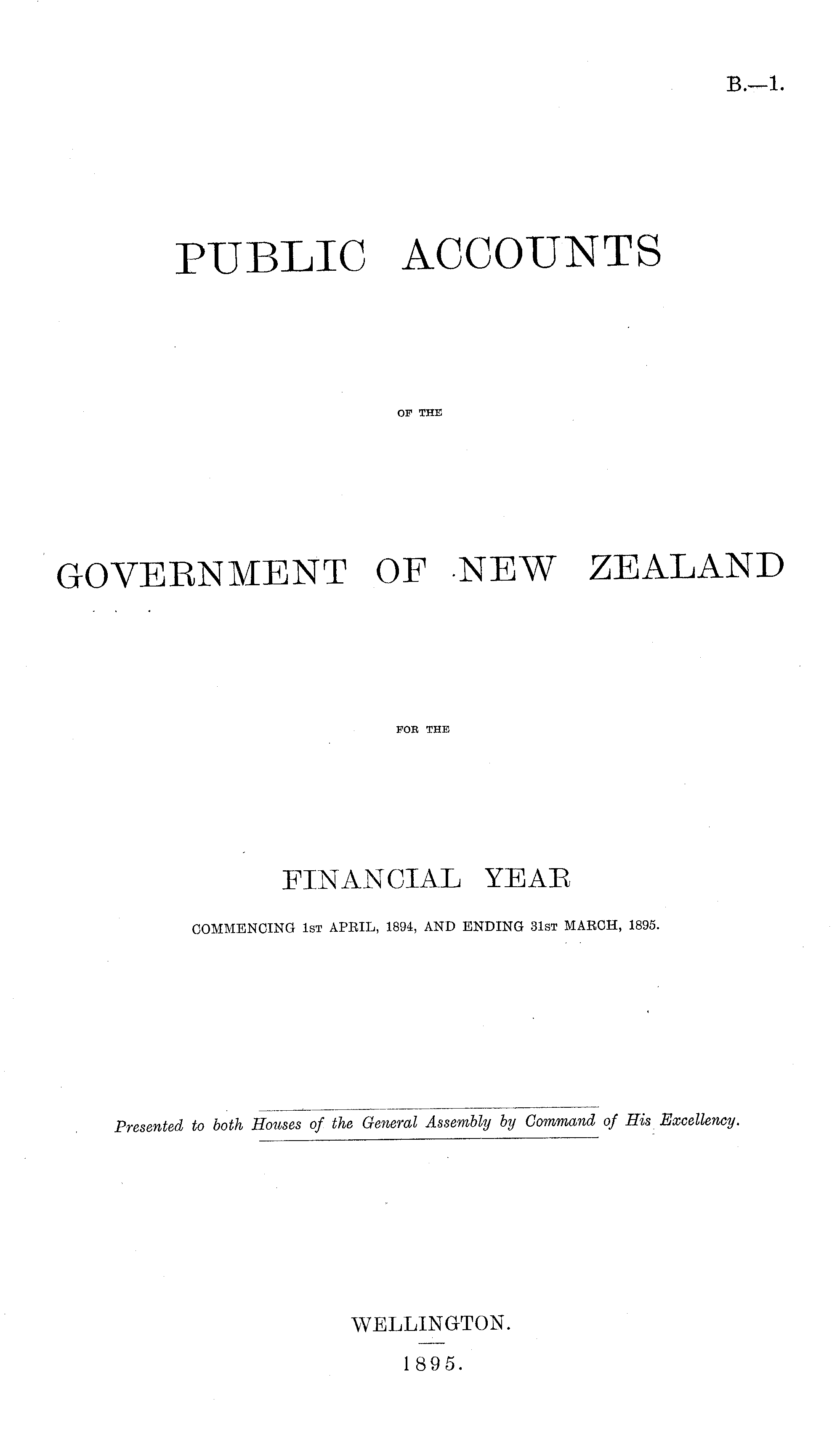 PUBLIC ACCOUNTS OF THE GOVERNMENT OF NEW ZEALAND FOR THE FINANCIAL YEAR COMMENCING 1st APRIL, 1894, AND ENDING 31st MARCH, 1895.