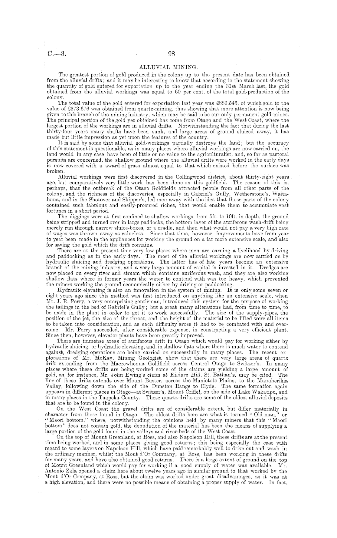 ALLUVIAL MINING. The greatest portion of gold produced in the colony up to the present date has been obtained from the alluvial drifts; and it may be interesting to know that according to the statement showing the quantity of gold entered for exportation up to the year ending the 31st March last, the gold, obtained from the alluvial workings was equal to 60 per cent, of the total gold-production of the colony. The total value of the gold entered for exportation last year was £889,545, of which gold to the value of £373,676 was obtained from quartz-mining, thus showing that more attention is now being given to this branch of the mining industry, which may be said to be our only permanent gold-mines. The principal portion of the gold yet obtained has come from Otago and the West Coast, where the largest portion of the workings are in alluvial drifts. Notwithstanding the fact that during the last thirty-four years many shafts have been sunk, and large areas of ground sluiced away, it has made but little impression as yet upon the features of the country. It is said by some that alluvial gold-workings partially destroys the land; but the accuracy of this statement is questionable, as in many places where alluvial workings are now carried on, the land would in any case have been of little or no value to the agriculturalist, and, so far as pastoral pursuits are concerned, the shallow ground where the alluvial drifts were worked in the early days is now covered with a sward of grass almost equal to that which existed before the surface was broken. Alluvial workings were first discovered in the Collingwood district, about thirty-eight years ago, but comparatively very little work has been done on this goldfield. The reason of this is, perhaps, that the outbreak of the Otago Goldfields attracted people from all other parts of the colony, and the richness of the discoveries, especially in Gabriel's Gully, Wetherstone's, Waitahuna, and in the Shotover and Skipper's, led men away with the idea that those parts of the colony contained such fabulous and easily-procured riches, that would enable them to accumulate vast fortunes in a short period. The diggings were at first confined to shallow workings, from sft. to 10ft. in depth, the ground being stripped and turned over in large paddocks, the bottom layer of the auriferous wash-drift being merely run through narrow sluice-boxes, or a cradle, and then what would not pay a very high rate of wages was thrown away as valueless. Since that time, however, improvements have from year to year been made in the appliances for working the ground on a far more extensive scale, and also for saving the gold which the drift contains. There are at the present time very few places where men are earning a livelihood by driving and paddocking as in the early days. The most of the alluvial workings are now carried on by hydraulic sluicing and dredging operations. The latter has of late years become an extensive branch of the mining industry, and a very large amount of capital is invested in it. Dredges are now placed on every river and stream which contains auriferous wash, and they are also working shallow flats where in former years the water to contend with was too heavy, which prevented the miners working the ground economically either by driving or paddocking. Hydraulic elevating is also an innovation in the system of mining. It is only some seven or eight years ago since this method was first introduced on anything like an extensive scale, when Mr. J. R. Perry, a very enterprising gentleman, introduced this system for the purpose of working the tailings in the bed of Gabriel's Gully; but a great many alterations had, from time to time, to be made in the plant in order to get it to work successfully. The size of the supply-pipes, the position of the jet, the size of the throat, and the height of the material to be lifted were all items to be taken into consideration, and as each difficulty arose it had to be combated with and overcome. Mr. Perry succeeded, after considerable expense, in constructing a very efficient plant. Since then, however, elevator plants have been greatly improved. There are immense areas of auriferous drift in Otago which would pay for working either by hydraulic sluicing, or hydraulic elevating, and, in shallow flats where there is much water to contend against, dredging operations are being carried on successfully in many places. The recent explorations of Mr. McKay, Mining Geologist, show that there are very large areas of quartz drift extending from the Maerewhenua Goldfield across Central Otago to Switzer's. In many places where these drifts are being worked some of the claims are yielding a large amount of gold, as, for instance, Mr. John Ewing's claim at Kildare Hill, St. Bathan's, may be cited. The line of these drifts extends over Mount Buster, across the Maniototo Plains, to the Manuherikia Valley, following down the side of the Dunstan Eange to Clyde. The same formation again appears in different places in Otago—at Switzer's, Mount Criffel, on the side of Lake Wakatipu, and in many places in the Tuapeka County. These quartz-drifts are some of the oldest alluvial deposits that are to be found in the colony. On the West Coast the gravel drifts are of considerable extent, but differ materially in character from those found in Otago. The oldest drifts here are what is termed " Old man," or " Maori bottom," where, notwithstanding the opinions held by many miners that this " Maori bottom" does not contain gold, the denudation of the material has been the means of supplying a large portion of the gold found in the valleys and river-beds of the West Coast. On the top of Mount Greenland, at Ross, and also Napoleon Hill, these drifts are at the present time being worked, and in some places giving good returns; this being especially the case with regard to some layers on Napoleon Hill, which have paid remarkably well to drive out and wash