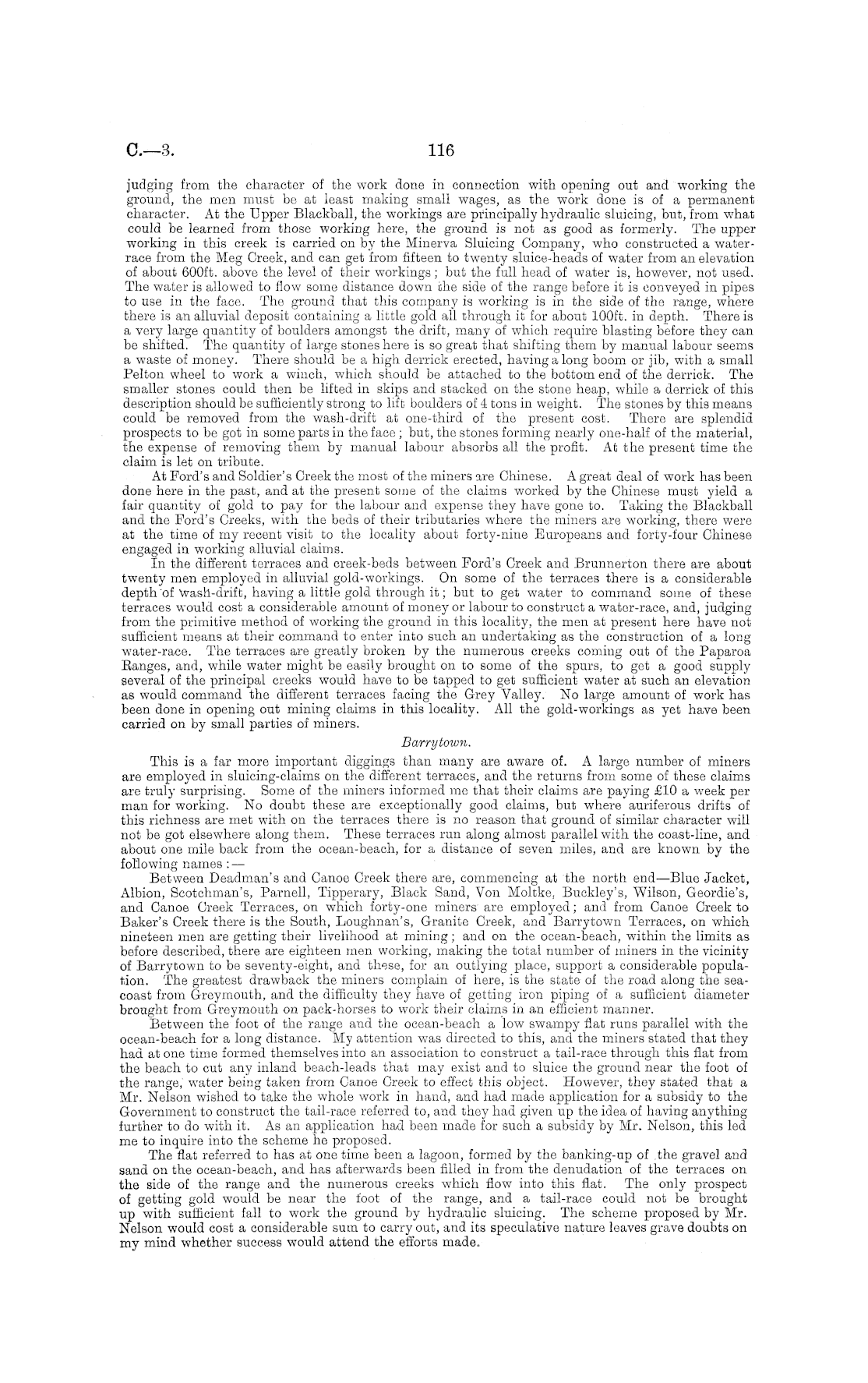 judging from the character of the work done in connection with opening out and working the ground, the men must be at least making small wages, as the work done is of a permanent character. At the Upper Blackball, the workings are principally hydraulic sluicing, but, from what could be learned from those working here, the ground is not as good as formerly. The upper working in this creek is carried on by the Minerva Sluicing Company, who constructed a waterrace from the Meg Creek, and can get from fifteen to twenty sluice-heads of water from an elevation of about 600 ft. above the level of their workings; but the full head of water is, however, not used. The water is allowed to flow some distance down the side of the range before it is conveyed in pipes to use in the face. The ground that this company is working is in the side of the range, where there is an alluvial deposit containing a little gold all through it for about 100 ft. in depth. There is a very large quantity of boulders amongst the drift, many of which require blasting before they can be shifted. The quantity of large stones here is so great that shifting them by manual labour seems a waste of money. There should be a high derrick erected, having a long boom or jib, with a small Pelton wheel to work a winch, which should be attached to the bottom end of the derrick. The smaller stones could then be lifted in skips and stacked on the stone heap, while a derrick of this description should be sufficiently strong to lift boulders of 4 tons in weight. The stones by this means could be removed from the wash-drift at one-third of the present cost. There are splendid prospects to be got in some parts in the face ; but, the stones forming nearly one-half of the material, the expense of removing them by manual labour absorbs all the profit. At the present time the claim is let on tribute. At Ford's and Soldier's Creek the most of the miners are Chinese. A great deal of work has been done here in the past, and at the present some of the claims worked by the Chinese must yield a fair quantity of gold to pay for the labour and expense they have gone to. Taking the Blackball and the Ford's Creeks, with the beds of their tributaries where the miners are working, there were at the time of my recent visit to the locality about forty-nine Europeans and forty-four Chinese engaged in working alluvial claims. In the different terraces and creek-beds between Ford's Creek and Brunnerton there are about twenty men employed in alluvial gold-workings. On some of the terraces there is a considerable depth "of Wash-drift, having a little gold through it; but to get water to command some of these terraces would cost a considerable amount of money or labour to construct a water-race, and, judging from the primitive method of working the ground in this locality, the men at present here have not sufficient means at their command to enter into such an undertaking as the construction of a long water-race. The terraces are greatly broken by the numerous creeks coming out of the Paparoa Eanges, and, while water might be easily brought on to some of the spurs, to get a good supply several of the principal creeks would have to be tapped to get sufficient water at such an elevation as would command the different terraces facing the Grey Valley. No large amount of work has been done in opening out mining claims in this locality. All the gold-workings as yet have been carried on by small parties of miners. Barrytown. This is a far more important diggings than many are aware of. A large number of miners are employed in sluicing-claims on the different terraces, and the returns from some of these claims are truly surprising. Some of the miners informed me that their claims are paying £10 a week per man for working. No doubt these are exceptionally good claims, but where auriferous drifts of this richness are met with on the terraces there is no reason that ground of similar character will not be got elsewhere along them. These terraces run along almost parallel with the coast-line, and about one mile back from the ocean-beach, for a distance of seven miles, and are known by the following names : — Between Deadman's and Canoe Creek there are, commencing at the north end—Blue Jacket, Albion, Scotchman's, Parnell, Tipperary, Black Sand, Yon Moltke, Buckley's, Wilson, Geordie's, and Canoe Creek Terraces, on which forty-one miners are employed; and from Canoe Creek to Baker's Creek there is the South, Loughnan's, Granite Creek, and Barrytown Terraces, on which nineteen men are getting their livelihood at mining; and on the ocean-beach, within the limits as before described, there are eighteen men working, making the total number of miners in the vicinity of Barrytown to be seventy-eight, and these, for an outlying place, support a considerable population. The greatest drawback the miners complain of here, is the state of the road along the seacoast from Greymouth, and the difficulty they have of getting iron piping of a sufficient diameter brought from Greymouth on pack-horses to work their claims in an efficient manner. Between the foot of the range and the ocean-beach a low swampy flat runs parallel with the ocean-beach for a long distance. My attention was directed to this, and the miners stated that they had at one time formed themselves into an association to construct a tail-race through this flat from the beach to cut any inland beach-leads that may exist and to sluice the ground near the foot of the range, water being taken from Canoe Creek to effect this object. However, they stated that a Mr. Nelson wished to take the whole work in hand, and had made application for a subsidy to the Government to construct the tail-race referred to, and they had given up the idea of having anything further to do with it. As an application had been made for such a subsidy by Mr. Nelson, this led me to inquire into the scheme he proposed. The flat referred to has at one time
