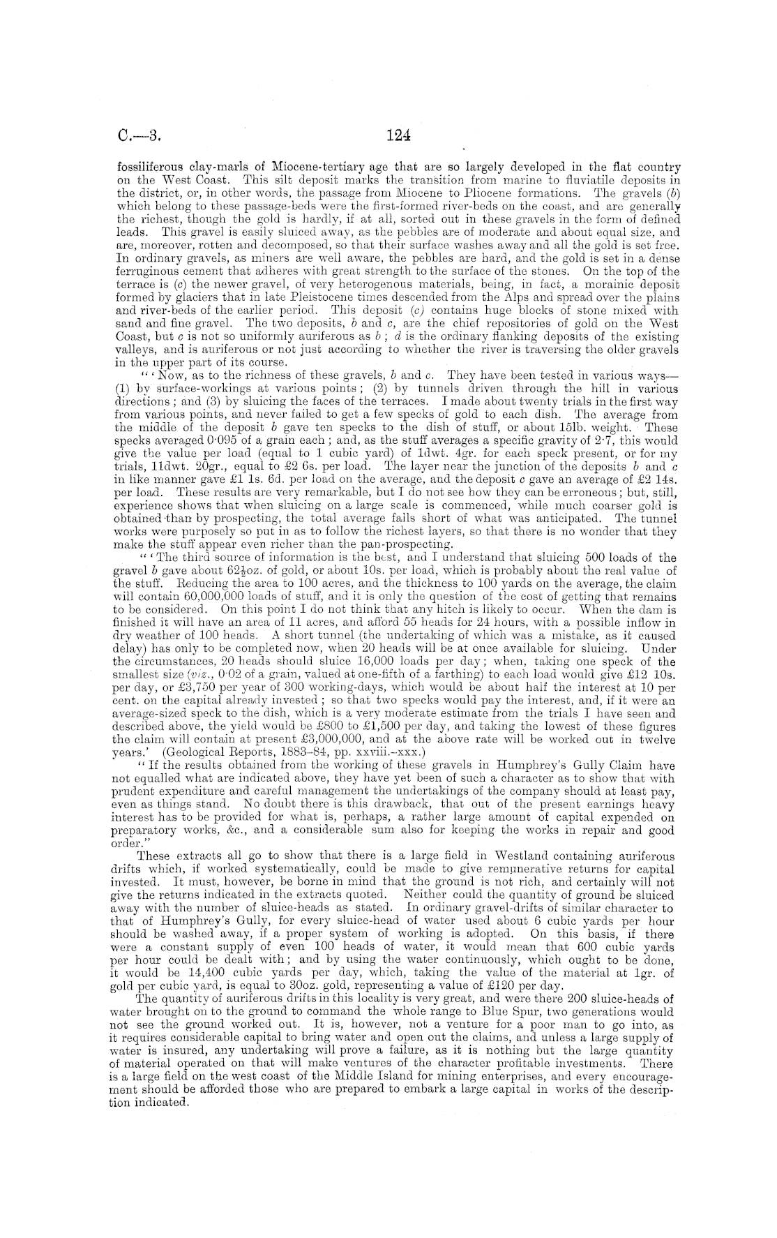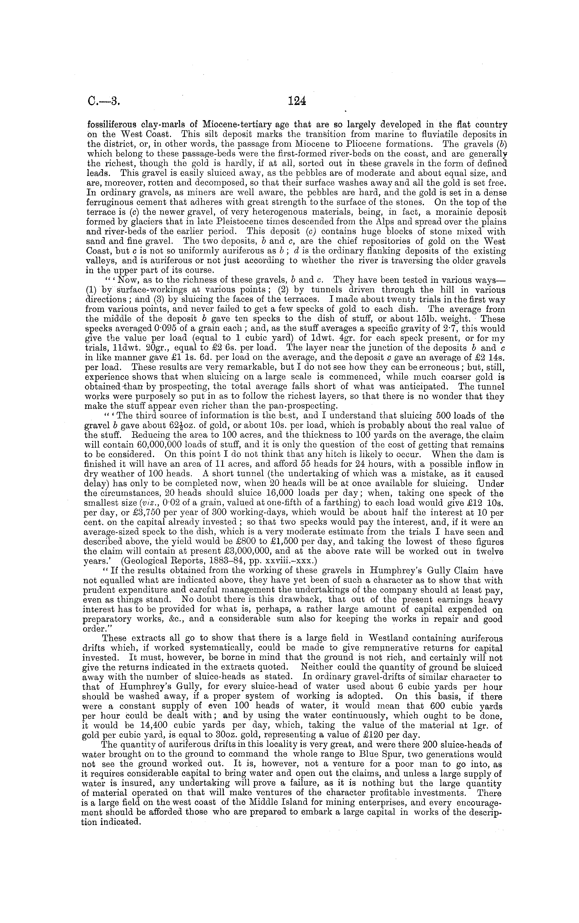 fossiliferous clay-mark of Miocene-tertiary age that are so largely developed in the flat country on the West Coast. This silt deposit marks the transition from marine to fluviatile deposits in the district, or, in other words, the passage from Miocene to Pliocene formations. The gravels (b) which belong to these passage-beds were the first-formed river-beds on the coast, and are generally the richest, though the gold is hardly, if at all, sorted out in these gravels in the form of defined leads. This gravel is easily sluiced away, as the pebbles are of moderate and about equal size, and are, moreover, rotten and decomposed, so that their surface washes away and all the gold is set free. In ordinary gravels, as miners are well aware, the pebbles are hard, and the gold is set in a dense ferruginous cement that adheres with great strength to the surface of the stones. On the top of the terrace is (c) the newer gravel, of very heterogenous materials, being, in fact, a morainic deposit formed by glaciers that in late Pleistocene times descended from the Alps and spread over the plains and river-beds of the earlier period. This deposit (c) contains huge blocks of stone mixed with sand and fine gravel. The two deposits, b and c, are the chief repositories of gold on the West Coast, but c is not so uniformly auriferous as b ; d is the ordinary flanking deposits of the existing valleys, and is auriferous or not just according to whether the river is traversing the older gravels in the upper part of its course. " ' Now, as to the richness of these gravels, b and c. They have been tested in various ways— (1) by surface-workings at various points ; (2) by tunnels driven through the hill in various directions ; and (3) by sluicing the faces of the terraces. I made about twenty trials in the first way from various points, and never failed to get a few specks of gold to each dish. The average from the middle of the deposit b gave ten specks to the dish of stuff, or about 151b. weight. These specks averaged 0-095 of a grain each ; and, as the stuff averages a specific gravity of 2-7, this would give the value per load (equal to 1 cubic yard) of ldwt. 4gr. for each speck present, or for my trials, lldwt. 20gr., equal to £2 6s. per load. The layer near the junction of the deposits b and c in like manner gave £1 Is. 6d. per load on the average, and the deposit c gave an average of £2 14s. per load. These results are very remarkable, but Ido not see how they can be erroneous ; but, still, experience shows that when sluicing on a large scale is commenced, while much coarser gold is obtained 'than by prospecting, the total average falls short of what was anticipated. The tunnel works were purposely so put in as to follow the richest layers, so that there is no wonder that they make the stuff appear even richer than the pan-prospecting. " ' The third source of information is the best, and I understand that sluicing 500 loads of the gravel b gave about of gold, or about 10s. per load, which is probably about the real value of the stuff. Reducing the area to 100 acres, and the thickness to 100 yards on the average, the claim will contain 60,000,000 loads of stuff, and it is only the question of the cost of getting that remains to be considered. On this point Ido not think that any hitch is likely to occur. When the dam is finished it will have an area of 11 acres, and afford 55 heads for 24 hours, with a possible inflow in dry weather of 100 heads. A short tunnel (the undertaking of which was a mistake, as it caused delay) has only to be completed now, when 20 heads will be at once available for sluicing. Under the circumstances, 20 heads should sluice 16,000 loads per day; when, taking one speck of the smallest size (viz., 002 of a grain, valued at one-fifth of a farthing) to each load would give £12 10s. per day, or £3,750 per year of 300 working-days, which would be about half the interest at 10 per cent, on the capital already invested ; so that two specks would pay the interest, and, if it were an average-sized speck to the dish, which is a very moderate estimate from the trials I have seen and described above, the yield would be £800 to £1,500 per day, and taking the lowest of these figures the claim will contain at present £3,000,000, and at the above rate will be worked out in twelve years.' (Geological Eeports, 1883-84, pp. xxviii.-xxx.) "If the results obtained from the working of these gravels in Humphre3 7 's Gully Claim have not equalled what are indicated above, they have yet been of such a character as to show that with prudent expenditure and careful management the undertakings of the company should at least pay, even as things stand. No doubt there is this drawback, that out of the present earnings heavy interest has to be provided for what is, perhaps, a rather large amount of capital expended on preparatory works, &c, and a considerable sum also for keeping the works in repair and good order." These extracts all go to show that there is a large field in Westland containing auriferous drifts which, if worked systematically, could be made to give remunerative returns for capital invested. It must, however, be borne in mind that the ground is not rich, and certainly will not give the returns indicated in the extracts quoted. Neither could the quantity of ground be sluiced away with the number of sluice-heads as stated. In ordinary gravel-drifts of similar character to that of Humphrey's Gully, for every sluice-head of water used about 6 cubic yards per hour should be washed away, if a proper system of working is adopted. On this basis, if there were a constant supply of even 100 heads of water, it would mean that 600 cubic yards per hour could be dealt with; and by using the water continuously, which ought to be done, it would be 14,400 cubic yards per day, which, taking the value of the material at Igr. of gold per cubic yard, is equal to 30oz. gold, representing a value of £120 per 