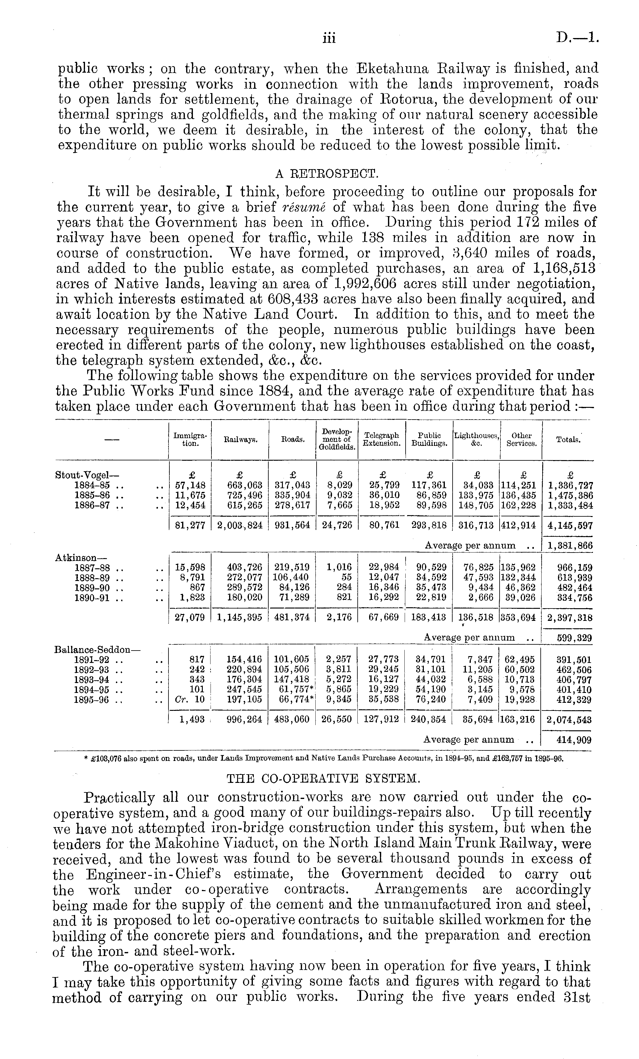 Immigration. Railways. Roads. Development of Goldfields. Telegraph Public Extension. Buildings. Lighthouses,! &ts. Other Services. Totals. Stout-Vogel— 1884-85 .. 1885-86 .. 1886-87 .. £ 57,148 11,675 12,454 £ 663,063 725,496 615,265 £ 317,043 335,904 278,617 £ 8,029 9,032 7,665 £ 25,799 36,010 18,952 £ 117,361 86,859 89,598 £ 34,033 133,975 148,705 £ 114,251 136,435 162,228 £ 1,336,727 1,475,386 1,333,484 Atkinson — 1887-88 .. 1888-89 .. 1889-90 .. 1890-91 .. 81,277 2,003,824 931,564 24,726 80,761 293,818 Aven I 316,713 412,914 4,145,597 1,381,866 .ge per an: .ran 15,598 8,791 867 1,823 403,726 272,077 289,572 180,020 219,519 106,440 84,126 71,289 1,016 55 284 821 I 22,984 90,529 12,047 34,592 16,346 ! 35,473 16,292 I 22,819 70,825 47,593 9,434 2,666 135,962 132,344 46,362 39,026 966,159 613,939 482,464 334,756 27,079 1,145,395 481,374 2,176 67,669 ; 183,413 | 136,518 |353,694 2,397,318 Averai ;e per am: mm 599,329 lallance-Seddon — 1891-92 .. 1892-93 .. 1893-94 .. 1894-95 .. 1895-96 .. 817 242 343 101 Cr. 10 154,416 220,894 176,304 247,545 197,105 101,605 i 2,257 105,506 I 3,811 147,418 5,272 61,757* 5,865 66,774* 9,345 483,060 26,550 27,773 I 34,791 j 29,245 : 31,101 16,127 ' 44,032 19,229 ! 54,190 35,538 I 76,240 j 127,912 I 240,354 | 7,347 11,205 i 6,588 3,145 7,409 62,495 60,502 10,713 9,578 19,928 391,501 462,506 406,797 401,410 412,329 2,074,543 414,909 1,493 996,264 35,694 163,216 Averai ge per ann mm ..