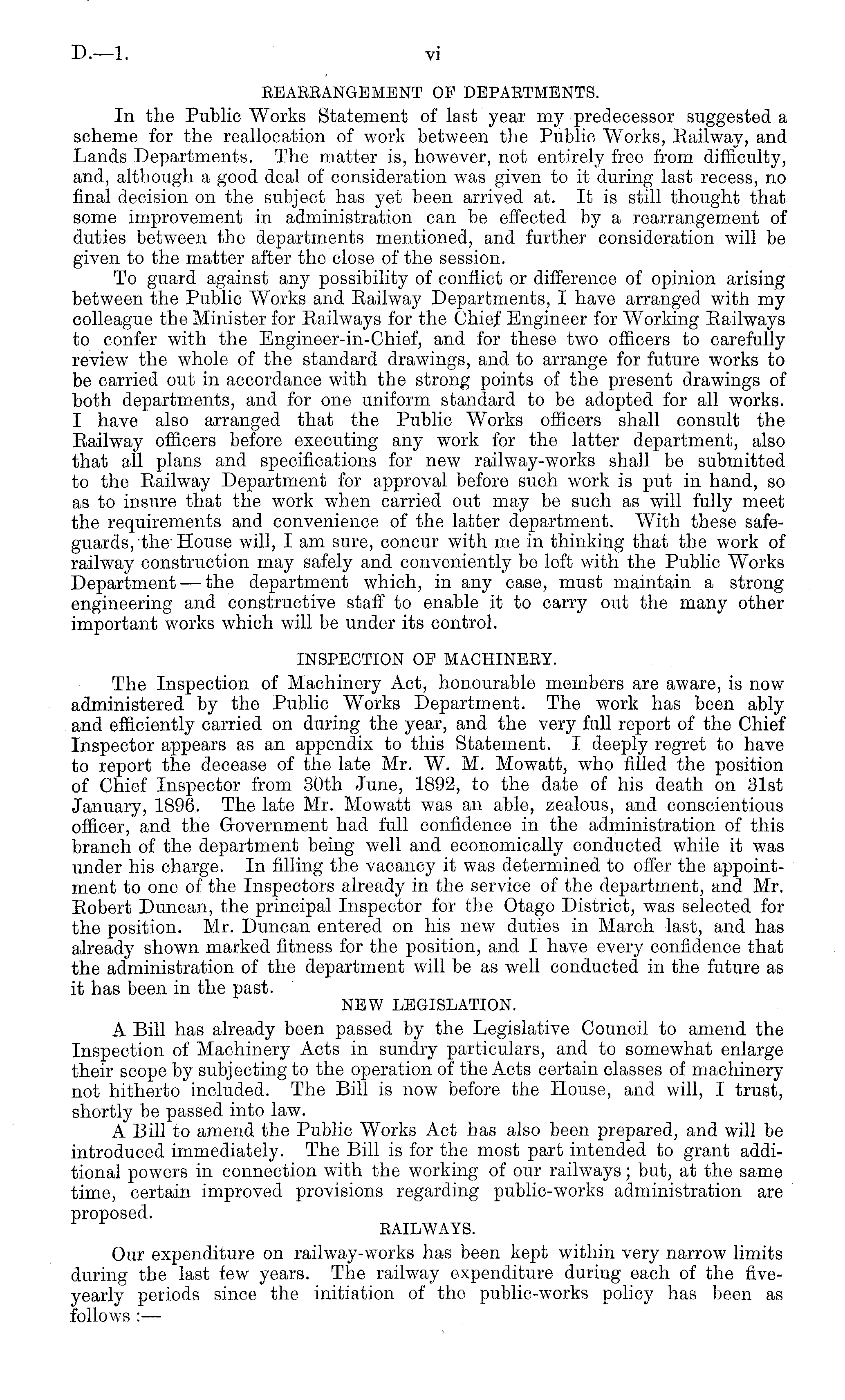 BEABBANGEMENT OP DEPABTMENTS. In the Public Works Statement of last year my predecessor suggested a scheme for the reallocation of work between the Public Works, Railway, and Lands Departments. The matter is, however, not entirely free from difficulty, and, although a good deal of consideration was given to it during last recess, no final decision on the subject has yet been arrived at. It is still thought that some improvement in administration can be effected by a rearrangement of duties between the departments mentioned, and further consideration will be given to the matter after the close of the session. To guard against any possibility of conflict or difference of opinion arising between the Public Works and Railway Departments, I have arranged with my colleague the Minister for Railways for the Chief Engineer for Working Railways to confer with the Bngineer-in-Chief, and for these two officers to carefully review the whole of the standard drawings, and to arrange for future works to be carried out in accordance with the strong points of the present drawings of both departments, and for one uniform standard to be adopted for all works. I have also arranged that the Public Works officers shall consult the Railway officers before executing any work for the latter department, also that all plans and specifications for new railway-works shall be submitted to the Railway Department for approval before such work is put in hand, so as to insure that the work when carried out may be such as will fully meet the requirements and convenience of the latter department. With these safeguards, the' House will, I am sure, concur with me in thinking that the work of railway construction may safely and conveniently be left with the Public Works Department —the department which, in any case, must maintain a strong engineering and constructive staff to enable it to carry out the many other important works which will be under its control. INSPECTION OF MACHINEBY. The Inspection of Machinery Act, honourable members are aware, is now administered by the Public Works Department. The work has been ably and efficiently carried on during the year, and the very full report of the Chief Inspector appears as an appendix to this Statement. I deeply regret to have to report the decease of the late Mr. W. M. Mowatt, who filled the position of Chief Inspector from 30th June, 1892, to the date of his death on 31st January, 1896. The late Mr. Mowatt was an able, zealous, and conscientious officer, and the Government had full confidence in the administration of this branch of the department being well and economically conducted while it was under his charge. In filling the vacancy it was determined to offer the appointment to one of the Inspectors already in the service of the department, and Mr. Robert Duncan, the principal Inspector for the Otago District, was selected for the position. Mr. Duncan entered on his new duties in March last, and has already shown marked fitness for the position, and I have every confidence that the administration of the department will be as well conducted in the future as it has been in the past. NEW LEGISLATION. A Bill has already been passed by the Legislative Council to amend the Inspection of Machinery Acts in sundry particulars, and to somewhat enlarge their scope by subjecting to the operation of the Acts certain classes of machinery not hitherto included. The Bill is now before the House, and will, I trust, shortly be passed into law. A Bill to amend the Public Works Act has also been prepared, and will be introduced immediately. The Bill is for the most part intended to grant additional powers in connection with the working of our railways; but, at the same time, certain improved provisions regarding public-works administration are proposed. BAILWAYS. Our expenditure on railway-works has been kept within very narrow limits during the last few years. The railway expenditure during each of the fiveyearly periods since the initiation of the public-works policy has been as follows :—