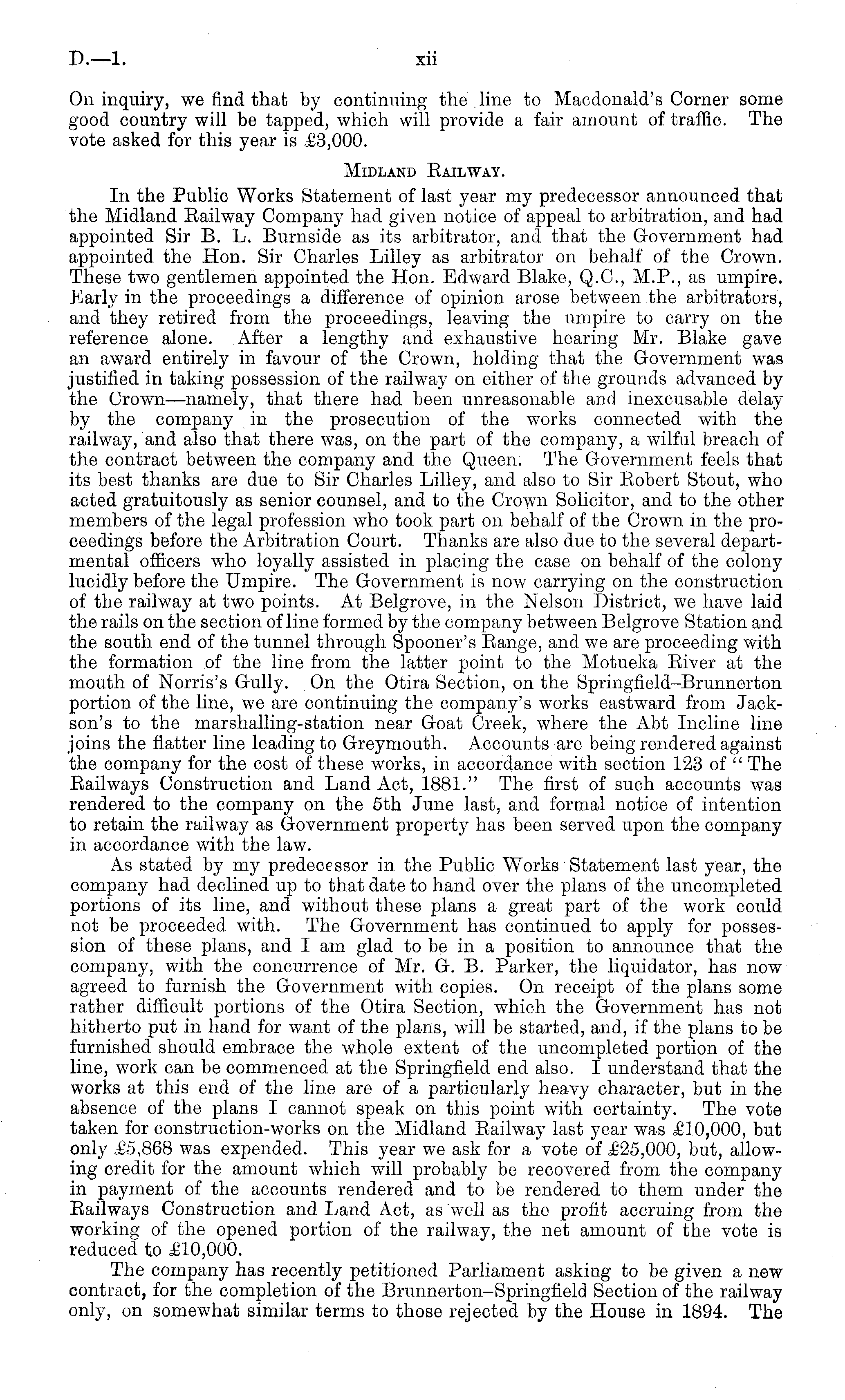 On inquiry, we find that by continuing the line to Macdonald's Corner some good country will be tapped, which will provide a fair amount of traffic. The vote asked for this year is .£3,000. Midland Bail way. In the Public Works Statement of last year my predecessor announced that the Midland Railway Company had given notice of appeal to arbitration, and had appointed Sir B. L. Burnside as its arbitrator, and that the Government had appointed the Hon. Sir Charles Lilley as arbitrator on behalf of the Crown. These two gentlemen appointed the Hon. Edward Blake, Q.C., M.P., as umpire. Early in the proceedings a difference of opinion arose between the arbitrators, and they retired from the proceedings, leaving the umpire to carry on the reference alone. After a lengthy and exhaustive hearing Mr. Blake gave an award entirely in favour of the Crown, holding that the Government was justified in taking possession of the railway on either of the grounds advanced by the Crown —namely, that there had been unreasonable and inexcusable delay by the company in the prosecution of the works connected with the railway, and also that there was, on the part of the company, a wilful breach of the contract between the company and the Queen. The Government feels that its best thanks are due to Sir Charles Lilley, and also to Sir Robert Stout, who acted gratuitously as senior counsel, and to the Crown Solicitor, and to the other members of the legal profession who took part on behalf of the Crown in the proceedings before the Arbitration Court. Thanks are also due to the several departmental officers who loyally assisted in placing the case on behalf of the colony lucidly before the Umpire. The Government is now carrying on the construction of the railway at two points. At Belgrove, in the Nelson District, we have laid the rails on the section of line formed by the company between Belgrove Station and the south end of the tunnel through Spooner's Range, and we are proceeding with the formation of the line from the latter point to the Motueka River at the mouth of Norris's Gully. On the Otira Section, on the Springfield-Brunnerton portion of the line, we are continuing the company's works eastward from Jackson's to the marshalling-station near Goat Creek, where the Abt Incline line joins the flatter line leading to Greymouth. Accounts are being rendered against the company for the cost of these works, in accordance with section 123 of " The Railways Construction and Land Act, 1881." The first of such accounts was rendered to the company on the sth June last, and formal notice of intention to retain the railway as Government property has been served upon the company in accordance with the law. As stated by my predecessor in the Public Works Statement last year, the company had declined up to that date to hand over the plans of the uncompleted portions of its line, and without these plans a great part of the work could not be proceeded with. The Government has continued to apply for possession of these plans, and I am glad to be in a position to announce that the company, with the concurrence of Mr. G. B. Parker, the liquidator, has now agreed to furnish the Government with copies. On receipt of the plans some rather difficult portions of the Otira Section, which the Government has not hitherto put in hand for want of the plans, will be started, and, if the plans to be furnished should embrace the whole extent of the uncompleted portion of the line, work can be commenced at the Springfield end also. I understand that the works at this end of the line are of a particularly heavy character, but in the absence of the plans I cannot speak on this point with certainty. The vote taken for construction-works on the Midland Railway last year was £10,000, but only £5,868 was expended. This year we ask for a vote of £25,000, but, allowing credit for the amount which will probably be recovered from the company in payment of the accounts rendered and to be rendered to them under the Railways Construction and Land Act, as well as the profit accruing from the working of the opened portion of the railway, the net amount of the vote is reduced to £10,000. The company has recently petitioned Parliament asking to be given a new contract, for the completion of the Brunnerton-Springfield Section of the railway only, on somewhat similar terms to those rejected by the House in 1894. The