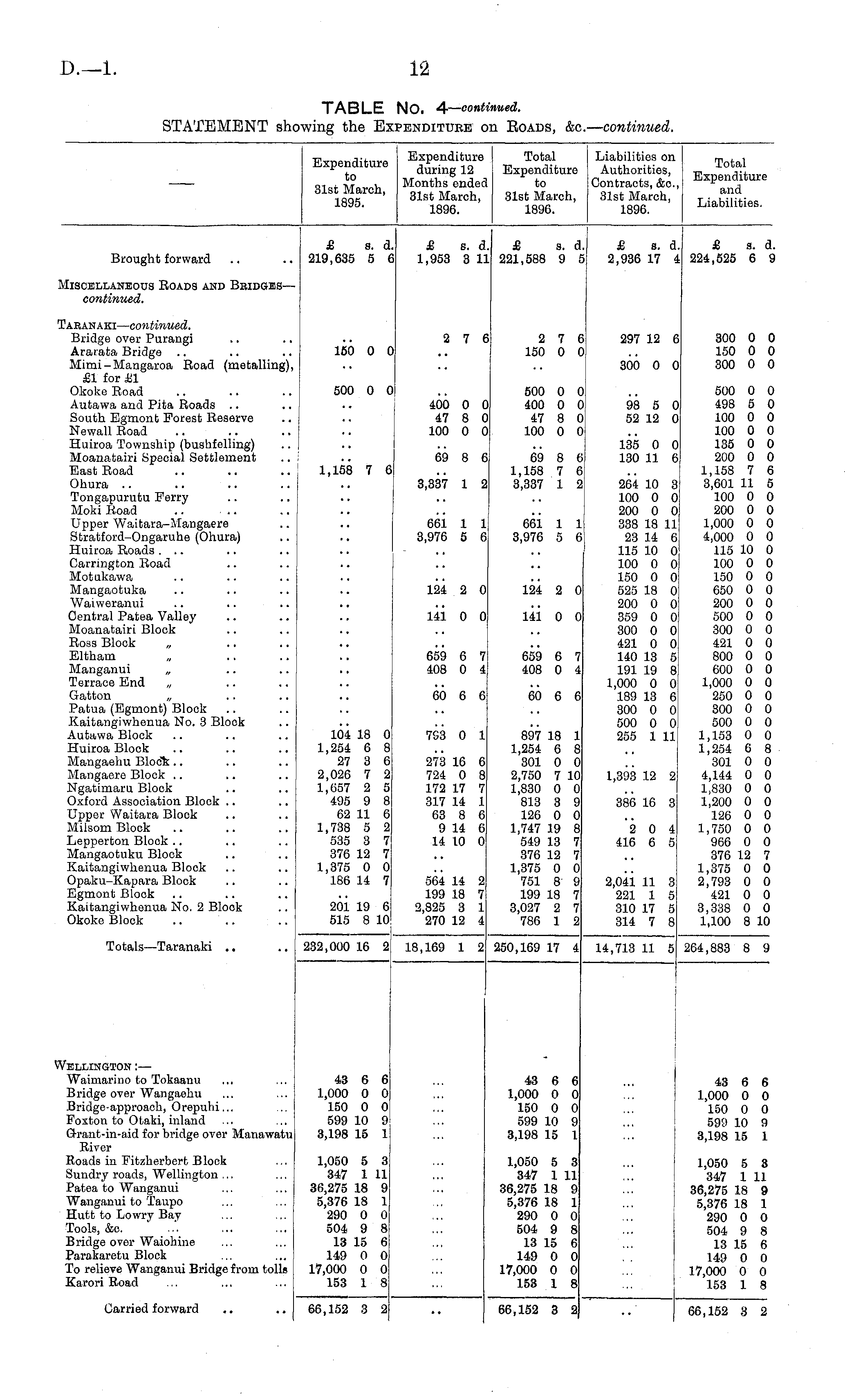 Expenditure to 31st March, 1895. Expenditure during 12 Months ended 31st March, 1896. Total Expenditure to 31st March, 1896. Liabilities on Authorities, Contracts, &c, 31st March, 1896. Total Expenditure and Liabilities. Brought forward £ s. d. 219,635 5 6 £ s. d. 1,953 3 11 £ s. d. 221,588 9 5 £ s. d. 2,936 17 4 £ s. d. 224,525 6 9 Miscellaneous Roads and Bridges— continued. Taeanaki— continued. Bridge over Purangi Ararata Bridge Mimi-Mangaroa Road (metalling), £1 for £1 Okoke Road Autawa and Pita Roads South Egmont Forest Reserve Newall Road Huiroa Township (bushfelling) Moanatairi Special Settlement East Road Ohura Tongapurutu Ferry Moki Road Upper Waitara-Mangaere Stratford-Ongaruhe (Ohura) Huiroa Roads ... Carrington Road Motukawa Mangaotuka Waiweranui Central Patea Valley Moanatairi Block Ross Block „ Eltham Manganui „ Terrace End „ Gatton „ Patua (Egmont) Block Kaitangiwhenua No. 3 Block Autawa Block Huiroa Block Mangaehu Block Mangaere Block Ngatimaru Block Oxford Association Block Upper Waitara Block Milsom Block Lepperton Block Mangaotuku Block Kaitangiwhenua Block Opaku-Kapara Block Egmont Block Kaitangiwhenua No. 2 Blook Okoke Block 150 0 0 2 7 6 2 7 6 150 0 0 297 12 6 300 0 0 150 0 0 300 0 0 300 0 0 500 0 0 400 0 0 47 8 0 100 0 0 500 0 0 400 0 0 47 8 0 100 0 0 98 5 0 52 12 0 500 0 0 498 5 0 100 0 0 100 0 0 135 0 0 200 0 0 1,158 7 6 3,601 11 5 100 0 0 200 0 0 1,000 0 0 4,000 0 0 115 10 0 100 0 0 150 0 0 650 0 0 200 0 0 500 0 0 300 0 0 421 0 0 800 0 0 600 0 0 1,000 0 0 250 0 0 300 0 0 500 0 0 1,153 0 0 1,254 6 8 301 0 0 4,144 0 0 1,830 0 0 1,200 0 0 126 0 0 1,750 0 0 966 0 0 376 12 7 1,375 0 0 2,793 0 0 421 0 0 3,338 0 0 1,100 8 10 69 8 6 69 8 6 1 1,158 7 6 3,337 1 2 135 0 0 130 11 6 1,158 7 6 3,337 1 2 264 10 3 100 0 0 200 0 0 338 18 11 23 14 6 115 10 0 100 0 0 150 0 0 525 18 0 200 0 0 359 0 0 300 0 0 421 0 0 140 13 5 191 19 8 1,000 0 0 189 13 6 300 0 0 500 0 0 255 1 11 661 1 1 3,976 5 6 661 1 l! 3,976 5 61 124 2 0 124 2 0 141 0 0 141 0 0 659 6 7 408 0 4 659 6 7 408 0 4 60 6 6 60 6 6 104 18 0 1,254 6 8 27 3 6 2,026 7 2 1,657 2 5 495 9 8 62 11 6 1,738 5 2 535 3 7 376 12 7 1,375 0 0 186 14 7 7S3 0 1 273 16 6 724 0 8 172 17 7 317 14 1 63 8 6 9 14 6 14 10 0 897 18 1 1,254 6 8 301 0 0 2,750 7 10 1,830 0 0 813 3 9 126 0 0 1,747 19 8 549 13 7 376 12 7 1,375 0 0 751 8 9 199 18 7 3,027 2 7 786 1 2 1,393 12 2 386 16 3 *2 0 4 416 6 5 201 19 6 515 8 10 564 14 2 199 18 7 2,825 3 1 270 12 4 2,041 11 3 221 1 5 310 17 5 314 7 8 Totals—Taranaki 232,000 16 2. 18,169 1 2 250,169 17 4 14,713 11 5 264,883 8 9 Wellington ;— Waimarino to Tokaanu Bridge over Wangaehu Bridge-approach, Orepuhi... Foxton to Otaki, inland Grant-in-aid for bridge over Manawatu River Roads in Fitzherbert Block Sundry roads, Wellington ... Patea to Wanganui Wanganui to Taupo Hutt to Lowry Bay Tools, &c. Bridge over Waiohine Parakaretu Block To relieve Wanganui Bridge from tolls Karori Road 43 6 6 1,000 0 0 150 0 0 599 10 9 3,198 15 1 1,050 5 3 347 1 11 36,275 18 9 5,376 18 1 290 0 0 504 9 8 13 15 6 149 0 0 17,000 0 0 153 1 8 43 6 6 1,000 0 0 150 0 0 599 10 9 3,198 15 1 1,050 5 3 347 1 11 36,275 18 9 5,376 18 1 290 0 0 504 9 8 13 15 6 149 0 0 17,000 0 0 153 1 8 43 6 6 1,000 0 0 150 0 0 599 10 9 3,198 15 1 1,050 5 3 347 1 11 36,275 18 9 5,376 18 1 290 0 0 504 9 8 13 15 6 149 0 0 17,000 0 0 153 1 8 Carried forward 66,152 3 2 66,152 3 2 66 152 3 2