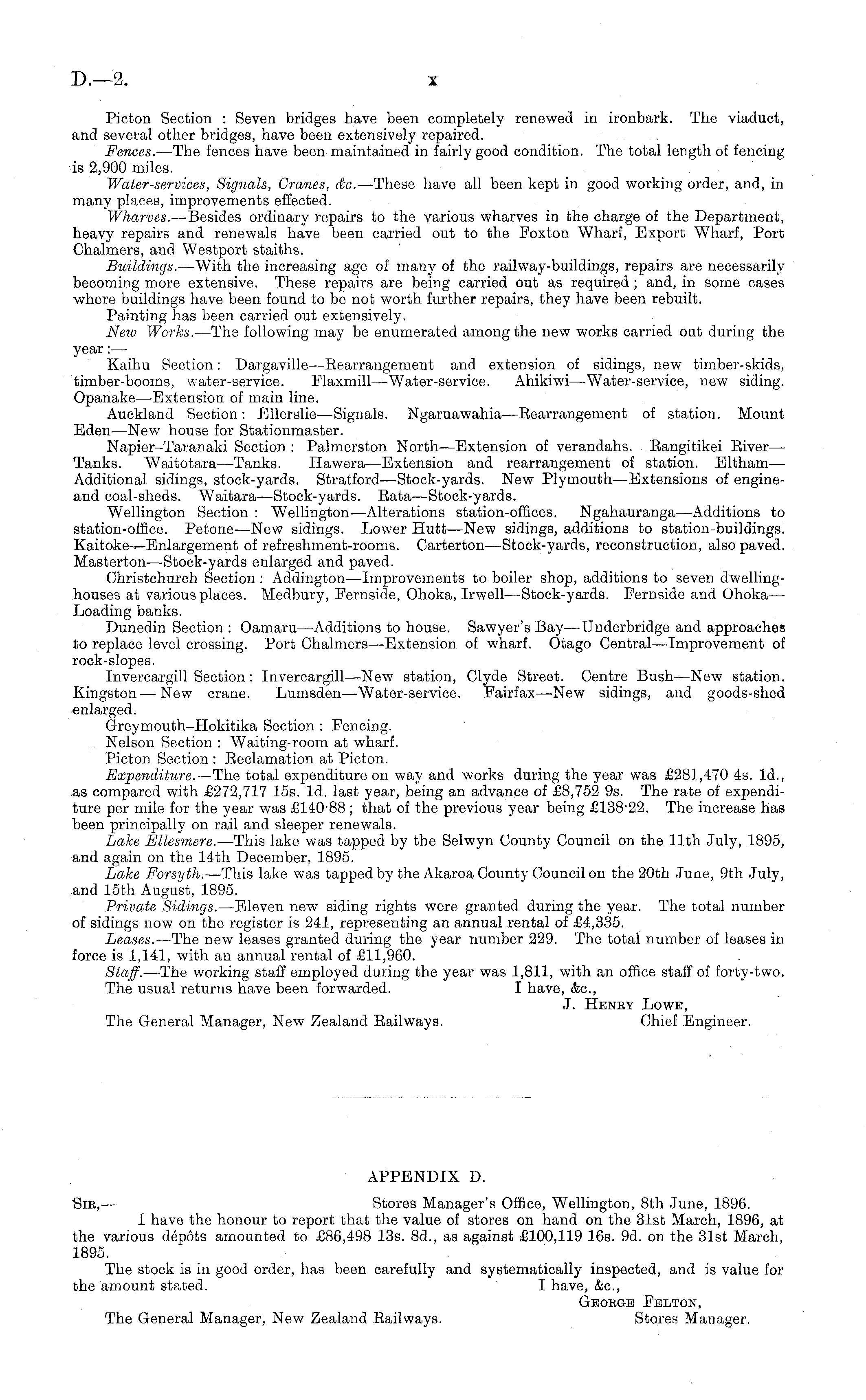 APPENDIX D. Sir, — Stores Manager's Office, Wellington, Bth June, 1896. I have the honour to report that the value of stores on hand on the 31st March, 1896, at the various depots amounted to £86,498 13s. Bd., as against £100,119 16s. 9d. on the 31st March, 1895. The stock is in good order, has been carefully and systematically inspected, and is value for the amount stated. I have, &c, George Eelton, The General Manager, New Zealand Eailways. Stores Manager.