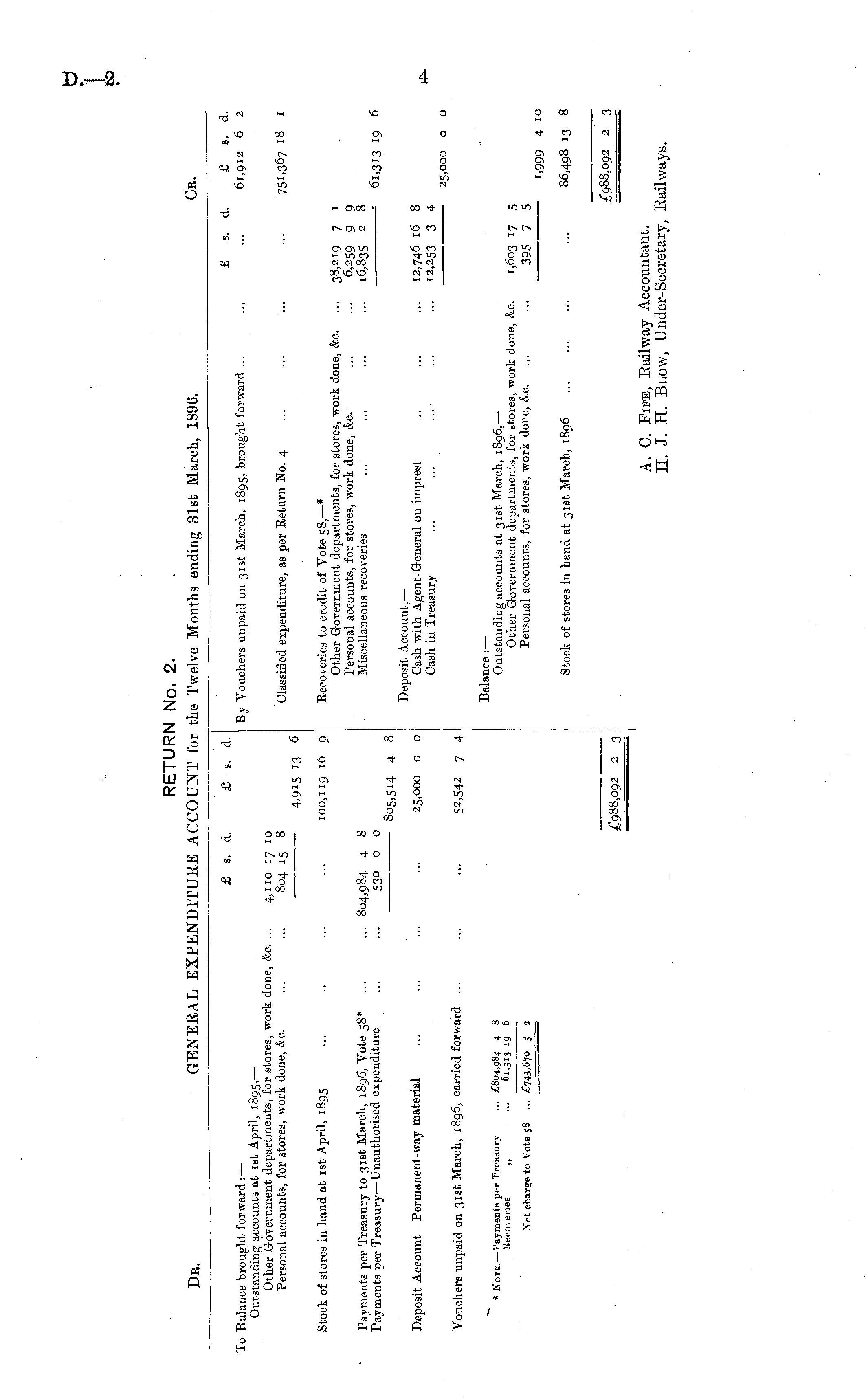 RETURN No. 2. Dr. GENEEAL EXPENDITUEE ACCOUNT for the Twelve Months ending 31st March, 1896. Cr. £ s. d. £ s. d. £ s. d. £ s. d. To Balance brought forward:— By Vouchers unpaid on 31st March, 1895, brought forward ... ... ... 61,912 6 2 Outstanding accounts at ist April, 1895,— Other Government departments, for stores, work done, &c. ... 4,110 17 10 Personal accounts, for stores, work done, &c. ... ... 804 15 8 Classified expenditure, as per Return No. 4 ... ... ... ... 75 I >3°*7 18 1 4,9 iS 13 6 Stock of stores in hand at ist April, 1895 ... .. ... ... 100,119 16 9 Recoveries to credit of Vote 58,— * Other Government departments, for stores, work done, &c. ... 38,219 7 1 Personal accounts, for stores, work done, &c. ... ... 6,259 9 9 Payments per Treasury to 31st March, 1896, Vote 58* ... ... 804,984 4 8 Miscellaneous recoveries ... ... ... ... 16,835 2 8 Payments per Treasury—Unauthorised expenditure ... ... 530 oo ! 61,313 19 6 805,514 4 8 Deposit Account,— Deposit Account—Permanent-way material ... ... ... ... 25,000 o o Cash with Agent-General on imprest ... ... ... 12,746 16 8 Cash in Treasury ... ... ... ... ... 12,253 3 4 25,000 o o Vouchers unpaid on 31st March, 1896, carried forward ... ... ... 52,542 7 4 Balance :— * Note.— Payments per Treasury ... £804,984 4 8 Outstanding accounts at 31st March, 1896,— Recoveries „ ... 61,313 19 6 Other Government departments, for stores, work done, &c. 1,60317 5 Net charge to Vote 58 ...£743,670 $ 2 Personal accounts, for stores, work done, &c. ... ... 395 7 5 " 1.999 4 10 Stock of stores in hand at 31st March, 1896 ... 86,49813 8 /q88,092 2 3 £988,092 2 3 y J A. C. Fife, Eailway Accountant. H. J. H. Blow, Under-Secretary, Eailways.