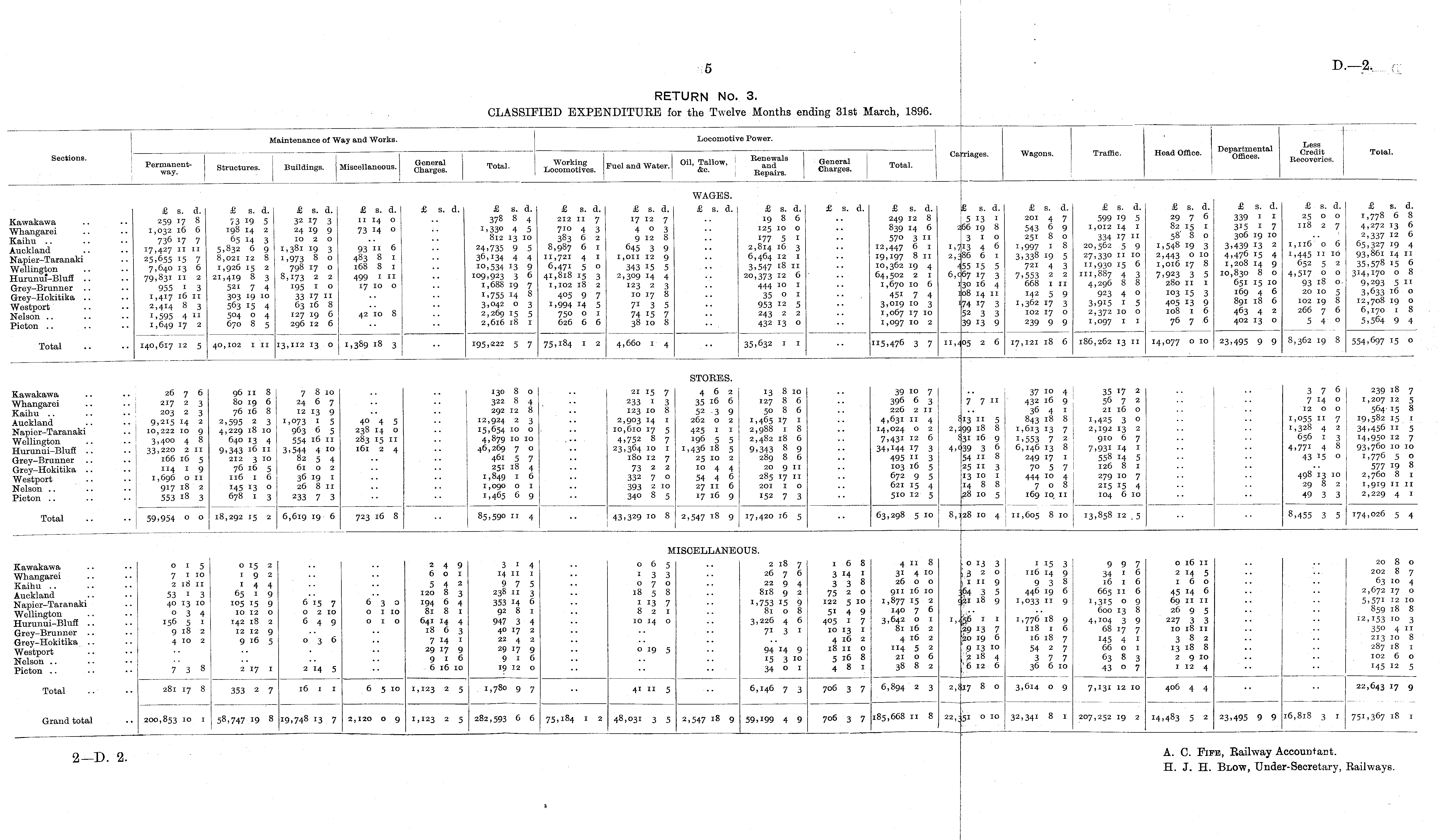 j Permanentway. Structures. Maintenance ol Way and Works. Buildings. Miscellaneous. General Charges. Total. LoSrfe, j Fuel and Water, j OU, Tallow, Locomotive Power. Eenewals and Repairs. General Charges. Total. Ca:iages. Wagons. Traffic. Head Office. I Dep J^ e q ntal Credit Offices. Recoveries. I . Total. Sections. WAGES. Kawakawa Whangarei Kaihu Auckland Napier-Taranaki Wellington Hurunui-BIuff .. Grey-Brunner .. Grey-Hokitika .. Westport Nelson Picton £ s. d. 259 17 8 1,032 16 6 736 17 7 17,427 11 n 25,655 15 7 7,640 13 6 79,831 11 2 955 1 3 1,417 16 11 2,414 8 3 i,595 4 11 1,649 17 2 £ s. d. 73 19 5 198 14 2 65 14 3 5,832 6 9 8,021 12 8 1,926 15 2 21,419 8 3 52i 7 4 303 19 10 563 15 4 504 o 4 670 8 5 £ s. d. 32 17 3 24 19 9 10 2 o 1,381 19 3 i,973 8 o 798 17 o 8,173 2 2 195 1 o 33 17 11 63 16 8 127 19 6 2g6 12 6 £ s. d. 11 14 o 73 14 ° 93 11 6 483 8 1 168 8 1 499 1 11 17 10 o £ s. d. £ s. d. 378 8 4 1,330 4 5 812 13 10 24,735 9 5 36,134 4 4 io,534 13 9 109,923 3 6 1,688 19 7 1,755 14 8 3,042 o 3 2,269 15 5 2,616 18 1 £ s. d. 212 11 7 7io 4 3 383 6 2 8,987 6 1 11,721 4 1 6,471 5 o 41,818 15 3 1,102 18 2 405 9 7 1,994 14 5 750 o 1 626 6 6 £ s. d. 17 12 7 403 9 12 8 645 3 9 1,011 12 9 343 15 5 2,309 14 4 123 2 3 10 17 8 71 3 5 74 15 7 38 10 8 £ s. d. £ s. d. 19 8 6 125 10 o 177 5 1 2,814 16 3 6,464 12 1 3,547 18 11 20,373 12 6 444 10 1 35 o 1 953 12 5 243 2 2 432 13 o £ s. d. £ s. d. 249 12 8 839 14 6 570 3 11 12,447 6 1 19,197 8 11 10,362 19 4 64,502 2 1 1,670 10 6 45i 7 4 3,019 10 3 1,067 17 10 1,097 I0 2 1, 2, 1 s. d. 5 13 1 ;66 19 8 310 '13 4 6 j86 6 1 ;55 15 5 '67 17 3 3° 16 4 :o8 14 n 74 17 3 52 3 3 39 13 9 £ s. d. 201 4 7 543 6 9 251 8 o 1,997 1 8 3,338 19 5 721 4 3 7,553 2 2 668 1 n 142 5 9 1,362 17 3 102 17 o 239 9 9 £ s. d. 599 19 5 1,012 14 1 334 17 11 20,562 5 9 27,330 11 10 11,930 15 6 111,887 4 3 4,296 8 8 923 4 o 3,915 1 5 2,372 10 o 1,097 1 1 £ s. d. 29 7 6 82 15 1 58' 8 o 1,548 19 3 2,443 ° IO 1,016 17 8 7,923 3 5 280 n 1 103 15 3 405 13 9 108 1 6 76 7 6 £ s. d. 339 1 1 3i5 1 7 306 19 10 3,439 13 2 4,476 15 4 1,208 14 9 10,830 8 o 651 15 10 169 4 6 891 18 6 463 4 2 402 13 o £ s. d. 25 o o 118 2 7 1,116 o 6 i,445 11 10 652 5 2 4,517 o o 93 18 o. 20 10 5 102 19 8 266 7 6 540 £ s. d. 1,778 6 8 4,272 13 6 2,337 12 6 65,327 19 4 93,861 14 11 35,578 15 6 314,170 o 8 9,293 5 11 3,633 16 o 12,708 19 o 6,170 1 8 5,564 9 4 6, 42 10 8 Total 140,617 12 5 [05 2 6 17,121 18 6 186,262 13 n 23,495 9 9 8,362 19 8 554,697 15 o 40,102 1 n 13,112 13 o 1,389 18 3 195,222 5 7 75,184 1 2 4,660 1 4 35,632 1 1 H5,476 3 7 n, 14,077 o 10 STORES. Kawakawa Whangarei Kaihu Auckland Napier-T aranaki Wellington Hurunui-BIuff .. Grey-Brunner Grey-Hokitika .. Westport Nelson Picton .. .. 26 7 6 217 2 3 203 2 3 9,215 14 2 10,222 10 9 3,400 4 8 33,220 2 n 166 16 5 114 1 9 1,696 on 917 18 2 553 18 3 96 n 8 80 19 6 76 16 8 2,595 2 3 4,229 18 10 640 13 4 9,343 16 11 212 3 10 76 16 5 116 1 6 145 13 o 678 1 3 7 8 10 24 6 7 12 13 9 1,073 1 5 963 6 5 554 16 n 3,544 4 10 82 5 4 61 o 2 36 19 1 26 8 11 233 7 3 40 4 5 238 14 o 283 15 n 161 2 4 130 8 o 322 8 4 292 12 8 12,924 2 3 15,654 10 o 4,879 10 10 46,269 7 o 461 5 7 251 18 4 1,849 1 6 1,ogo o 1 1,465 6 9 21 15 7 233 1 3 123 10 8 2,903 14 1 10,610 17 5 4,752 8 7 23,364 10 1 180 12 7 73 2 2 332 7 o 393 2 10 340 8 5 462 35 16 6 52 3 9 262 o 2 425 1 1 196 5 5 1,436 18 5 25 10 2 10 4 4 54 4 6 27 n 6 17 16 9 13 8 10 127 8 6 50 8 6 1,465 17 1 2,988 1 8 2,482 18 6 9,343 8 9 289 8 6 20 9 11 285 17 n 201 1 o 39 10 7 396 6 3 226 2 11 4,631 11 4 14,024 o 2 7,431 12 6 34, M4 J 7 3 495 11 3 103 16 5 672 9 5 621 15 4 510 12 5 2, 37 10 4 7 7 11 432 16 9 36 4 1 13 n 5 843 18 8 >99 18 8 j 1,613 r 3 7 i (31 16 9 ] i,553 7 2 j >39 3 6 6,146 13 8 54 n 8 249 17 1 65 11 3 j 70 5 7 ! ;i3 10 1 : 444 10 4 1 14 8 8 708 28 10 5 ] 169 10 n 35 17 2 56 7 2 21 16 o 1,425 3 o 2,192 13 2 910 6 7 7,931 14 1 558 14 5 126 8 1 279 10 7 215 15 4 104 6 10 3 7 6 7 14 o 12 o o 1,055 11 7 1,328 4 2 656 1 3 4,771 4 8 43 15 o 239 18 7 1,207 12 5 564 15 8 19,582 15 1 34,456 11 5 14,950 12 7 93,760 10 10 1,776 5 o 577 19 8 2,760 8 1 1,919 11 11 2,229 4 ! 4. 498 13 10 29 8 2 49 3 3 152 7 3 •• j 59,954 ° ° 85,590 11 4 43,329 10 8 2,547 18 9 17,420 16 5 63,298 5 10 8, (28 10 4 ; 11,605 8 10 13,858 12 5 8,455 3 5 174,026 5 4 Total 18,292 15 2 6,619 19 6 723 16 8 ISCELLANE' •US. Kawakawa Whangarei Kaihu Auckland Napier-Taran aki Wellington Hurunui-BIuff .. Grey-Brunner .. Grey-Hokitika .. Westport Nelson Picton o 1 5 7 1 10 2 18 n 53 1 3 40 13 10 034 156 5 1 9 18 2 4 10 2 0 15 2 192 1 4 4 65 1 9 105 15 9 10 12 o 142 18 2 12 12 9 9 16 5 6 15 7 o 2 10 649 630 O I 10 010 249 601 5 4 2 120 8 3 194 6 4 81 8 1 641 14 4 18 6 3 7 14 1 29 17 9 916 6 16 10 3 1 4 14 11 1 9 7 5 238 n 3 353 14 6 92 8 1 947 3 4 40 17 2 22 4 2 29 17 9 916 19 12 o 065 i 3 3 070 18 5 8 1 13 7 8 2 1 2 18 7 26 7 6 22 9 4 818 9 2 i,753 15 9 81 o 8 3,226 4 6 71 3 1 1 6 8 3 14 1 3 3 8 75 2 o 122 5 10 51 4 9 405 1 7 10 13 1 4 16 2 18 11 o 5 16 8 4 8 1 4 11 8 31 4 10 26 o o 911 16 10 1,877 15 2 140 7 6 3,642 o 1 81 16 2 4 16 2 II 4 5 2 21 o 6 38 8 2 ° 13 3 320 1 11 9 364 3 5 )2I 18 9 1 15 3 116 14 9 9 3 8 446 19 6 1,033 11 9 9 9 7 34 1 6 16 1 6 665 n 6 1,315 o 9 600 13 8 4,104 3 9 68 17 7 145 4 1 66 o 1 63 8 3 43 o 7 o 16 11 2 14 5 160 45 14 6 69 n n 26 9 5 227 3 3 10 18 11 382 13 18 8 2 9 IO I 12 4 20 8 o 202 8 7 63 10 4 2,672 17 o 5,571 12 10 859 18 8 12,153 10 3 350 4 n 213 10 8 287 18 1 102 6 o 145 12 5 036 10 14 o o 19 5 1, 56 I I 29 13 7 20 19 6 9 13 10 2 18 4 6 12 6 1,776 18 9 118 1 6 16 18 7 54 2 7 3 7 7 36 6 10 94 14 9 15 3 10 34 o 1 7 3 8 2 17 I 2 14 5 Total 281 17 8 353 2 7 16 1 1 6 5 10 1,123 2 5 1,780 9 7 41 11 5 6,146 7 3 706 3 7 6,894 2 3 2, 780 3,614 o 9 7,131 12 10 406 4 4 22,643 17 9 Grand total 282 ,593 6 6 706 3 7 185,668 11 8 151 O 10 32,34i 8 1 207,252 19 2 14,483 5 2 23,495 9 9 16,818 3 1 751,367 18 1 200,853 10 1 58,747 19 8 19,748 13 7 2,120 o 9 1,123 2 5 75,184 1 2 4 8 ,03i 3 5 2,547 i 8 9 59,199