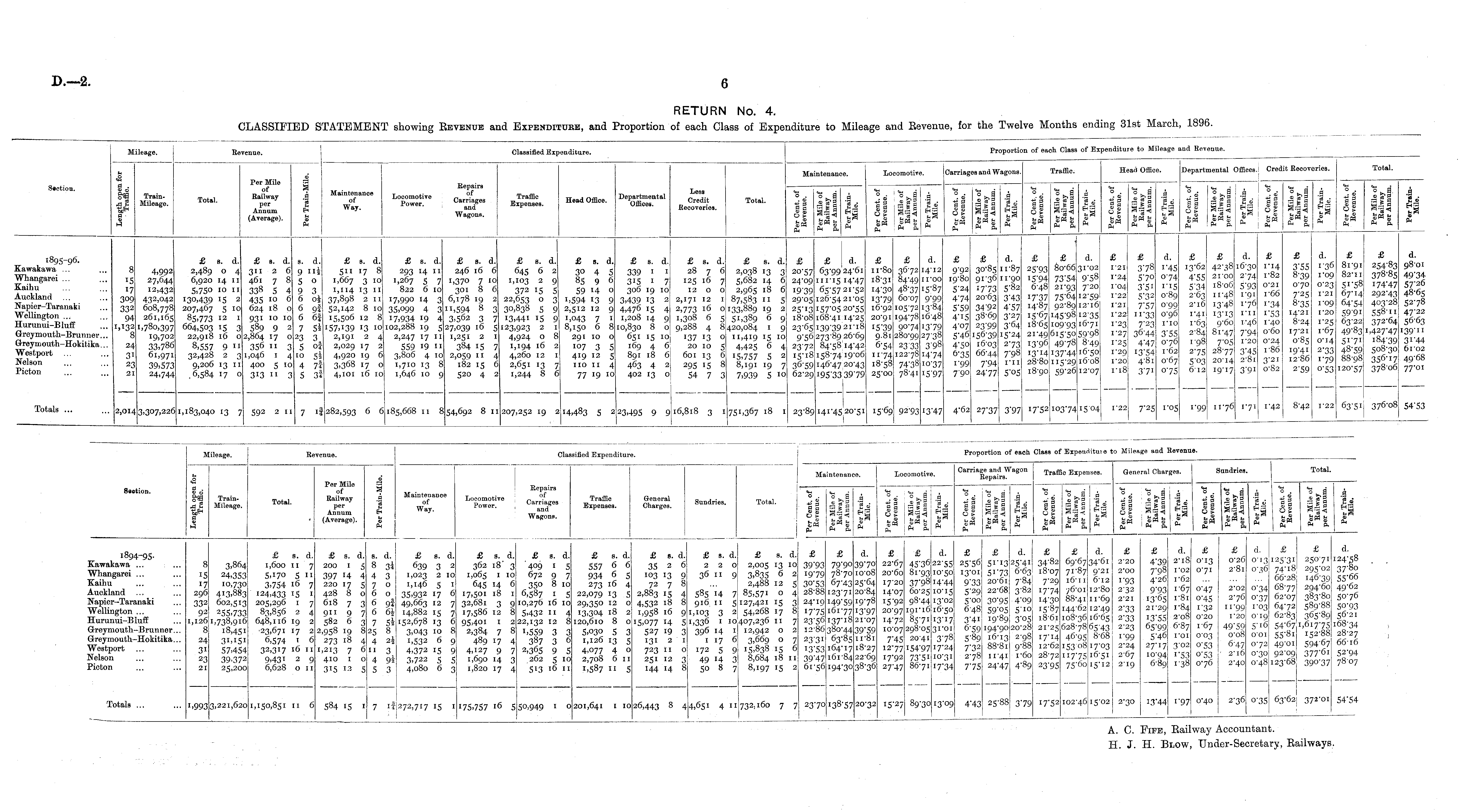 RETURN No. 4. CLASSIFIED STATEMENT showing Revenue and Expenditure, and Proportion of each Class of Expenditure to Mileage and Eevenue, for the Twelve Months ending 31st March, 1896.