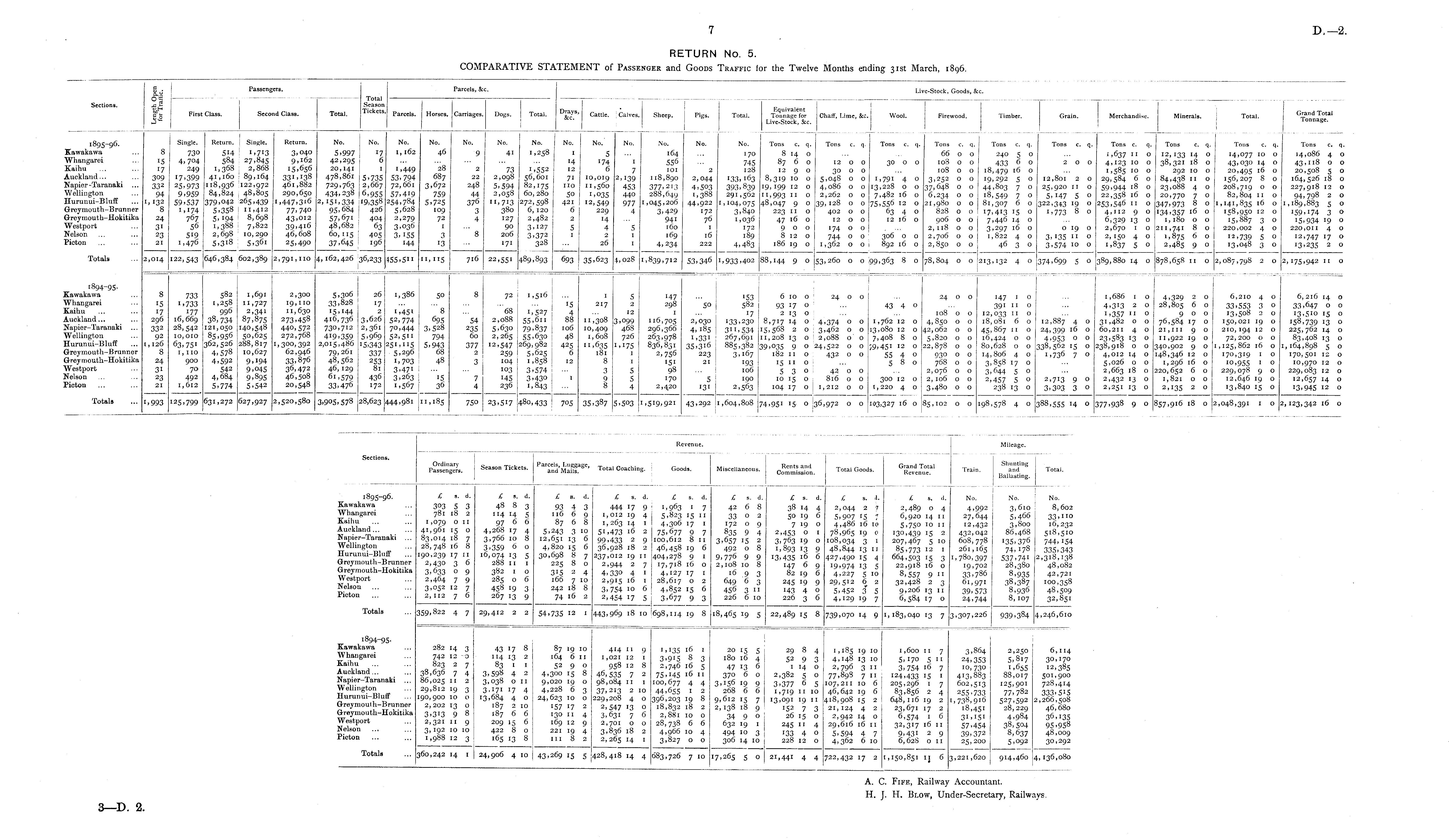 Sections. a Si? First Class. Passengc Secor :rs. id Class. Total, Total Season Tickets. Parcels. Horses. Parcels, &c. Carriages. Dogs. \ Total. I Drays, &c. Cattle. ; Calves. Sheep. 1 Pigs. Equivalent Tonnage for Chaff, Lime, &.:. Wool. Live-Stock, &c. I Liv. :-Stock, Goods, &x. 'limber. Grain. Merchandise. Minerals. Total. Grand Total Tonnage. Total. Firewood. No. L . I 1895-96. Kawakawa Whangarei Kaihu Auckland... Napier-Taranaki ... Wellington Hurunui-BIuff Greymouth-Brunner Greymouth-Hokitika Westport Nelson Picton 8 15 17 309 332 94 1, 132 8 Single. 730 4,704 249 17.399 25.973 9.959 59.537 1.174 767 56 5i9 1,476 Return. Single. 514 : 1.713 584 27,845 1,368 2,868 41,160 : 89,164 118,936 122,972 84,824 I 48,805 379,042 265,439 5.358 , 11,412 5, 194 ; 8,698 1,388 i 7,822 2,698 10,290 5,318 5,361 Return. 3.040 9,162 15.656 331.138 461,882 290,650 1,447,316 77. 740 43,012 39.416 46, 608 25,490 No. 5.997 42,295 20,141 478,861 729,763 434.238 2,i5i,334 95.684 57.671 48,682 60,115 37,645 No. 17 6 1 S.73S 2,667 6,955 19,358 426 404 63 405 196 No. I, 162 i,449 53,794 72,661 57,419 254.784 5.628 2,279 3.036 3.155 144 No. 46 28 687 3.672 759 5.725 109 72 No. 9 2 22 248 44 376 3 4 No. 41 73 2,098 5,594 2,058 ".713 380 127 90 206 No. 1,258 1.552 56,601 82,175 60, 280 272,598 6,120 2,482 3,127 3-372 328 No. I 14 12 71 no So 421 6 2 5 1 No." 5 174 6 10,019 11,560 1.035 12,549 229 14 4 2 26 No. I 7 2.139 453 440 977 4 No. 164 556 101 118,890 377.213 288,649 1,045,206 3,429 94i 160 169 4.234 No. 2 2,044 4,503 1,388 44,922 172 76 I 16 170 745 128 133.163 393,839 291,562 1,104,075 3.840 1.036 172 189 4.483 Tons c. q. Tons c. q. Tons c. q. 8 14 O 87 6 o 12 O 0 30 O O 12 9 O 30 O 0 8,319 10 o 5,048 o o 1,791 4 O 19,199 12 O 4,086 O O 13,228 O O H.993 11 o 2,262 0 o 7,482 16 0 48,047 9 o 39,128 o 0 75,556 12 o 223 11 o 402 00 63 4 o 47 16 o 12 o 0 12 16 o 900 17400! , ... 8 12 o 744 o 0 306 o o 186 19 o 1,362 o o . 892 16 o Tons c. q. 66 o o 108 o o 108 o o 3.252 o o 37,648 0 0 6,234 o o 21,980 o o 828 o o 906 o o 2, Il8 O O 2,706 o o 2,850 o o Tons c. q. 240 5 O 433 6 0 18,479 16 o 19,292 5 o 44,803 7 o 18,549 7 o 81,307 6 o 17.413 15 o 7,446 14 o 3,297 16 o 1,822 4 o 46 3 o Tons c. q. ) 1 2 0 0 1 1 I2,8oi 2 O 25,920 II O 5.147 5 o 322,343 19 o 1,773 8 o o 19 o 3.135 11 o 3,574 10 o Tons c. q. Tons c. q. Tons c. q. 1,637 11 o 12,133 14 O 14,077 10 O 4,123 10 o 38,321 18 o 43,030 14 O 1,585 10 o 292 10 o 20,495 16 O 29,584 6 o 84,438 11 o 156,207 8 o 59,944 18 o 23,088 4 o 208,719 o o 22,358 16 o 20,770 7 o 82,804 11 o 253.546 n o 347.973 8 o 1,141,835 16 o 4,112 9 O 134,357 l6 O 158,950 12 0 6,329 13 o 1,180 o o 15,887 3 O 2,670 1 o 211,741 8 o 220,002 4 0 2,150 40 1,875 6 o 12,739 5 o 1,837 5 o 2,485 9 o 13,048 3 o Tons c. q. I4,086 4 O 43,118 O O 20,508 5 O 164,526 18 O 227,918 12 O 94,798 2 O 1,189,883 5 O 159-174 3 o 15,934 19 O 220,011 4 O 12,747 17 o 13,235 2 O 24 31 23 21 1 3 13 5 1 1 8 171 222 Totals ;2,0I4 122,543 646,384 ,602,389 2,791, no 4,162,426 36,233 455.51 1 II.115 716 22,551 489.893 693 35.623 4,028 1,839,712 53,346 1,933,402 88,144 9 o 53,260 o 0 19,363 8 o 78,804 o o 213,13a 4 o 374,699 s o 389,880 14 o 878,658 II o 2,087,798 2 O 2,175,942 II O 1894-95. Kawakawa Whangarei Kaihu Auckland... Napier-Taranaki Wellington Hurunui-BIuff Greymouth- Brunner Grey mouth-Hokitika Westport Nelson Picton 8 15 17 296 332 92 1,126 8 733 1.733 177 16,669 28,542 10,010 63,75i 1, no 582 1.258 996 38, 734 121,050 85.956 362,526 4. 578 4.592 542 4,684 5,774 1,691 11,727 2,341 87,875 140,548 50,625 288,817 10,627 9,194 9.045 9.895 5-542 2,300 19,110 11,630 273.458 440,572 272,768 1,300,392 62,946 33.876 36,472 46,508 20,548 5,3o6 33,828 15.144 416,736 730,712 419.359 2,015,486 79,261 48,562 46,129 6i.S79 33.476 26 17 2 3,626 2, 361 5.969 15,343 337 253 81 436 172 1,386 i,45i 52,774 70,444 52,5" 251,115 5,296 1,703 3.471 3.263 1.S67 So 8 6 9S 3.528 794 5.943 68 48 8 54 235 60 72 ' 68 2,088 5.630 2,265 12,547 259 104 103 145 236 1,516 1,527 55.611 79.837 55.630 269,982 5.625 1.858 3-574 3.430 1.843 15 4 88 106 48 425 6 12 1 217 11,308 10,409 1,608 ",63s 181 8 5 2 12 3.099 468 726 1.175 1 147 298 1 "6,705 296,366 263,978 836,851 2,756 151 98 170 2,420 50 2,030 4,185 i,33i 35.3i6 223 21 153 582 17 133.230 3II.534 267,691 885,382 3.167 193 106 6 10 o 24 o o 93 T 7 o 2 13 o 8,717 14 o 4,374 o o IS,568 2 O ; 3,462 O O II,208 13 O ! 2,088 O O 39,035 9 o 24,522 O O 182 11 o 432 o o 15 II O.J 5 3 o 42. o o 10 15 o 816 o 0 104 17 o I I, 212 o o I I 43 4 o 1,762 12 o 13,080 12 o 7,408 8 o 59.451 12 o 55 4 o 580 24 0 o 108 o o 4,850 o o 42,062 o o 5,820 o o 22,878 o o 930 o o 768 o o 2,076 o o 2,106 O O 3,480 o o 147 I o 391 II o 12,033 II o 18,081 6 o 45,867 II o 16,424 o o 80,628 0 o 14,806 4 o 3,858 17 o 3.644 5 o 2,457 S o 238 13 o 12,887 4 o 24.399 16 o 4-953 o o 338.562 15 o 1,736 7 o 1,686 1 o 4,3 r 3 2 o 1,357 11 o 31,482 o o 60,21 I 4 O 23.583 13 o 238,918 O o 4,012 14 o 5,026 o o 2,663 18 o 2,432 13 o 2,251 13 o 4,329 2 O 28,805 6 o 900 76,584 17 o 21 , I 11 9 o 11,922 19 o 340,902 9 o 148,346 12 O 1,296 16 o 220,652 6 o 1,821 o o 2,135 2 O 6,210 4 o 33.553 3 o 13,508 2 O 150,021 19 o 2IO,194 12 O 72,200 O O 1,125,862 16 o 170,319 I o 10,955 I o 229,078 9 o 12,646 19 o 13,840 15 o 6,216 14 o 33,647 o o 13,510 15 o 158,739 13 o 225,762 14 O 83,408 13 o 1,164,898 5 o 170,501 12 o 10,970 12 o 229,083 12 O 12,657 14 o 13,945 12 O 377 2 24 3i 23 21 900 70 492 1,612 3 1 15 36 7 4 1 3 9 8 5 5 4 5 '3i 190 2,563 300 12 o 1,220 4 o 2,713 9 o 3.303 3 o Totals 631,272 627,927 2,520,580 3.905.578 28,623 444,981 ' j 23,517 480,433 ! 705 35,387 5,503 1,519,921 43,292 1,604,808 74,951 15 o 136,972 o o 103,327 16 o 85,102 o o 198 1.993 125,799 11.185 750 23.517 198.578 4 o 388,555 14 388,555 14 o o j: 377.938 9 o 857,916 18 o [2,048,391 I o 2,123,342 16 o Sections. Ordinary Passengers. Revenue. Season Tickets. *"$&£$!*• Total Coaching. I Goods. Miscellaneous. £££££, . Total Goods. Train. Mileage. Shunting i. arid Ball