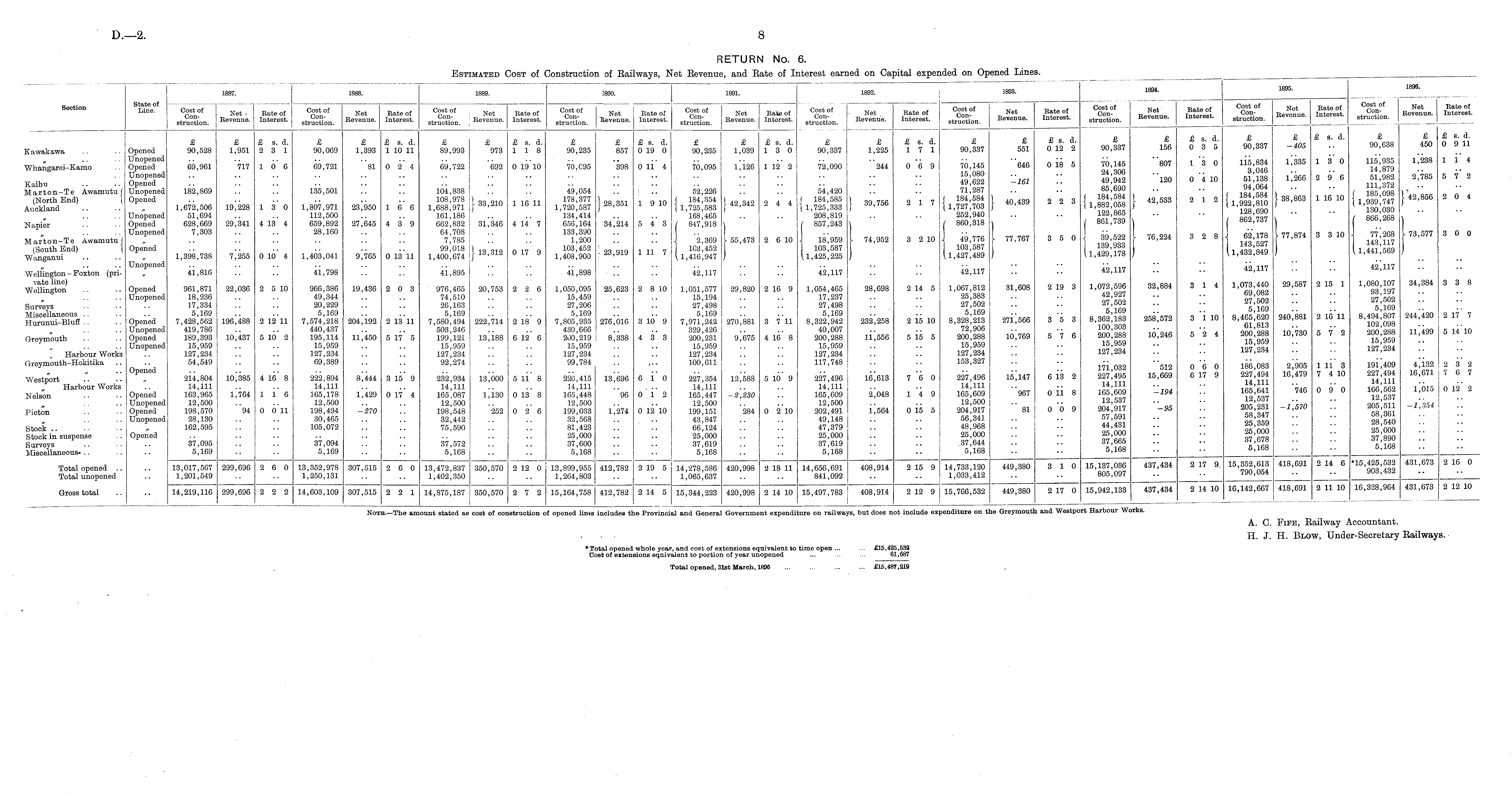 State of Line. 1887. C Vr% 0t Net ' Bate of struction. Eevenue. Interest. 1887. 1894. 1895. 1896. 1888. 1889. 1890. 1891. 1892. 1893. Section Net Rate of Revenue. Interest. Cost of Net Eate 0{ , < - j0n ." Revenue. Interest, struction. Cost of Construction. Net Revenue. Rate of Interest. C Con° f Net Eate of struotion. Ee venue. Interest. Cost of Construction. Net Rate of Revenue. Interest. C Con 0t Net Eate of struction. Avenue. Interest. Cost of Construction. Net Bate of Revenue. Interest. Cost of Construction. Net Revenue. Rate of Interest. Cost of Construction. Net Revenue. Rate of Interest. Cost of Construction. £ 90,528 £ 1,951 £ s. d. 2 3 1 £ 90,069 £ 1,393 £ s. d. 1 10 11 £ 89,993 £ 973 £ s. d. 118 £ 90,235 £ 857 £ s. d. 0 19 0 £ 90,235 £ 1,039 £ s. d. 13 0 £ 90,337 £ 1,225 £ s. d. 17 1 £ 90,337 £ 551 £ s. d. 0 12 2 £ 90,337 £ 156 £ s. d. 0 3 5 £ 90,337 £ -405 £ s. d. £ 90,638 £ 450 £ s. d. 0 9 11 Kawakawa .. ... Whangarei-Kamo Opened Unopened Opened Unopened Opened Unopened Opened 69,961 717 10 6 69,721 81 0 2 4 69,722 *692 0 19 10 70,C95 398 0 11 4 70,095 1*126 1 12 2 72,090 *244 0 *6 9 70,145 15,080 49,622 71,287 I 184,584 (1,727,703 252,940 I 860,318 J 49,776 103,587 U, 427,489 *646 -161 0 18 5 70,145 24,306 49,942 85,690 j 184,584 | 1,882,058 122,865 I 861,739 J 39,522 139,933 [ 1,429,178 *807 120 1 *3 0 0 "i 10 115,834 3,046 51,138 94,064 f 184,584 | 1,922,810 128,690 ■ 862,737 62,178 143,527 1,432,849 1*335 1*266 13 0 2 9* 6 115,935 14,879 51,982 111,372 J 185,098 ( 1,939,747 130,030 r 866,268 J 77,268 143,117 1,1,441,569 1*238 21785 i i' 4 5 7* 2 Kaibu Marton-Te Awamutu/ (North End) ( Auckland 182,869 135,501 104,838 108,978 1,688,971 161,186 662,832 64,708 7,785 99,018 1,400,674 I 33,210 49,054 178,377 1,720,587 134,414 656,164 133,390 1,200 103,452 1,408,900 | 28,351 52,226 f 184,354 | 1,725,583 168,465 t 847,918 J 2,369 103,452 U, 416,947 I 42,342 54,420 ( 184,585 \ 1,725,333 208,819 (- 857,243 J 18|959 103,587 U,425,225 I 39,756 2 17 I 40,439 2 2 3 1 J 42,533 2 12 I 38,863 1 16 10 l 42,856 2 0 4 1,672,506 51,694 628,669 7,303 19,228 13 0 1,807,971 112,500 659,892 28,160 23,950 166 1 16 11 1 9 10 2 4 4 Napier Unopened Opened Unopened 29*341 4 13 4 27*645 4 39 31,346 4 14 7 34,214 5 4 3 L 55,473 1 74,952 ] ) 77,767 1 ) 76,224 • 77,874 3 3 10 I 73,577 3 0 0 Marton-Te Awamutu] (South End) 1 Wanganui 2 6 10 3 2 10 3 5 0 3 2 8 Opened 1,398,738 7,255 0 10* 4 1,403,041 9,765 0 18*11 j 13,312 0 17 9 1 11 7 • 23,919 Wellington - Poxton (private line) Wellington Unopened 41,816 41,798 41,895 41,898 42,117 42,117 42,117 42,117 42,117 42*117 Opened Unopened 961,871 18,236 17,334 5,169 7,428,562 419,786 189,393 15,959 127,234 54,549 22,036 2 5 10 966,386 49,344 20,229 5,169 7,574,218 440,437 195,114 15,959 127,234 69,389 19,436 2 0 3 20,753 2 2 6 1,050,095 15,459 27,206 5,169 7,805,935 430,666 200,219 15,959 127,234 99,784 25,623 2 8 10 29,820 2 16 9 1,054,465 17,237 27,498 5,169 8,322,942 40,007 200,288 15,959 127,234 117,748 28,698 2 14 5 1,067,812 25,383 27,502 5,169 8,328,213 72,906 200,288 15,959 127,234 153,327 31,608 2 19 3 1,072,596 42,927 27,502 5,169 8,362,183 100,303 200,288 15,959 127,234 32,884 3 1 4 1,073,440 69,082 27,502 5,169 8,465,620 61,813 200,288 15,959 127,234 29,587 2 15 1 1,080,107 93,197 27,502 5,169 8,494,807 102,098 200,288 15,959 127,234 34,384 3 3 8 Surveys Miscellaneous Hurunui-BIuff Opened Unopened Opened Unopened 196,488 2 12 11 204,192 2 13*11 976,465 74,510 26,163 5,169 7,580,494 503,246 199,121 15,959 127,234 92,274 222,714 2 18 9 276*016 3 10 9 1,051,577 15,194 27,498 5,169 7,971,242 329,426 200,231 15,959 127,234 100,611 270,881 3 7 11 232',258 2 15 10 271*566 3 5 3 258' 572 3 1 10 5 2 4 240,881 10,730 2 1611 5 7 2 244,420 11j 499 2 17 7 5 14 10 Greymouth 10*437 5 10 2 11,450 5 17- 5 13,188 6 12 6 8,338 4 3* 3 9,675 4 16 8 11*556 5 15 5 10,769 5 7 6 10,246 Harbour Works Greymouth-Hokitika *512 15,669 0 6 0 6 17 9 186,083 227,494 14,111 165,641 12,537 205,231 58,347 25,359 25,000 37,678 5,168 2,905 16,479 1 11 3 7 4 10 191,409 227,494 14,111 166,562 12,537 205,511 58,361 28,540 25,000 37,890 5,168 4*132 16,671 2 3 2 7 6 7 Westport Harbour Works Nelson P icton Opened Opened Unopened Opened Unopened 214,804 14,111 163,965 12,500 198,570 28,130 162,595 10|385 1*764 94 4 16 8 116 0 0 11 222,894 14,111 165,178 12,500 198,494 30,465 105,072 8,444 1,429 -270 3 15* 9 0 17* 4 232,934 14,111 165,087 12,500 198,548 32,442 75,590 13,000 1,130 252 5 11 8 0 13 8 0 2 6 226,415 14,111 165,448 12,500 199,033 32,568 81,423 25,000 37,600 5,168 13,696 **96 1,274 6 10 0 1* 2 0 12 10 227,354 14,111 165,447 12,500 199,151 43,847 66,124 25,000 37,619 5,168 12,588 -2,230 *284 5 10 9 0 210 227,496 14,111 165,609 12,500 202,491 49,148 47,379 25,000 37,619 5,168 16,613 21048 1*564 7 6 0 14 9 0 io 5 227,496 14,111 165,609 12,500 204,917 56,341 48,968 25,000 37,644 5,168 15*147 "967 81 6 13 2 0 11 8 0 0 9 171,032 227,495 14,111 165,609 12,537 204,917 57,591 44,431 25,000 37,665 5,168 -194 -95 *746 -1,570 0 9 0 1,015 -1,354 0 12 2 Stock Stock in suspense Surveys MiscellaneousOpened 37,095 5,169 37,094 5,169 37,572 5,168 Total opened Total unopened 13,017,567 1,201,549 299,696 2 6 0 13,352,978 1,250,131 307,515 2 6 0 13,472,837 1,402,350 350,570 2 12 0 13,899,955 1,264,803 412,782 2 19 5 14,278,586 1,065,637 420,998 2 18 11 14,656,691 841,092 408,914 2 15 9 14,733,120 1,033,412 449,380 3 10 15,137,036 805,097 437,434 2 17 9. 15,352,613 790,054 418,691 2 14 6 *15,425,532 903,432 431,673 2 16 0 Gross total 14,219,116 299,696 2 2 2 14,603,109 307,515 2 2 1 14,875,187 350,570 2 7 2 15,164,758 412,782 2 14 5 15,344,223 420,998 2 14 10 15,497,783 408,914 2 12 9 15,766,532 449,380 2 17 0 15,942,133 437,434 2 14 10 16,142,667 418,691 2 11 10 16,328,964 431,673 2 12 10