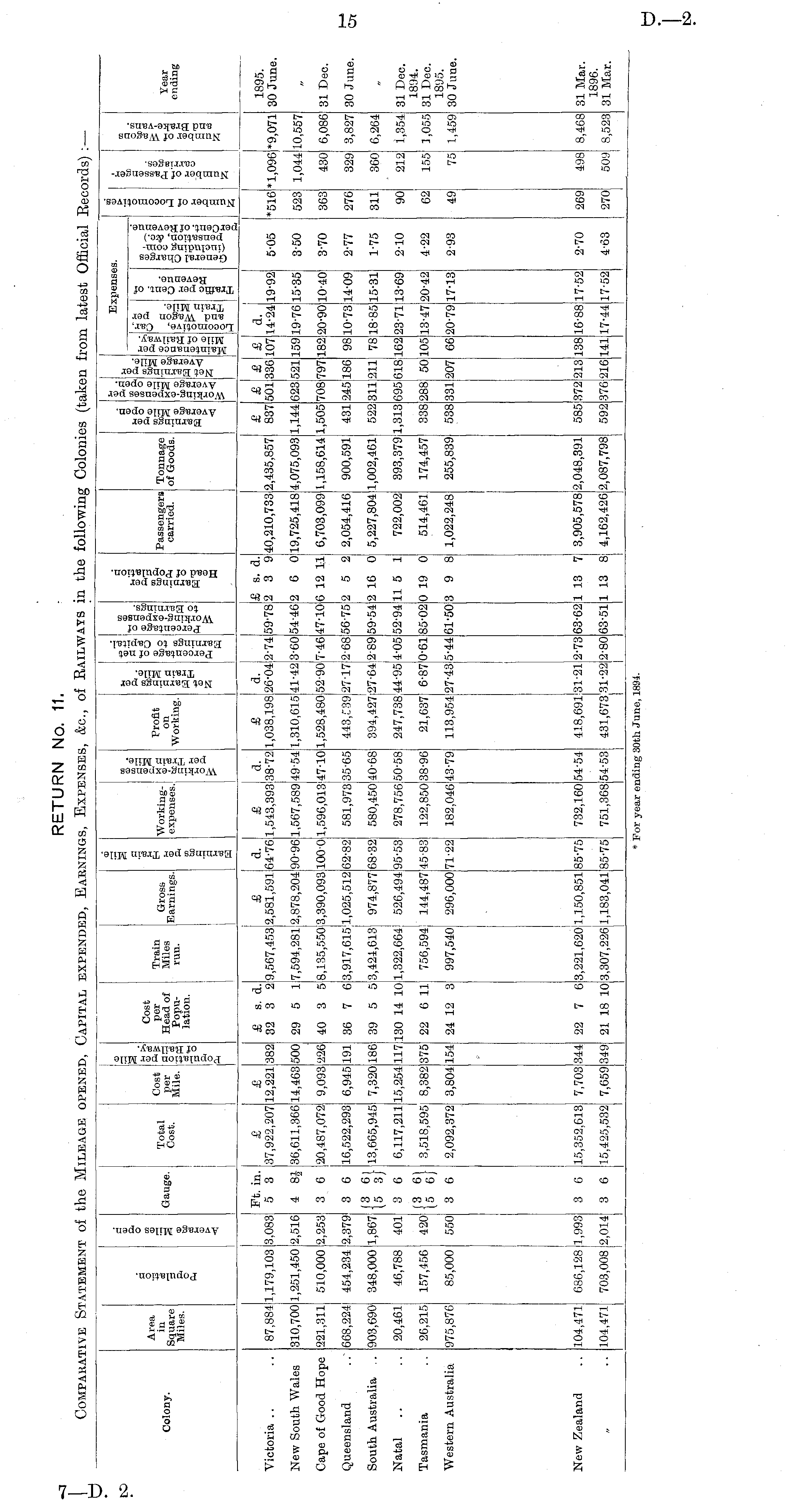 RETURN No. 11. Comparative Statement of the Mileage opened, Capital expended, Earnings, Expenses, &c, of Railways in the following Colonies (taken from latest Official Records) :
