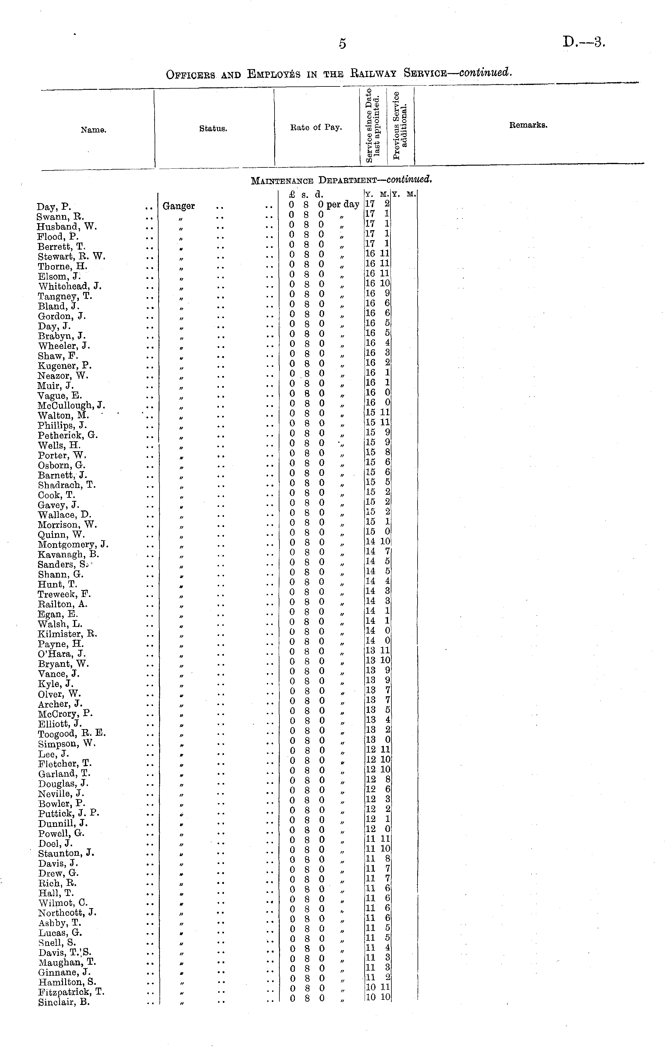 Status. Bate of Pay. H oi 8.9 a o i! t> to I CO O 11 I! Remarks. Name. Main: ?BNANCB DePAETM: SNT —Ci \ontin', •Aid. £ s. d. 0 8 0 per day 0 8 0 „ 0 8 0 0 8 0 „ 0 8 0 „ 0 8 0 0 8 0 „ 0 8 0 „ 0 8 0 0 8 0 „ 0 8 0 „ 0 8 0 0 8 0 0 8 0 „ 0 8 0 , 0 8 0 0 8 0 „ 0 8 0 „ 0 8 0 0 8 0 „ 0 8 0 „ 0 8 0 0 8 0 0 8 0 „ 0 8 0 '„ 0 8 0 „ 0 8 0 0 8 0 0 8 0 „ 0 8 0 0 8 0 0 8 0 „ 0 8 0 „ 0 8 0 0 8 0 0 8 0 „ 0 8 0 „ 0 8 0 0 8 0 0 8 0 „ 0 8 0 0 8 0 0 8 0 „ 0 8 0 „ 0 8 0 0 8 0 0 8 0 „ 0 8 0 0 8 0 0 8 0 0 8 0 „ 0 8 0 0 8 0 0 8 0 „ 0 8 0 „ 0 8 0 0 8 0 , 0 8 0 „ 0 8 0 0 8 0 0 8 0 „ 0 8 0 0 8 0 „ 0 8 0 , 0 8 0 0 8 0 0 8 0 0 8 0 „ 0 8 0 , 0 8 0 0 8 0 0 8 0 „ 0 8 0 „ 0 8 0 0 8 0 0 8 0 „ 0 8 0 „ 0 8 0 0 8 0 0 8 0 0 8 0 „ Y. M. 17 2 17 1 17 1 17 1 17 1 16 11 16 11 16 11 16 10 16 9 16 6 16 6 16 5 16 5 16 4 16 3 16 2 16 1 16 1 16 0 16 0 IS 11 15 11 15 9 15 9 15 8 15 6 15 6 15 5 15 2 15 2 15 2 15 1 15 0 14 10 14 7 14 5 14 5 14 4 14 3 14 3 14 1 14 1 14 0 14 0 13 11 13 10 13 9 13 9 13 7 13 7 13 5 13 4 13 2 13 0 12 11 12 10 12 10 12 8 12 6 12 3 12 2 12 1 12 0 11 11 11 10 11 8 11 7 11 7 11 6 11 6 11 6 11 6 11 5 11 5 11 4 11 3 11 3 11 2 10 11 10 10 Y. M. Day, P. Swann, E. Husband, W. Flood, P. Berrett, T. Stewart, E. W. Tborne, H. Elsom, 3. Whitehead, J. Tangney, T. Bland, J. Gordon, J. Day, J. Brabyn, J. Wheeler, J. Shaw, F. Kugener, P. Neazor, W. Muir, J. Vague, E. MoOullough, J. Walton, M. • Phillips?, J. Petheriok, G. Wells, H. Porter, W. Osborn,G. Barnett, J. Shadrach, T. Cook,T. Gavey, J. Wallace, D. Morrison, W. Quinn, W. Montgomery, J. Kavanagh, B. Sanders, S. Shann, G. Hunt, T. Treweek, F. Eailton, A. Egan, E. Walsh, L. Kilmister, E. Payne, H. O'Hara, J. Bryant, W. Vance, J. Kyle, J. Olver, W. Archer, J. McCrory, P. Elliott, J. Toogood, E. E. Simpson, W. Lee, J. Fletcher, T. Garland, T. Douglas, J. Neville, J. Bowler, P. Puttick, J. P. Dunnill, J. Powell, G. Doel, J. Staunton, J. Davis, J. Drew, G. Rich, E. Hall, T. Wilmofc, 0. Northcott, J. Asbby, T. Lucas, G. Snell, S. Davis, T,'B. Maughan, T. Ginnane, J. Hamilton, S. Fitzpatrick, T. Sinclair, B. Ganger M W H It U M
