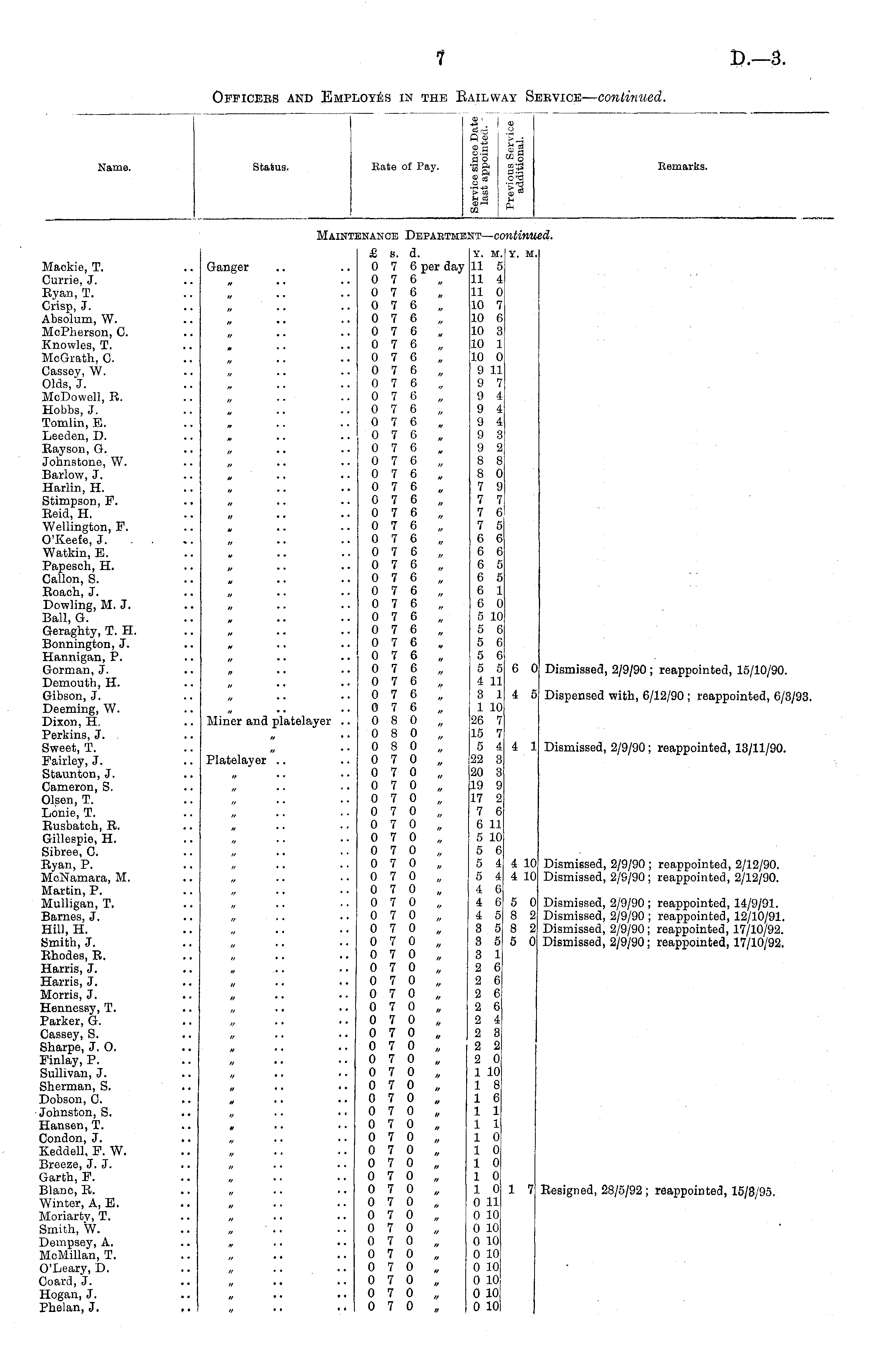 Namo. Status. Bate of Pay. Q - g.S II El 8 Jj Remarks. Maint: iNANCB Depabtme: NT — CO nitinut id. Maokie, T. Currie, J. By an, T. Crisp, J. Absolum, W. McPherson, C. Knowles, T. MoGrath, 0. Cassey, W. Olds, J. McDowell, R. Hobbs, J. Tomlin, E. Leeden, D. Eayson, G. Johnstone, W. Barlow, J. Harlin, H. Stimpson, F. Reid, H. Wellington, F. O'Keeie, J. Watkin, B. Papesch, H. Callon, S. Roach, J. Dowling, M. J. Ball, G. Geraghty, T. H. Bonnington, J. Hannigan, P. Gorman, J. Demouth, H. Gibson, J. Deeming, W. Dixon, H. Perkins, J. Sweet, T. Fairley, J. Staunton, J. Cameron, S. Olsen, T. Lonie, T. Rusbateh, R. Gillespie, H. Sibree, G. Ryan, P. McNamara, M. Martin, P. Mulligan, T. Barnes, J. Hill, H. Smith, J. Rhodes, R. Harris, J. Harris, J. Morris, J. Hennessy, T. Parker, G. Cassey, S. Sharpe, J. O. Finlay, P. Sullivan, J. Sherman, S. Dobson, O. Johnston, S. Hansen, T. Condon, J. Keddell, F. W. Breeze, J. 3. Garth, F. Blanc, R. Winter, A, E. Moriarty, T. Smith, W. Dempsey, A. McMillan, T. O'Leary, D. Coard, J. Hogan, J. Phelan, J, • • Ganger H • ' • • Miner and platelayer .. Platelayer .. £ a. d. 0 7 6 per day 0 7 6 „ 0 7 6 „ 0 7 6 0 7 6 „ 0 7 6 „ 0 7 6 0 7 6 0 7 6 „ 0 7 6 0 7 0 0 7 6 , 0 7 6 , 0 7 6 0 7 6 0 7 6 0 7 6 „ 0 7 6 0 7 6 0 7 6 „ 0 7 6 0 7 6 „ 0 7 6 0 7 6 0 7 6 „ 0 7 6 „ 0 7 6 0 7 6 „ 0 7 6 „ 0 7 6 0 7 6 0 7 6 „ 0 7 6 „ 0 7 6 0 7 6 „ 0 8 0 „ 0 8 0 0 8 0 0 7 0 „ 0 7 0 „ 0 7 0 „ 0 7 0 „ 0 7 0 0 7 0 „ 0 7 0 „ 0 7 0 0 7 0 „ 0 7 0 „ 0 7 0 0 7 0 0 7 0 „ 0 7 0 0 7 0 0 7 0 „ 0 7 0 „ 0 7 0 „ 0 7 0 „ 0 7 0 „ 0 7 0 „ 0 7 0 „ 0 7 0 „ 0 7 0,, 0 7 0 „ 0 7 0 „ 0 7 0 „ 0 7 0 „ 0 7 0 0 7 0 „ 0 7 0 „ 0 7 0 „ 0 7 0 „ 0 7 0 „ 0 7 0 0 7 0 0 7 0 „ 0 7 0 0 7 0 „ 0 7 0 „ 0 7 0 0 7 0 „ 0 7 0 , Y. M. 11 5 11 4 11 0 10 7 10 6 10 3 10 1 10 0 9 11 9 7 9 4 9 4 9 4 9 3 9 2 8 8 8 0 7 9 7 7 7 6 7 5 6 6 6 6 6 5 6 5 6 1 6 0 5 10 5 6 5 6 5 6 5 5 4 11 3 1 1 10 26 7 15 7 5 4 22 3 20 3 19 9 17 2 7 6 6 11 5 10 5 6 5 4 5 4 4 6 4 6 4 5 3 5 3 5 3 1 2 6 2 6 2 6 2 6 2 4 2 3 2 2 2 0 1 10 1 8 1 6 1 1 1 1 1 0 1 0 1 0 1 0 1 0 0 11 0 10 0 10 0 10 0 10 0 10 0 10 0 10 0 10 Y. M. 6 0 i 5 4 1 Dismissed, 2/9/90 ; reappointed, 15/10/90. Dispensed with, 6/12/90 ; reappointed, 6/3/9; Dismissed, 2/9/90 ; reappointed, 13/11/90. Dismissed, 2/9/90 ; reappointed, 2/12/90. Dismissed, 2/9/90; reappointed, 2/12/90. 4 10 4 10 5 0 8 2 8 2 5 0 Dismissed, 2/9/90 ; reappointed, 14/9/91. Dismissed, 2/9/90 ; reappointed, 12/10/91. Dismissed, 2/9/90 ; reappointed, 17/10/92. Dismissed, 2/9/90 ; reappointed, 17/10/92. Eesigned, 28/5/92 ; reappointed, 15/8/95. 1 7