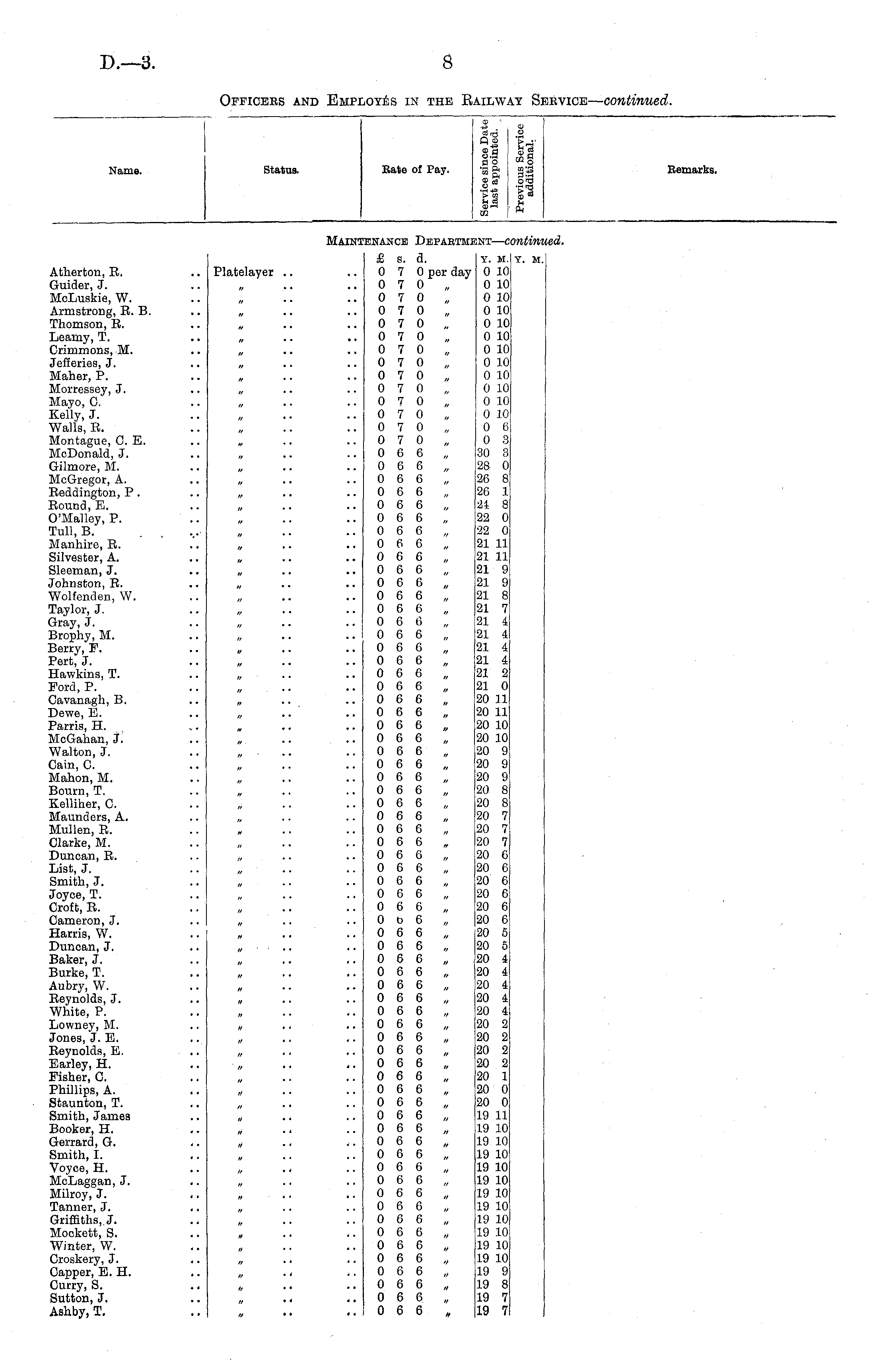 Name. Status. Kate of Pay. Z 0) Si *! •;S ft tn*.£ f! !! C* at £ » Remarks. Main 1 ;nance Depabtm: 5NT — Cl mtim id. Atherton, E. Guider, J. MoLuskie, W. Armstrong, E. B. Thomson, E. Leamy, T. Crimmons, M. Jefieries, J. Maher, P. Morressey, J. Mayo, G. Kelly, J. Walls, E. Montague, C. E. McDonald, J. Gilmore, M. McGregor, A. Eeddington, P . Bound, E. O'Malley, P. Tull, B. Manhire, E. Silvester, A. Sleeman, J. Johnston, E. Wolfenden, W. Taylor, J. Gray, J. Brophy, M. Berry, F. Pert, J. Hawkins, T. Ford, P. Cavanagh, B. Dewe, B. Parris, H. McGahan, J. Walton, J. Cain, C. Mahon, M. Bourn, T. Kelliher, C. Maunders, A. Mullen, E. Clarke, M. Duncan, E. List, J. Smith, J. Joyce, T. Croft, E. Cameron, J. Harris, W. Duncan, J. Baker, J. Burke, T. Aubry, W. Eeynolds, J. White, P. Lowney, M. Jones, J. B. Eeynolds, E. Earley, H. Fisher, C. Phillips, A. Staunton, T. Smith, James Booker, H. Gerrard, G. Smith, I. Voyce, H. McLaggan, J. Milroy, J. Tanner, J. Griffiths, J. Mockett, S. Winter, W. Croskery, J. Capper, E. H. Curry, S. Sutton, J. Ashby, T. Platelayer .. £ s. a. 0 7 0 per day 0 7 0 „ 0 7 0 „ 0 7 0 0 7 0 „ 0 7 0 , 0 7 0 0 7 0 „ 0 7 0 „ 0 7 0 0 7 0 0 7 0 „ 0 7 0 0 7 0 0 6 6 0 6 6 „ 0 6 6 „ 0 6 6 „ 0 6 6 0 6 6 „ 0 6 6 „ 0 6 6 0 6 6 „ 0 6 6 „ 0 6 6 0 6 6 0 6 6 „ 0 6 6 0 6 0 0 6 6 „ 0 6 6 „ 0 6 6 0 6 6 0 6 6 „ 0 6 6 „ 0 6 6 0 6 6 „ 0 6 6 „ 0 6 6 0 6 6 „ 0 6 6 „ 0 6 6 0 6 6 0 6 6 „ 0 6 6 „ 0 6 6 0 6 6 „ 0 6 6 „ 0 6 6 0 6 6 0 b 6 „ 0 6 6 „ 0 6 6 „ 0 6 6 „ 0 6 6 0 6 6 „ 0 6 6 „ 0 6 6 0 6 6 „ 0 6 6,, 0 6 6 „ 0 6 6 „ 0 6 6 0 6 6 „ 0 6 6 „ 0 6 6 „ 0 6 6 „ 0 6 6 0 6 6 0 6 6 „ 0 6 6 „ 0 6 6 0 6 6 „ 0 6 6 0 6 6 „ 0 6 6 „ 0 6 6 „ 0 6 6,, 0 6 6 „ 0 6 6 0 6 6 , Y. M. 0 10 0 10 0 10 0 10 0 10 0 10 0 10 0 10 0 10 0 10 0 10 0 10 0 6 0 3 SO 3 28 0 26 8 26 1 U 8 22 0 22 0 21 11 21 11 21 9 21 9 21 8 21 7 21 4 21 4 21 4 21 4 21 2 21 0 20 11 20 11 20 10 20 10 20 9 20 9 20 9 20 8 20 8 20 7 20 7 20 7 20 6 20 6 20 6 20 6 20 6 20 6 20 5 20 5 20 4 20 4 20 4 20 4 20 4 20 2 20 2 20 2 20 2 20 1 20 0 20 0 19 11 19 10 19 10 19 10 19 10 19 10 19 10 19 10 19 10 19 10 19 10 19 10 19 9 19 8 19 7 19 7 Y. M. rl • ' it • ' b • •
