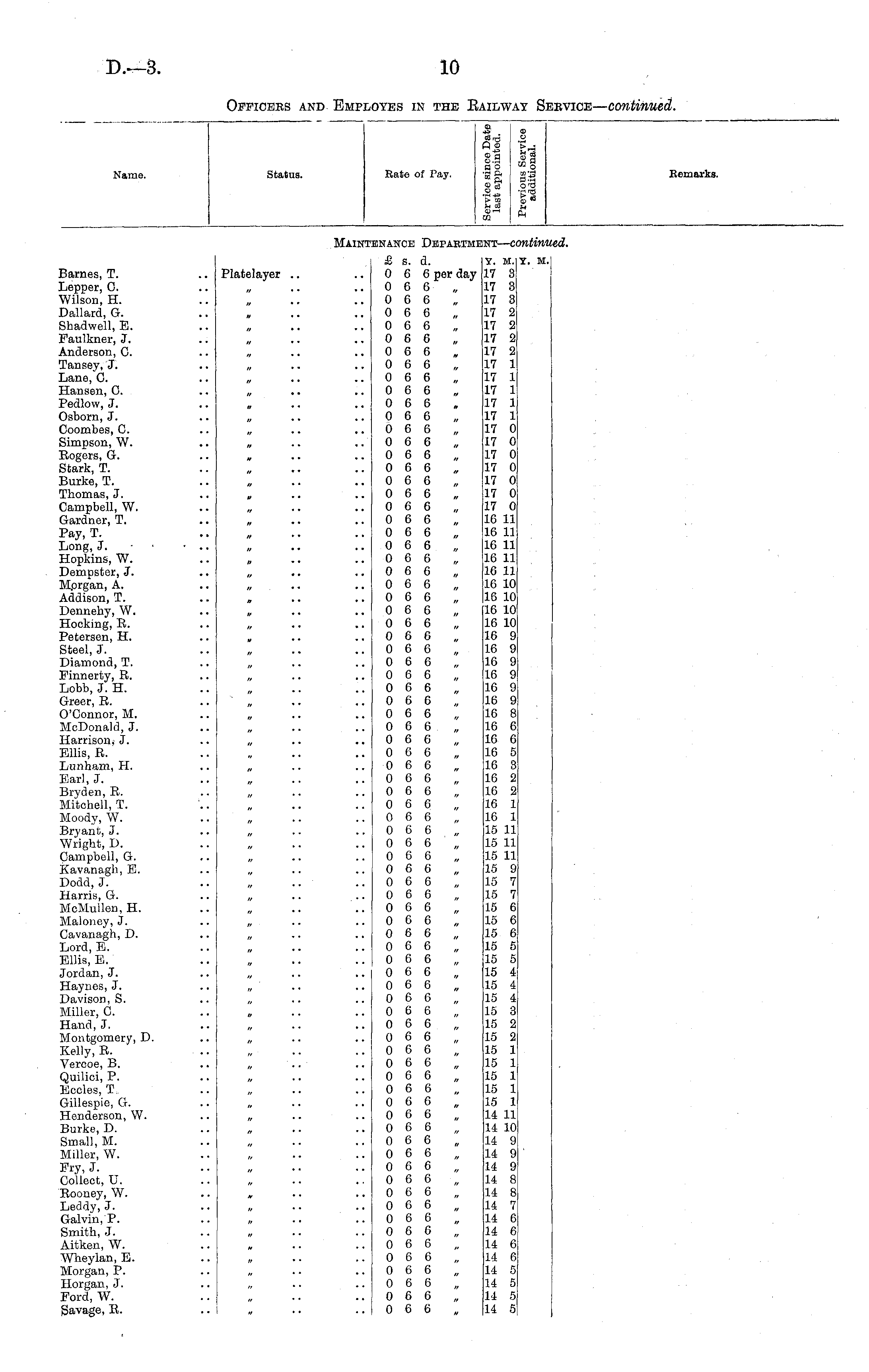 Name. Status. Rate of Pay. 01 Q a S.9 ■Sg, Jl t> Cβ U o3 02 a> o 1 II Bemarki Main: 1NANCE DePABTM] !NI —C( onti: led. Platelayer .. £ s. d. 0 6 6 per day 0 6 6 0 6 6 0 6 6 0 6 6 0 6 6 0 6 6 0 6 6 0 6 6 0 6 6 0 6 6 0 6 6 0 6 6 0 6 6 0 6 6 0 6 6 0 6 6 0 6 6 0 6 6 0 6 6 0 6 6 0 6 6 0 6 6 0 6 6 0 6 6 0 6 6 0 6 6 0 6 6 0 6 6 0 6 6 0 6 6 0 6 6 0 6 6 0 6 6 0 6 6 0 6 6 0 6 6 0 6 6 0 6 6 0 6 6 0 6 6 0 6 6 0 6 6 0 6 6 0 0 6 0 6 6 0 6 6 0 6 6 0 6 6 0 6 6 0 6 6 0 6 6 0 6 6 0 6 6 0 6 6 0 6 6 0 6 6 0 6 6 0 6 6 0 6 6 0 6 6 0 6 6 0 6 6 0 6 6 0 6 6 0 6 6 0 6 6 0 6 6 0 6 6 0 6 6 0 6 6 0 6 6 0 6 6 0 6 6 0 6 6 0 6 6 0 6 6 0 6 6 0 6 6 0 6 6 0 6 6 Y. M. 17 3 17 3 17 3 17 2 17 2 17 2 17 2 17 1 17 1 17 1 17 1 17 1 17 0 17 0 17 0 17 0 17 0 17 0 17 0 16 11 16 11 16 11 16 11 16 11 16 10 16 10 16 10 16 10 16 9 16 9 16 9 16 9 16 9 16 9 16 8 16 6 16 6 16 5 16 3 16 2 16 2 16 1 16 1 15 11 15 11 15 11 15 9 15 7 15 7 15 6 15 6 15 6 15 5 15 5 15 4 15 4 15 4 15 3 15 2 15 2 15 1 15 1 15 1 15 1 15 1 14 11 14 10 14 9 14 9 14 9 14 8 14 8 14 7 14 6 14 6 14 6 14 6 14 5 14 5 14 5 14 5 r. i Barnes, T. Lepper, 0. Wilson, H. Dallard, G. Shadwell, E. Faulkner, J. Anderson, C. Tansey, J. Lane, C. Hansen, C. Pedlow, J. Osborn, J. Coombes, C. Simpson, W. Rogers, G. Stark, T. Burke, T. Thomas, J. Campbell, W. Gardner, T. Pay, T. Long, J. Hopkins, W. Dempster, J. Mprgan, A. Addison, T. Dennehy, W. Hooking, B. Petersen, H. Steel, J. Diamond, T. Finnerty, B. Lobb, J. H. Greer, B. O'Connor, M. McDonald, J. Harrison, j. Ellis, R. Lunham, H. Earl, J. Bryden, B. Mitchell, T. Moody, W. Bryant, J. Wright, D. Campbell, G. Kavanagh, E. Dodd, J. Harris, G. McMullen, H. Maloney, J. Cavanagh, D. Lord, E. Ellis, E. Jordan, J. Haynes, J. Davison, S. Miller, C. Hand, J. Montgomery, D. Kelly, B. Vercoe, B. Quilici, P. Eccles, T. Gillespie, G. Henderson, W. Burke, D. Small, M. Miller, W. Fry, J. Collect, U. Booney, W. Leddy, J. Galvin, P. Smith, J. Aitken, W. Wheylan, E. Morgan, P. Horgan, J. Ford, W. Savage, R. * ■ ■ it • •