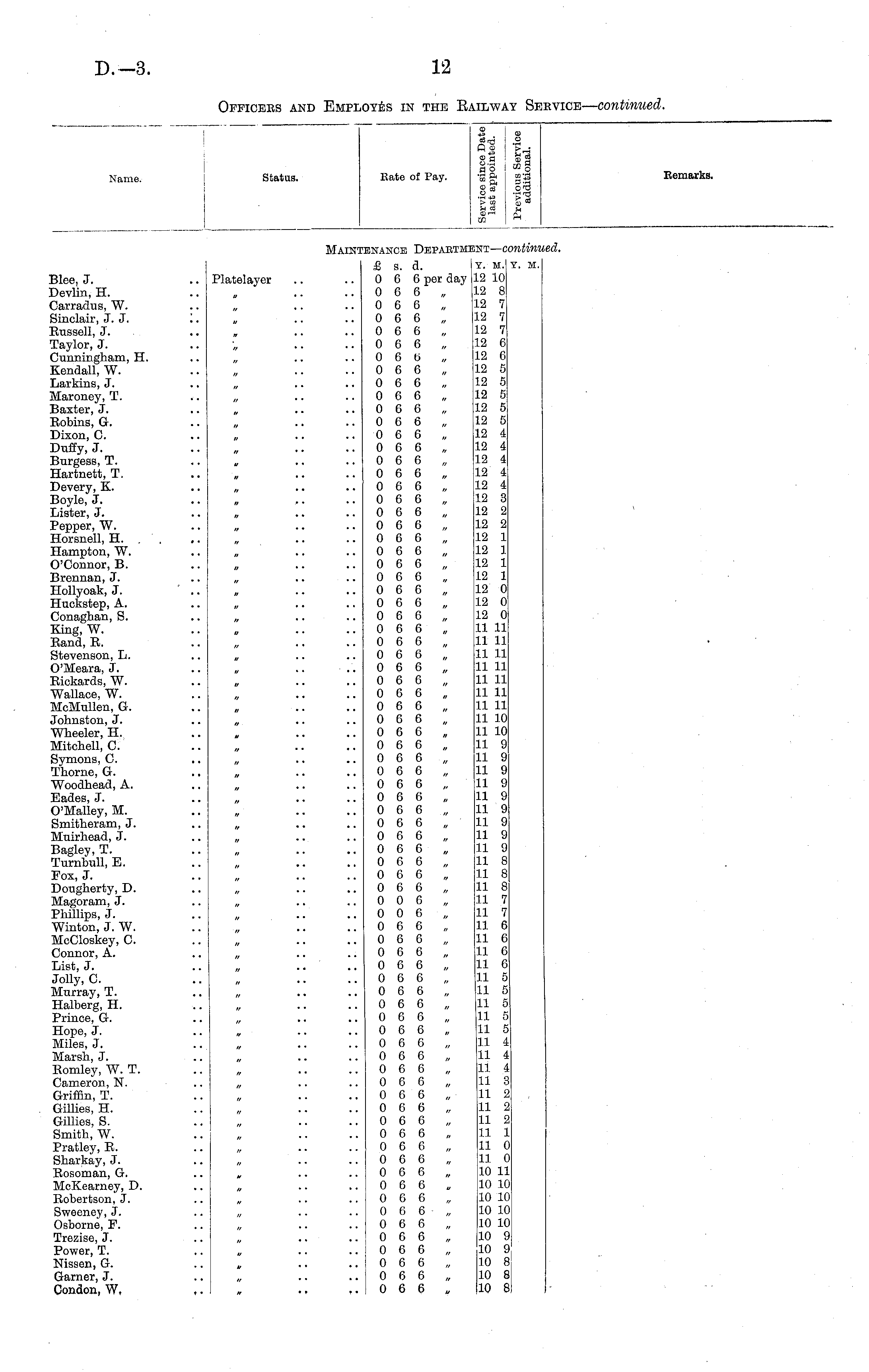 Name. I Status. Bate of Pay. *d ! .2 If || 1! II CD I rt Betnarks. Maim finance Dkpabtm: 5NT— CC *,ontin', ',ed. Blee, J. Devlin, H. Carradus, W. Sinclair, J. J. Eussell, J. Taylor, J. Cunningham, H. Kendall, W. Larkins, J. Maroney, T. Baxter, J. Eobins, G. Dixon, C. Duffy, J. Burgess, T. Hartnett, T. Devery, K. Boyle, J. Lister, J. Pepper, W. Horsnell, H. Hampton, W. O'Connor, B. Brennan, J. Hollyoak, J. Huckstep, A. Conaghan, S. King, W. Hand, E. Stevenson, L. O'Meara, J. Eickards, W. Wallace, W. McMullen, G. Johnston, J. Wheeler, H. Mitchell, C. Symons, C. Thorne, G. Woodhead, A. Eades, J. O'Malley, M. Smitheram, J. Muirhead, J. Bagley, T. Turnbull, E. Fox, J. Dougherty, D. Magoram, J. Phillips, J. Winton, J. W. McCloskey, C. Connor, A. List, J. Jolly, C. Murray, T. Halberg, H. Prince, G. Hope, J. Miles, J. Marsh, J. Eomley, W. T. Cameron, N. Griffin, T. Gillies, H. Gillies, S. Smith, W. Pratley, E. Sharkay, J. Rosoman, G. McKearney, D. Robertson, J. Sweeney, J. Osborne, F. Trezise, J. Power, T. Nissen, G. Garner, J. Condon, W, Platelayer £ s. a. 0 6 6 per day 0 6 6 „ 0 6 6 0 6 6 „ 0 6 6 0 6 6 0 6 6 „ 0 6 6 „ 0 6 6 0 6 6 0 6 6 „ 0 6 6 „ 0 6 6 0 6 6 0 6 6 „ 0 6 6 „ 0 6 6 0 6 6 0 6 6 „ 0 6 6 „ 0 6 6 0 6 6 „ 0 6 6 „ 0 6 6 „ 0 6 6 „ 0 6 6 „ 0 6 6 „ 0 6 6 0 6 6 0 6 6 0 6 6 0 6 6 „ 0 6 6 0 6 6 0 6 6 „ 0 6 6 0 6 6 0 6 6 „ 0 6 6 „ 0 6 6 „ 0 6 6 „ 0 6 6 „ 0 6 6 0 6 6 0 6 6 „ 0 6 6 „ 0 6 6 0 6 6 0 0 6 „ 0 0 6 0 6 6 „ 0 6 6 0 6 6 0 0 6 „ 0 6 6 0 6 6 0 6 6 „ 0 6 6 0 6 6 0 6 6 „ 0 6 6 0 6 6 0 6 6 „ 0 6 6 0 6 6 0 6 6 „ 0 6 6 0 6 6 „ 0 6 6 0 6 6 0 6 6 0 6 6 „ 0 6 6,, 0 6 6 0 6 6 „ 10 6 6 ! 0 6 6 „ 0 6 6 0 6 6 Y. M. 12 10 12 8 12 7 12 7 12 7 12 6 12 6 12 5 12 5 12 5 12 5 12 5 12 4 12 4 12 4 12 4 12 4 12 3 12 2 12 2 12 1 12 1 12 1 12 1 12 0 12 0 12 0 11 11 11 11 11 11 11 11 11 11 11 11 11 11 11 10 11 10 11 9 11 9 11 9 11 9 11 9 11 9 11 9 11 9 11 9 11 8 11 8 11 8 11 7 11 7 11 6 11 6 11 6 11 6 11 5 11 5 11 5 11 5 11 5 11 4 11 4 11 i 11 3 11 2 11 2 11 2 11 1 11 0 11 0 10 11 10 10 10 10 10 10 10 10 10 9 10 9 10 8 10 8 10 8 Y. M.