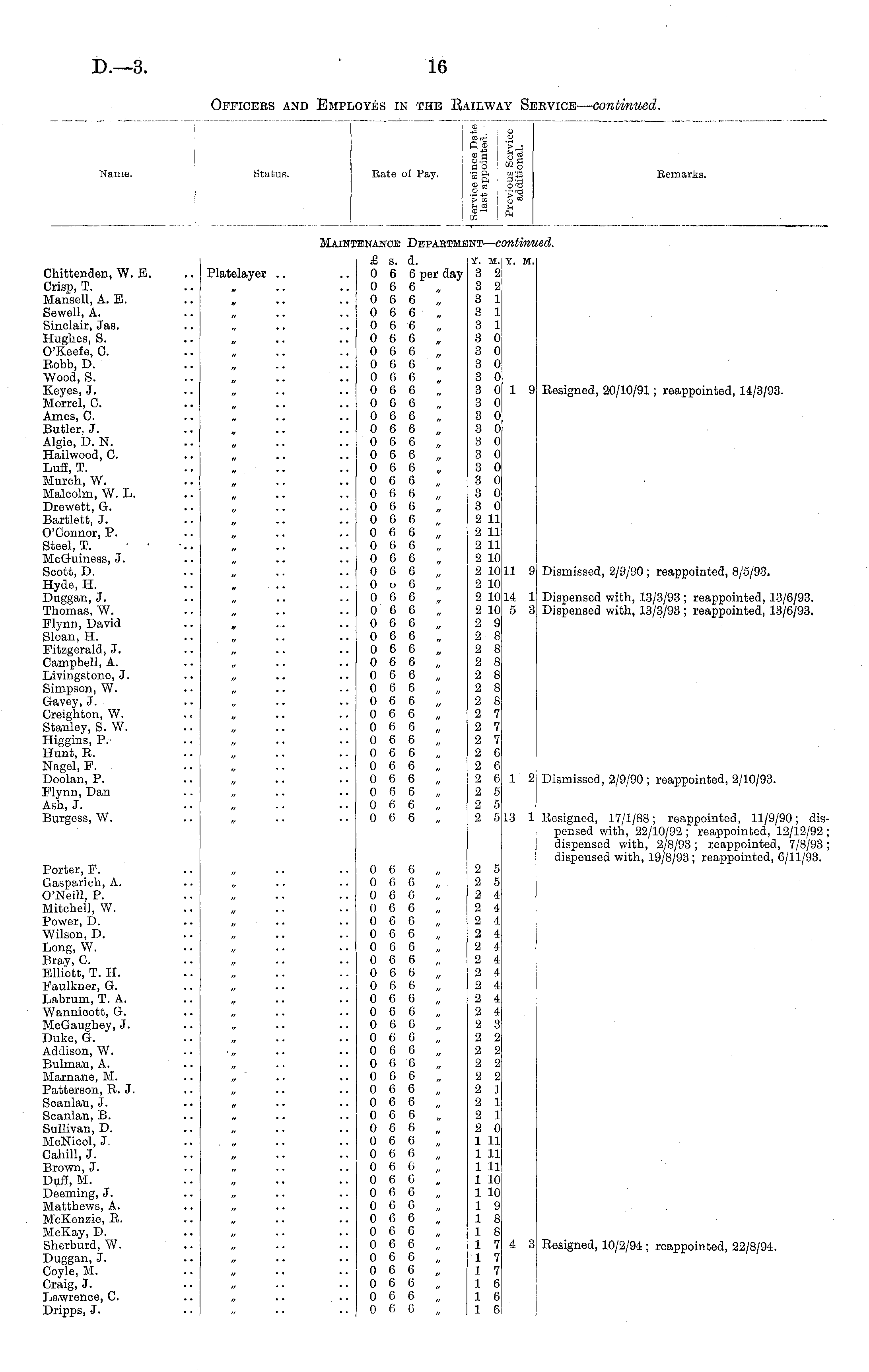 Name. I Status. Rate of Pay. 2 \ ] a il! if II j li Remarks. Main; 1NANCE DePABTMI :nt —ci ontin'i <,ed. Chittenden, W. E. Crisp, T. Mansell, A. E. Sewell, A. Sinclair, Jas. Hughes, S. O'Keefe, C. Robb, D. Wood, S. Keyes, J. Morrel, G. Ames, C. Butler, J. Algie, D. N. Hailwood, G. Luff, T. Murch, W. Malcolm, W. L. Drewett, G. Bartlett, J. O'Connor, P. Steel, T. McGuiness, J. Scott, D. Hyde, H. Duggan, J. Thomas, W. Flynn, David Sloan, H. Fitzgerald, J. Campbell, A. Livingstone, J. Simpson, W. Gavey, J. Greighton, W. Stanley, S. W. Higgins, P. Hunt, R. Nagel, F. Doolan, P. Flynn, Dan Ash, J. Burgess, W. Platelayer .. £ s. d. 0 6 6 per day 0 6 6 „ 0 6 6 „ 0 6 6,, 0 6 6 0 6 6 , 0 6 6 „ 0 6 6 0 6 6 0 6 6 „ 0 6 6 „ 0 6 6 0 6 6 0 6 0 „ 0 6 6 „ 0 6 6 „ 0 6 6 0 6 6 „ 0 6 6 „ 0 6 6 0 6 6 „ 0 6 6 „ 0 6 6 „ 0 6 6 0 d 6 „ 0 6 6 „ 0 6 6 0 6 6 0 6 6 „ 0 6 6 „ 0 6 6 0 6 6 „ 0 6 6 „ 0 6 6 0 6 6 0 6 6 „ 0 6 6 „ 0 6 6 „ 0 6 6 „ 0 6 6 „ 0 6 6 0 6 6 „ 0 6 6 „ Y. M. 3 2 3 2 3 1 3 1 3 1 3 0 3 0 3 0 3 0 3 0 3 0 3 0 3 0 3 0 3 0 3 0 3 0 3 0 3 0 2 11 2 11 2 11 2 10 2 10 2 10 2 10 2 10 2 9 2 8 2 8 2 8 2 8 2 8 2 8 2 7 2 7 2 7 2 6 2 6 2 6 2 5 2 5 2 5 y. it, 1 9 Resigned, 20/10/91; reappointed, 14/3/93. Dismissed, 2/9/90 ; reappointed, 8/5/93. 11 9 14 1 5 3 Dispensed with, 13/3/93 ; reappointed, 13/6/93. Dispensed with, 13/3/93 ; reappointed, 13/6/93. Dismissed, 2/9/90 ; reappointed, 2/10/93. 1 2 Porter, F. Gasparich, A. O'Neill, P. Mitchell, W. Power, D. Wilson, D. Long, W. Bray, G. Elliott, T. H. Faulkner, G. Labrum, T. A. Wannicott, G. McGaughey, J. Duke, G. Addison, W. Bulman, A. Marnane, M. Patterson, E. J. Scanlan, j. Scanlan, B. Sullivan, D. McNicol, J. Cahill, J. Brown, J. Dufi, M. Deeming, J. Matthews, A. McKonzie, R. McKay, D. Sherburd, W. Duggan, J. Coyle, M. Craig, J. Lawrence, C. Dripps, J. 0 6 6 0 6 6 0 6 6 „ 0 6 6 „ 0 6 6 „ 0 6 6 0 6 6 0 6 6 „ 0 6 6 „ 0 6 6 0 6 6 „ 0 6 6 „ 0 6 6 0 6 6 0 6 6 „ 0 6 6 „ 0 6 6 „ 0 6 6 0 6 6 0 6 6 „ 0 6 6 „ 0 6 6 0 6 6 0 6 6 0 6 6 , 0 6 6 0 6 6 0 6 6 0 6 6 „ 0 6 6 „ 0 6 6 0 6 6 0 6 6 „ 0 6 6 „ 0 6 0 2 5 2 5 2 4 2 4 2 4 2 4 2 4 2 4 2 4 2 4 2 4 2 4 2 3 2 2 2 2 2 2 2 2 2 1 2 1 2 1 2 0 1 11 1 11 1 11 1 10 1 10 1 9 1 8 1 8 1 7 1 7 1 7 1 6 1 6 1 6 13 1 Resigned, 17/1/88; reappointed, 11/9/90; dispensed with, 22/10/92 ; reappointed, 12/12/92 ; dispensed with, 2/8/93; reappointed, 7/8/93 ; dispensed with, 19/8/93 ; reappointed, 6/11/93. Resigned, 10/2/94 ; reappointed, 22/8/94. 4 3