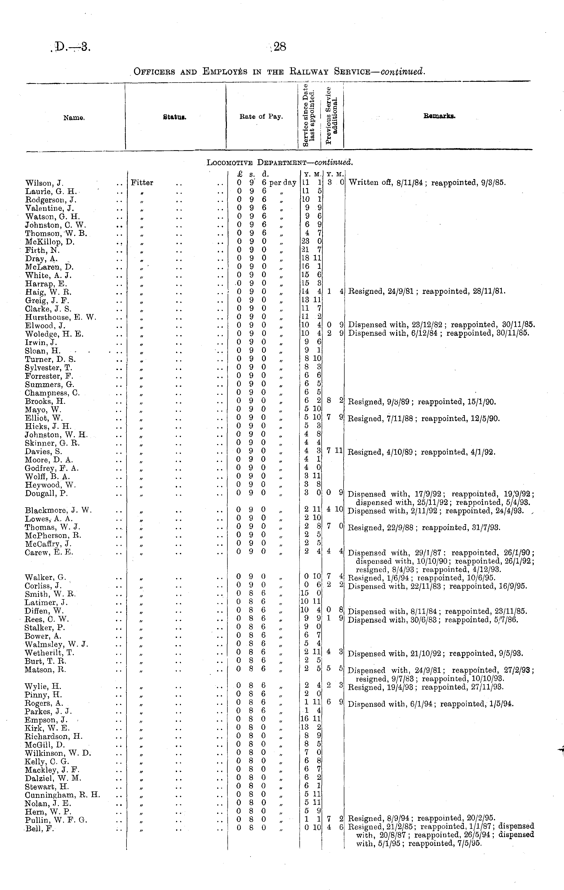 Name. Statue. Bate of Fay. 2 ai a 8 6 j ■III 11 11 I I" Remarks. Loco: :otive Dbpaktme: VI — CO', itinui td. Wilson, J. Laurie, G. H. Rodgerson, J. Valentine, J. Watson, G. H. Johnston, C. W. Thomson, W. B. McKillop, D. Firth, N. Dray, A. McLaren, D. White, A. J. Harrap, B. Haig, W. R. Greig, J. F. Clarke, J. S. Hursthouse, E. W. Elwood, J. Woledge, H. E. Irwin, J. Sloan, H. Turner, D. S. Sylvester, T. Forrester, F. Summers, G. ChampnesR, C. Brooks, H. Mayo, W. Elliot, W. Hicks, J. H. Johnston, W. H. Skinner, G. R. Davies, S. Moore, D. A. Godfrey, F. A. Wolfi, B. A. Hey wood, W. Dougall, P. Fitter & s. d. 0 9 6 per day 0 9 6 „ 0 9 6 „ 0 9 6 0 9 6 „ 0 9 6 „ 0 9 6 „ 0 9 0 0 9 0 „ 0 9 0 „ 0 9 0 0 9 0 0 9 0 0 9 0 „ 0 9 0 „ 0 9 0 0 9 0 0 9 0 0 9 0 „ 0 9 0 0 9 0 „ 0 9 0 „ 0 9 0 „ 0 9 0 0 9 0 0 9 0 „ 0 9 0 0 9 0 0 9 0 0 9 0 „ 0 9 0 „ 0 9 0 0 9 0 0 9 0 0 9 0 „ 0 9 0 0 9 0 0 9 0 Y. M. 11 1 LI 5 10 1 9 9 9 6 6 9 4 7 23 0 21 7 18 11 16 1 15 6 15 3 L4 4 13 11 11 7 LI 2 10 4 10 4 9 6 9 1 8 10 8 3 6 6 6 5 6 5 6 2 5 10 5 10 5 3 4 8 4 4 4 3 4 1 4 0 3 11 3 8 3 0 T. M. 3 0 0 9 2 9 1 4 Written off, 8/11/84; reappointed, 9/8/85. Kesigned, 24/9/81 ; reappointed, 28/11/81. Dispensed with, 23/12/82 ; reappointed, 30/11/85. Dispensed with, 6/12/84 ; reappointed, 80/11/85. 8n Resigned, 9/3/89; reappointed, 15/1/90. 7 9 Resigned, 7/11/88 ; reappointed, 12/5/90. 7 11 Resigned, 4/10/89 ; reappointed, 4/1/92. 0 9 Dispensed with, 17/9/92; reappointed, 19/9/92; dispensed with, 25/11/92; reappointed, 5/4/93. Dispensed with, 2/11/92 ; reappointed, 24/4/93. , Blackmore, J. W. Lowes, A. A. Thomas, W. J. McPherson, R. McCafiry, J. Carew, E. E. 0 9 0 0 9 0 0 9 0 „ 0 9 0 „ 0 9 0 0 9 0 2 11 2 10 2 8 2 5 2 5 2 4 4 10 7 0 Resigned, 22/9/88 ; reappointed, 31/7/93. Walker, G. Corliss, J. Smith, W. R. Latime-rj J. Diffen, W. Rees, C. W. Stalker, P. Bower, A. Walmsley, W. J. Wetherilt, T. Burt, T. R. Matson, R. 0 9 0 0 9 0 0 8 6 0 8 6 0 8 6 „ 0 8 6 „ 0 8 6,, 0 8 6 0 8 6 „ 0 8 6 0 8 6 0 8 6 4 4 Dispensed with, 29/1/87 ; reappointed, 26/1/90 ; dispensed with, 10/10/90; reappointed, 26/1/92; resigned, 8/4/93; reappointed, 4/12/93. Resigned, 1/6/94 ; reappointed, 10/6/95. Dispensed with, 22/11/83 ; reappointed, 16/9/95. 0 10 0 6 15 0 10 11 10 4 9 9 9 0 6 7 5 4 2 11 2 5 2 5 7 4 2 2 0 8 1 9 Dispensed with, 8/11/84; reappointed, 23/11/85. Dispensed with, 30/6/83 ; reappointed, 5/7/86. 4 3 Dispensed with, 21/10/92 ; reappointed, 9/5/93. 5 6 Dispensed with, 24/9/81; reappointed, 27/2/93; resigned, 9/7/83; reappointed, 10/10/93. Resigned, 19/4/93 ; reappointed, 27/11/93. Wylie, H. Pinny, H. Rogers, A. Parkes, J. J. Empson, J. Kirk, W. E. Richardson, H. McGilt, D. Wilkinson, W. D. Kelly, C. G. Mackley, J. F. Dalziel, W. M. Stewart, H. Cunningham, R. H. Nolan, J. E. Hern, W. P. Pullin, W. F. G. Bell, F. 0 8 6 „ 0 8 6 0 8 6 0 8 6 „ 0 8 0 „ 0 8 0 „ 0 8 0 0 8 0 0 8 0 „ 0 8 0 „ 0 8 0 0 8 0 0 8 0 0 8 0 „ 0 8 0 0 S 0 0 8 0 0 8 0 2 4 2 0 1 11 1 4 16 11 13 2 8 9 8 5 7 0 6 8 6 7 6 2 6 1 5 11 5 11 5 9 1 1 0 10 2 3 6 9 Dispensed with, 6/1/94; reappointed, 1/5/94. Resigned, 8/9/94 ; reappointed, 20/2/95. Resigned, 21/2/85; reappointed, 1/1/87; dispensed with, 20/8/87; reappointed, 26/5/94; dispensed with, 5/1/95 ; reappointed, 7/5/95. 7 2 4 6