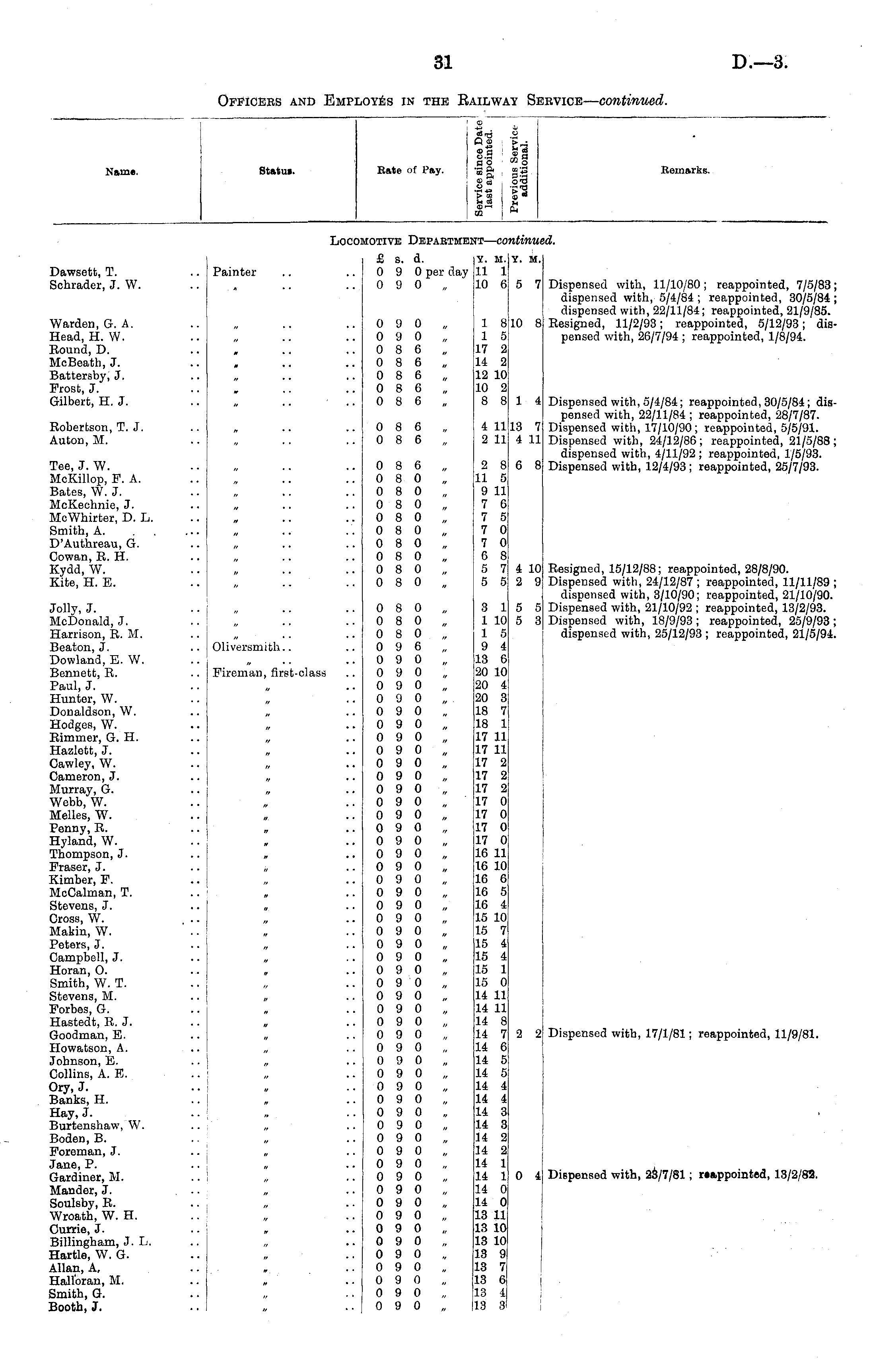 Name. Status. Bate of Pay. ai L S3 11 BO m o © co Co 1? I |1 CO I R Remarks. Locc :otive Dbpabtme: JT — CO' ntinut •4. Dawsett, T. Sohrader, J. W. Painter £ s. d. 0 9 0 per day 0 9 0 „ Y. M. 11 1 10 6 Y. M. Dispensed with, 11/10/80; reappointed, 7/5/83; dispensed with, 5/4/84; reappointed, 30/5/84; dispensed with, 22/11/84; reappointed, 21/9/85. Resigned, 11/2/93; reappointed, 5/12/93; dispensed with, 26/7/94 ; reappointed, 1/8/94. 5 7 Warden, G. A. Head, H. W. Bound, D. McBeath, J. Battersby, J. Frost, J. Gilbert, H. J. 0 9 0 „ 0 9 0 „ 0 8 6 0 8 6 „ 0 8 6 „ 0 8 6 , 0 8 6 1 8 1 5 17 2 14 2 12 10 10 2 8 8 10 8 Robertson, T. J. Auton, M. 0 8 6 „ 0 8 6 „ 4 11 2 11 1 4 13 7 4 11 Dispensed with, 5/4/84; reappointed, 30/5/84; dispensed with, 22/11/84 ; reappointed, 28/7/87. Dispensed with, 17/10/90; reappointed, 5/5/91. Dispensed with, 24/12/86; reappointed, 21/5/88 ; dispensed with, 4/11/92 ; reappointed, 1/5/93. Dispensed with, 12/4/93 ; reappointed, 25/7/93. Tee, J. W. McKillop, F. A. Bates, W. J. McKeehnie, J. MoWhirter, D. L. Smith, A. D'Authreau, G. Cowan, E. H. Kydd, W. Kite, H. E. 0 8 6 0 8 0 0 8 0 „ 0 8 0 „ 0 8 0 0 8 0 0 8 0 „ 0 8 0 0 8 0 „ 0 8 0 „ 2 8 11 5 9 11 7 6 7 5 7 0 7 0 6 8 5 7 5 5 6 8 Resigned, 15/12/88; reappointed, 28/8/90. Dispensed with, 24/12/87 ; reappointed, 11/11/89 ; dispensed with, 3/10/90; reappointed, 21/10/90. Dispensed with, 21/10/92 ; reappointed, 13/2/93. Dispensed with, 18/9/93 ; reappointed, 25/9/93; dispensed with, 25/12/93 ; reappointed, 21/5/94. 4 10 2 9 Jolly, J. McDonald, J. Harrison, R. M. Beaton, J. Dowland, E. W. Bennett, R. Paul, J. Hunter, W. Donaldson, W. Hodges, W. Rimmer, G. H. Hazlett, J. Cawley, W. Cameron, J. Murray, G. Webb, W. Melles, W. Penny, R. Hyland, W. Thompson, J. Fraser, J. Kimber, F. McCalman, T. Stevens, J. Cross, W. Makin, W. Peters, J. Campbell, J. Horan, O. Smith, W. T. Stevens, M. Forbes, G. Hastedt, R. J. Goodman, E. Howatson, A. Johnson, B. Collins, A. E. Ory, J. Banks, H. Hay, J. Burtenshaw, W. Boden, B. Foreman, J. Jane, P. Gardiner, M. Mander, J. Soulsby, R. Wroath, W. H. Currie, J. Billingham, J. L. Hartle, W. G. Allan, A. Halloran, M. Smith, Q. Booth, J, Olivei'smith.. Fireman, first-class 0 8 0 0 8 0 0 8 0 0 9 6 0 9 0 „ 0 9 0 0 9 0 „ 0 9 0 „ 0 9 0 „ 0 9 0 0 9 0 0 9 0 , 0 9 0 „ 0 9 0 0 9 0 „ 0 9 0 „ 0 9 0 , 0 9 0 0 9 0 „ 0 9 0 „ 0 9 0 „ 0 9 0 0 9 0 0 9 0 „ 0 9 0 „ 0 9 0 0 9 0 0 9 0 „ 0 9 0 „ 0 9 0 0 9 0 0 9 0 , 0 9 0 0 9 0 0 9 0 , 0 9 0 , 0 9 0 0 9 0 0 9 0 0 9 0 „ 0 9 0 , 0 9 0 0 9 0 0 9 0 „ 0 9 0 „ 0 9 0 0 9 0 0 9 0 „ 0 9 0 „ 0 9 0 0 9 0 0 9 0 „ 0 9 0 „ 0 9 0 „ 0 9 0 3 1 1 10 1 5 9 4 13 6 20 10 20 4 20 3 18 7 18 1 17 11 17 11 17 2 17 2 17 2 17 0 17 0 17 0 17 0 16 11 16 10 16 6 16 5 16 4 15 10 15 7 15 4 15 4 15 1 15 0 14 11 14 11 14 8 14 7 14 6 14 5 14 5 14 4 14 4 14 3 14 3 14 2 14 2 14 1 14 1 14 0 14 0 13 11 13 10 13 10 13 9 13 7 13 6 13 4 13 3 5 5 5 3 I Dispensed with, 17/1/81; reappointed, 11/9/81. 2 2 i> Dispensed with, 23/7/81; reappointed, 13/2/89. 0 4
