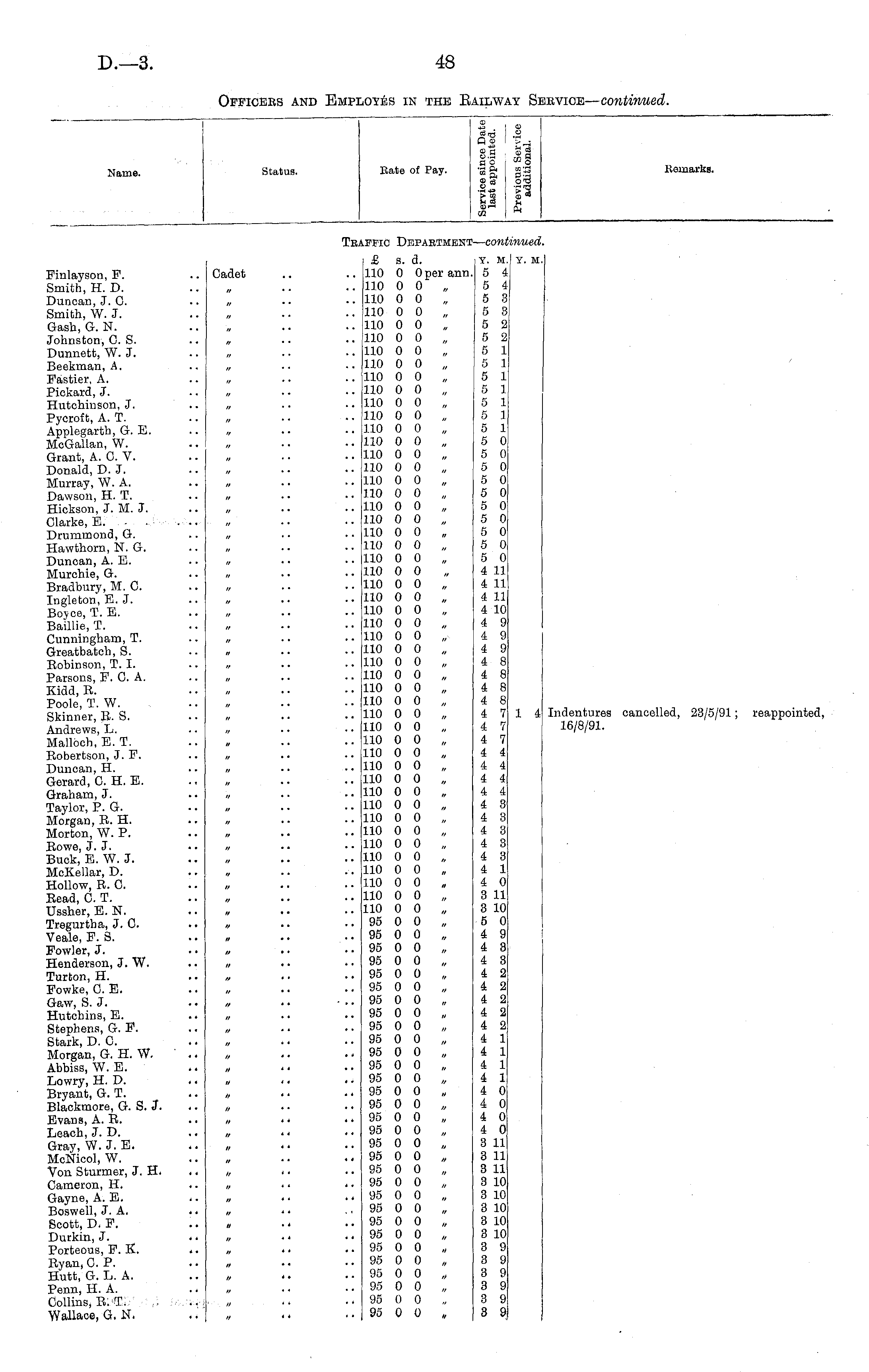 Status. Bate of Pay. 2 I o> Q O I >_; i! I a- * .Remarks. Name. Th. LFFIC DbPABTMEN , ! — confr mue< Finlayson, P. Smith, H. D. Duncan, J. G. Smith, W. J. Gash, G. N. Johnston, 0. S. Dunnett, W. J. Beekman, A. Pastier, A. Pickard, J. Hutchinson, J. Pycroft, A. T. Applegarth, G. E. McGallan, W. Grant, A. C. V. Donald, D. J. Murray, W. A. Dawson, H. T. Hiokson, J. M. J. Clarke, E. • . Drumrnond, G. Hawthorn, N. G. Duncan, A. E. Murchie, G. Bradbury, M. C. Ingleton, E. J. Boyce, T. E. Baillie, T. Cunningham, T. Greatbatch, S. Eobinson, T. I. Parsons, P. C. A. Kidd, B. Poole, T. W. Skinner, B. S. Andrews, L. Malloch, E. T. Kobertson, J. P. Duncan, H. Gerard, 0. H. B. Graham, J. Taylor, P. G. Morgan, B. H. Morton, W. P. Rowe, J. J. Buck, E. W. J. McKellar, D. Hollow, B. C. Bead, C. T. Ussher, E. N. Tregurtha, J. C. Veale, P. S. Fowler, J. Henderson, J. W. Turton, H. Powke, 0. E. Gaw, S. J. Hutchins, E. Stephens, G. F. Stark, D. C. Morgan, G. H. W. Abbiss, W. E. Lowry, H. D. Bryant, G. T. Blackmore, G. S. J. Evans, A. B. Leach, J. D. Gray, W. J. E. McNicol, W. Von Sturmer, J. H. Cameron, H. Gayne, A. E. Boswell, J. A. Scott, D, F. Durkin, J. Porteous, P. K. Byan, C. P. Hutt, G. L. A. Penn, H. A. Collins, B;T1 ' ,: Wallace, G. N. Cadet £ s. d. 110 0 0 per ann 110 0 0,, 110 0 0 „ 110 0 0 110 0 0 110 0 0 „ 110 0 0 110 0 0,, 110 0 0 „ 110 0 0 „ 110 0 0 110 0 0 110 0 0 „ 110 0 0 „ 110 0 0,, 110 0 0 110 0 0 „ 110 0 0,, 110 0 0,, 110 0 0 „ 110 0 0 110 0 0,, 110 0 0 „ 110 0 0 110 0 0,, 110 0 0 „ 110 0 0 110 0 0 110 0 0,, 110 0 0 „ 110 0 0 110 0 0,, 110 0 0 „ 110 0 0,, 110 0 0,, 110 0 0 110 0 0 „ 110 0 0 110 0 0 „ 110 0 0 „ 110 0 0 „ 110 0 0 „ 110 0 0 „ 110 0 0 „ 110 0 0 „ 110 0 0 „ 110 0 0 „ 110 0 0 110 0 0 „ 110 0 0 „ 95 0 0 95 0 0 „ 95 0 0 „ 95 0 0 95 0 0 „ 95 0 0 95 0 0 „ 95 0 0 „ 95 0 0 95 0 0 „ 95 0 0 95 0 0 „ 95 0 0 „ 95 0 0 „ 95 0 0 „ 95 0 0 95 0 0 95 0 0 „ 95 0 0 „ 95 0 0 95 0 0 „ 95 0 0 95 0 0 „ 95 0 0 „ 95 0 0 „ 95 0 0 „ 95 0 0 95 0 0 „ 95 0 0 „ 95 0 0 95 0 0 „ iY. M. . 5 4 5 4 5 3 5 3 5 2 5 2 5 1 5 1 5 1 5 1 5 1 5 1 5 1 5 0 5 0 5 0 5 0 5 0 5 0 5 0 5 0 5 0 5 0 4 11 4 11 4 11 4 10 4 9 4 9 4 9 4 8 4 8 4 8 4 8 4 7 4 7 4 7 4 4 4 4 4 4 4 4 4 3 4 3 4 3 4 3 4 3 4 1 4 0 3 11 3 10 5 0 4 9 4 3 4 3 4 2 4 2 4 2 4 2 4 2 4 1 4 1 4 1 4 1 4 0 4 0 4 0 4 0 3 11 3 11 3 11 3 10 3 10 3 10 3 10 3 10 3 9 3 9 3 9 3 9 3 9 8 9 Y. J 1 & Indentures cancelled, 23/5/91; 16/8/91. reappointed. a rt it it
