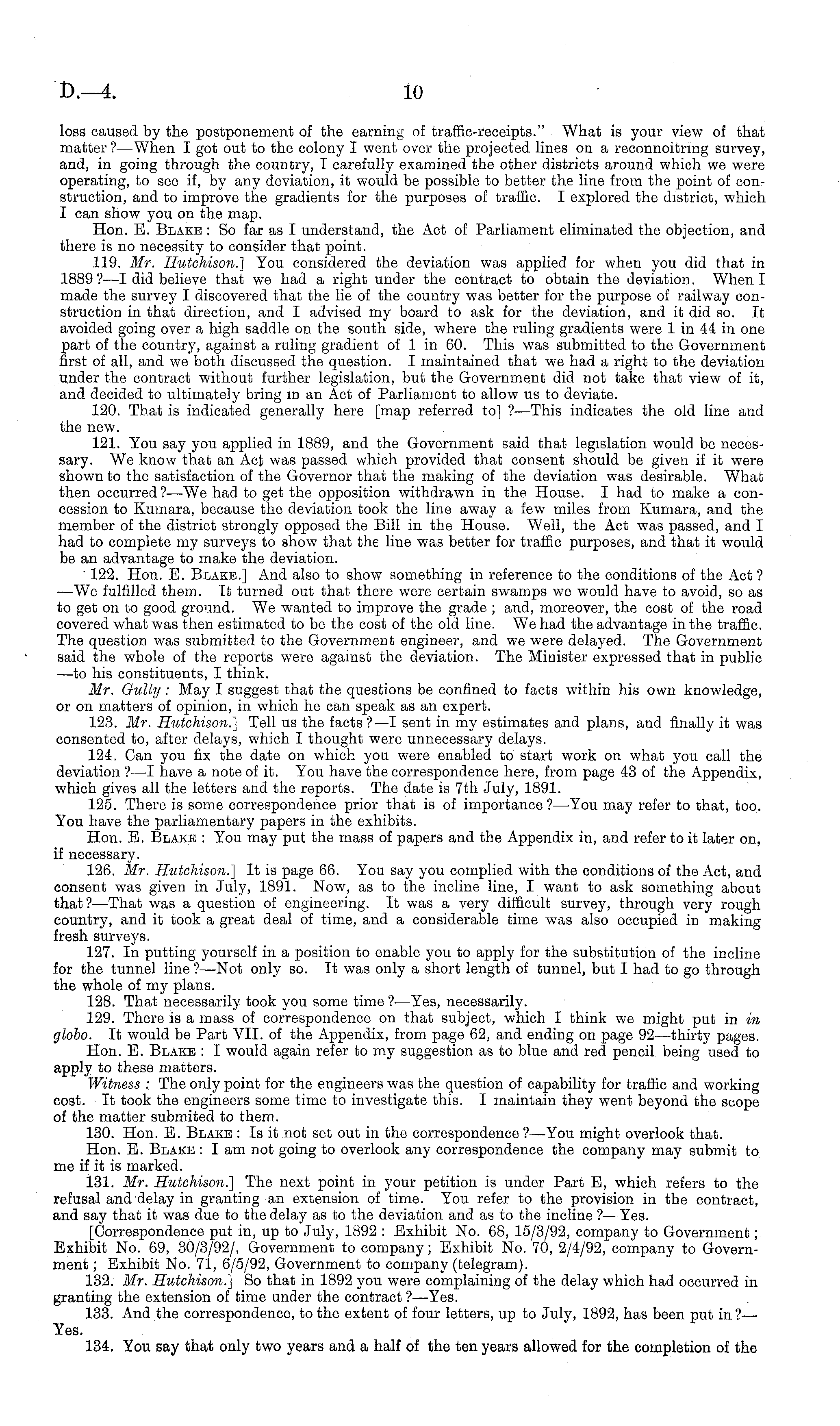 loss caused by the postponement of the earning of traffic-receipts." What is your view of that matter ? —When I got out to the colony I went over the projected lines on a reconnoitring survey, and, in going through the country, I carefully examined the other districts around which we were operating, to see if, by any deviation, it would be possible to better the line from the point of construction, and to improve the gradients for the purposes of traffic. I explored the district, which I can show you on the map. Hon. E. Blake : So far as I understand, the Act of Parliament eliminated the objection, and there is no necessity to consider that point. 119. Mr. Hutchison.] You considered the deviation was applied for when you did that in 1889 ?—I did believe that we had a right under the contract to obtain the deviation. When I made the survey I discovered that the lie of the country was better for the purpose of railway construction in that direction, and I advised my board to ask for the deviation, and it did so. It avoided going over a high saddle on the south side, where the ruling gradients were 1 in 44 in one part of the country, against a ruling gradient of 1 in 60. This was submitted to the Government first of all, and we both discussed the question. I maintained that we had a right to the deviation under the contract without further legislation, but the Government did not take that view of it, and decided to ultimately bring m an Act of Parliament to allow us to deviate. 120. That is indicated generally here [map referred to] ?—This indicates the old line and the new. 121. You say you applied in 1889, and the Government said that legislation would be necessary. We know that an Act was passed which provided that consent should be given if it were shown to the satisfaction of the Governor that the making of the deviation was desirable. What then occurred ?—We had to get the opposition withdrawn in the House. I had to make a concession to Kumara, because the deviation took the line away a few miles from Kumara, and the member of the district strongly opposed the Bill in the House. Well, the Act was passed, and I had to complete my surveys to show that the line was better for traffic purposes, and that it would be an advantage to make the deviation. ■ 122. Hon. E. Blake.] And also to show something in reference to the conditions of the Act ? —We fulfilled them. It turned out that there were certain swamps we would have to avoid, so as to get on to good ground. We wanted to improve the grade ; and, moreover, the cost of the road covered what was then estimated to be the cost of the old line. We had the advantage in the traffic. The question was submitted to the Government engineer, and we were delayed. The Government said the whole of the reports were against the deviation. The Minister expressed that in public —to his constituents, I think. Mr. Gully : May I suggest that the questions be confined to facts within his own knowledge, or on matters of opinion, in which he can speak as an expert. 123. Mr. Hutchison.] Tell us the facts ? —I sent in my estimates and plans, and finally it was consented to, after delays, which I thought were unnecessary delays. 124. Can you fix the date on which you were enabled to start work on what you call the deviation ?—I have a note of it. You have the correspondence here, from page 43 of the Appendix, which gives all the letters and the reports. The date is 7th July, 1891. 125. There is some correspondence prior that is of importance? —You may refer to that, too. You have the parliamentary papers in the exhibits. Hon. E. Blake : You may put the mass of papers and the Appendix in, and refer to it later on, if necessary. 126. Mr. Hutchison.] It is page 66. You say you complied with the conditions of the Act, and consent was given in July, 1891. Now, as to the incline line, I want to ask something about that?— That was a question of engineering. It was a very difficult survey, through very rough country, and it took a great deal of time, and a considerable time was also occupied in making fresh surveys. 127. In putting yourself in a position to enable you to apply for the substitution of the incline for the tunnel line ?—Not only so. It was only a short length of tunnel, but I had to go through the whole of my plans. 128. That necessarily took you some time ? —Yes, necessarily. 129. There is a mass of correspondence on that subject, which I think we might put in in globo. It would be Part VII. of the Appendix, from page 62, and ending on page 92—thirty pages. Hon. E. Blake : I would again refer to my suggestion as to blue and red pencil being used to apply to these matters. Witness : The only point for the engineers was the question of capability for traffic and working cost. It took the engineers some time to investigate this. I maintain they went beyond the scope of the matter submited to them. 130. Hon. E. Blake : Is it not set out in the correspondence ?—You might overlook that. Hon. E. Blake : I am not going to overlook any correspondence the company may submit to me if it is marked. 131. Mr. Hutchison.] The next point in your petition is under Part E, which refers to the refusal and delay in granting an extension of time. You refer to the provision in the contract, and say that it was due to the delay as to the deviation and as to the incline ?—Yes. [Correspondence put in, up to July, 1892 : Exhibit No. 68, 15/3/92, company to Government; Exhibit No. 69, 30/3/92/, Government to company; Exhibit No. 70, 2/4/92, company to Government ; Exhibit No. 71, 6/5/92, Government to company (telegram). 132. Mr. Hutchison.] So that in 1892 you were complaining of the delay which had occurred in granting the extension of time under the contract ?—Yes. 133. And the correspondence, to the extent of four letters, up to July, 1892, has been put in ?— Yes. 134. You say that only two years and a half of the ten years allowed for the comp