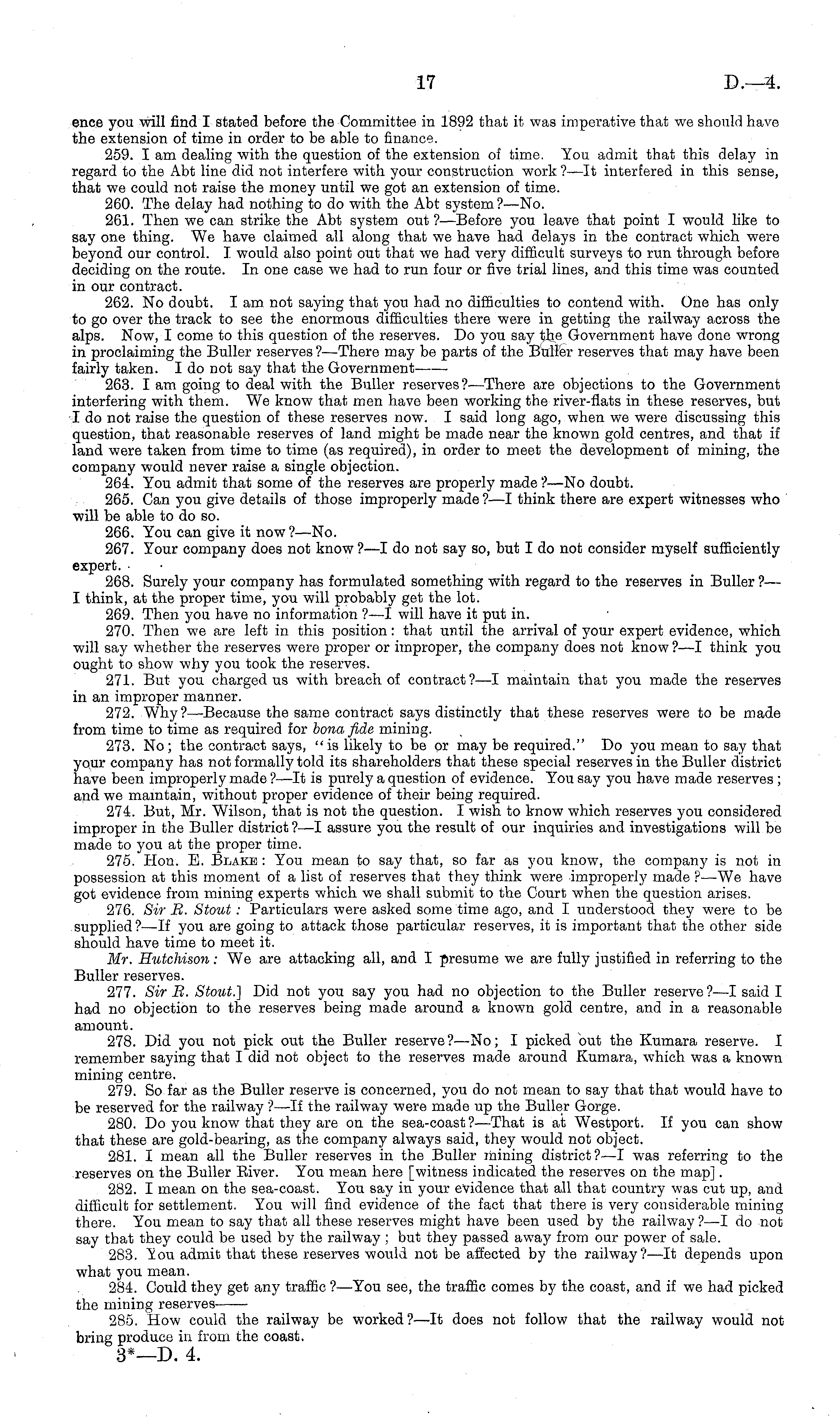 ence you will find I stated before the Committee in 1892 that it was imperative that we should have the extension of time in order to be able to finance. 259. lam dealing with the question of the extension of time. You admit that this delay in regard to the Abt line did not interfere with your construction work ? —lt interfered in this sense, that we could not raise the money until we got an extension of time. 260. The delay had nothing to do with the Abt system? —No. 261. Then we can strike the Abt system out ?—Before you leave that point I would like to say one thing. We have claimed all along that we have had delays in the contract which were beyond our control. I would also point out that we had very difficult surveys to run through before deciding on the route. In one case we had to run four or five trial lines, and this time was counted in our contract. 262. No doubt. lam not saying that you had no difficulties to contend with. One has only to go over the track to see the enormous difficulties there were in getting the railway across the alps. Now, I come to this question of the reserves. Do you say the Government have done wrong in proclaiming the Buller reserves ?—There may be parts of the Buller reserves that may have been fairly taken. Ido not say that the Government 263. lam going to deal with the Buller reserves?— There are objections to the Government interfering with them. We know that men have been working the river-flats in these reserves, but Ido not raise the question of these reserves now. I said long ago, when we were discussing this question, that reasonable reserves of land might be made near the known gold centres, and that if land were taken from time to time (as required), in order to meet the development of mining, the company would never raise a single objection. 264. You admit that some of the reserves are properly made ?—No doubt. 265. Can you give details of those improperly made ?—I think there are expert witnesses who will be able to do so. 266. You can give it now ?—No. 267. Your company does not know ? —I do not say so, but Ido not consider myself sufficiently expert. ■ 268. Surely your company has formulated something with regard to the reserves in Buller ?— I think, at the proper time, you will probably get the lot. 269. Then you have no information ?—I will have it put in. 270. Then we are left in this position: that until the arrival of your expert evidence, which will say whether the reserves were proper or improper, the company does not know ?—I think you ought to show why you took the reserves. 271. But you charged us with breach of contract?—l maintain that you made the reserves in an improper manner. 272. Why? —Because the same contract says distinctly that these reserves were to be made from time to time as required for bona fide mining. 273. No; the contract says, "is likely to be or may be required." Do you mean to say that your company has not formally told its shareholders that these special reserves in the Buller district have been improperly made ?—lt is purely a question of evidence. You say you have made reserves ; and we maintain, without proper evidence of their being required. 274. But, Mr. Wilson, that is not the question. I wish to know which reserves you considered improper in the Buller district ? —I assure you the result of our inquiries and investigations will be made to you at the proper time. 275. Hon. E. Blake : You mean to say that, so far as you know, the company is not in possession at this moment of a list of reserves that they think were improperly made ?—We have got evidence from mining experts which we shall submit to the Court when the question arises. 276. Sir R. Stotit : Particulars were asked some time ago, and I understood they were to be supplied?—lf you are going to attack those particular reserves, it is important that the other side should have time to meet it. Mr. Hutchison: We are attacking all, and I presume we are fully justified in referring to the Buller reserves. 277. Sir B. Stout.] Did not you say you had no objection to the Buller reserve? —I said I had no objection to the reserves being made around a known gold centre, and in a reasonable amount. 278. Did you not pick out the Buller reserve? —-No; I picked out the Kumara reserve. I remember saying that I did not object to the reserves made around Kumara, which was a known mining centre. 279. So far as the Buller reserve is concerned, you do not mean to say that that would have to be reserved for the railway ? —lf the railway were made up the Buller Gorge. 280. Do you know that they are on the sea-coast?— That is at Westport. If you can show that these are gold-bearing, as the company always said, they would not object. 281. I mean all the Buller reserves in the Buller mining district? —I was referring to the reserves on the Buller Eiver. You mean here [witness indicated the reserves on the map]. 282. I mean on the sea-coast. You say in your evidence that all that country was cut up, and difficult for settlement. You will find evidence of the fact that there is very considerable mining there. You mean to say that all these reserves might have been used by the railway?—l do not say that they could be used by the railway ; but they passed away from our power of sale. 283. You admit that these reserves would not be affected by the railway? —It depends upon what you mean. 284. Could they get any traffic ?—You see, the traffic comes by the coast, and if we had picked the mining reserves 285. How could the railway be worked?—lt does not follow that the railway would not bring produce in from the coast. 3*—D. 4.