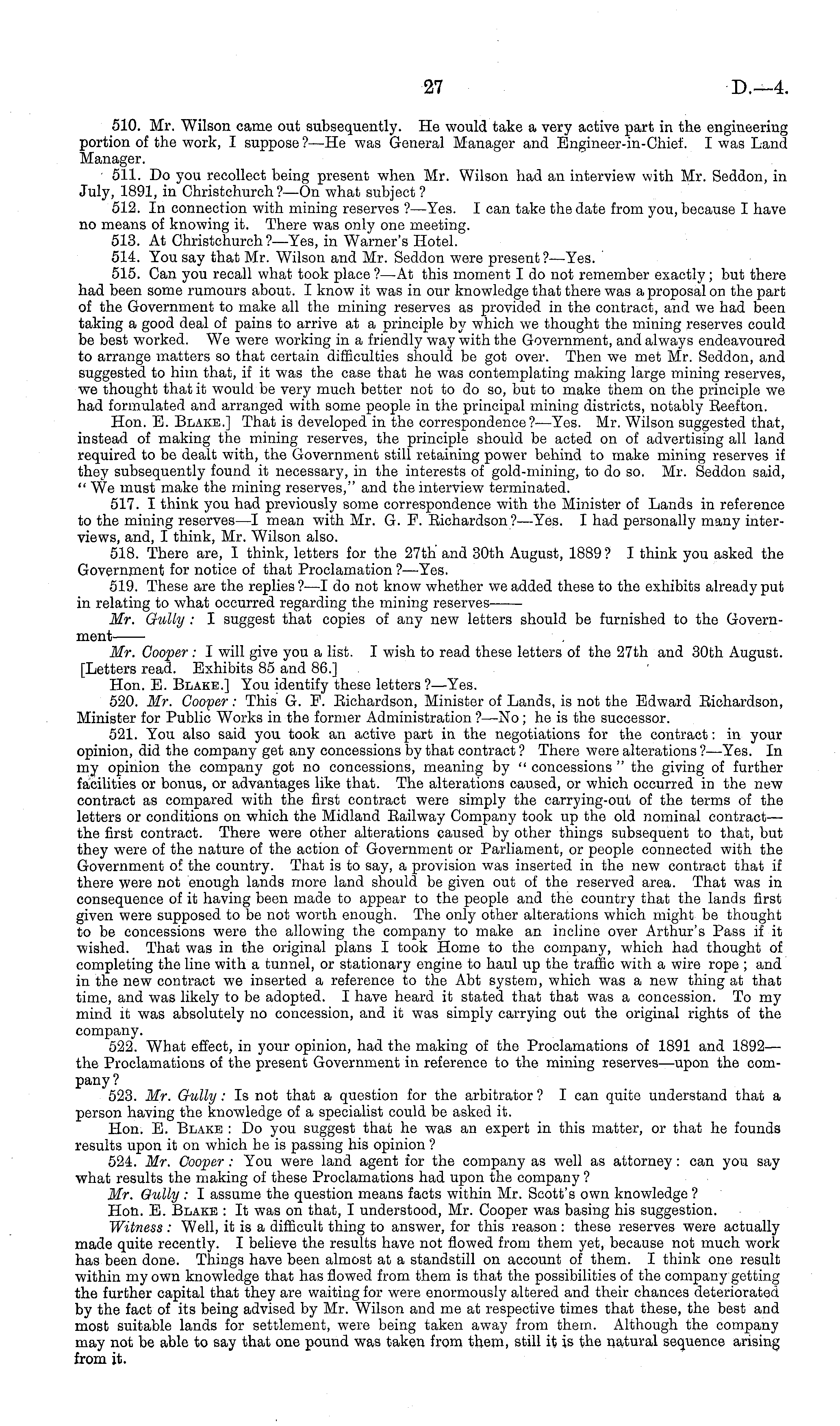 510. Mr. Wilson came out subsequently. He would take a very active part in the engineering portion of the work, I suppose ?—He was General Manager and Engineer-in-Chief. I was Land Manager. 511. Do you recollect being present when Mr. Wilson had an interview with Mr. Seddon, in July, 1891, in Christchurch ?—On what subject ? 512. In connection with mining reserves ?—Yes. I can take the date from you, because I have no means of knowing it. There was only one meeting. 513. At Christchurch ?—Yes, in Warner's Hotel. 514. You say that Mr. Wilson and Mr. Seddon were present? —Yes. 515. Can you recall what took place ?—At this moment Ido not remember exactly; but there had been some rumours about. I know it was in our knowledge that there was a proposal on the part of the Government to make all the mining reserves as provided in the contract, and we had been taking a good deal of pains to arrive at a principle by which we thought the mining reserves could be best worked. We were working in a friendly way with the Government, and always endeavoured to arrange matters so that certain difficulties should be got over. Then we met Mr. Seddon, and suggested to him that, if it was the case that he was contemplating making large mining reserves, we thought that it would be very much better not to do so, but to make them on the principle we had formulated and arranged with some people in the principal mining districts, notably Eeefton. Hon. E. Blake.] That is developed in the correspondence?— Yes. Mr. Wilson suggested that, instead of making the mining reserves, the principle should be acted on of advertising all land required to be dealt with, the Government still retaining power behind to make mining reserves if they subsequently found it necessary, in the interests of gold-mining, to do so. Mr. Seddon said, " We must make the mining reserves," and the interview terminated. 517. I think you had previously some correspondence with the Minister of Lands in reference to the mining reserves—l mean with Mr. G. F. Eichardson?—Yes. I had personally many interviews, and, I think, Mr. Wilson also. 518. There are, I think, letters for the 27th' and 30th August, 1889 ? I think you asked the Government for notice of that Proclamation ? —Yes. 519. These are the replies ?—I do not know whether we added these to the exhibits already put in relating to what occurred regarding the mining reserves Mr. Gully : I suggest that copies of any new letters should be furnished to the Government Mr. Cooper : I will give you a list. I wish to read these letters of the 27th and 30th August. [Letters read. Exhibits 85 and 86.] Hon. E. Blake.] You identify these letters ?—Yes. 520. Mr. Cooper: This G. F. Eichardson, Minister of Lands, is not the Edward Eichardson, Minister for Public Works in the former Administration ?—No; he is the successor. 521. You also said you took an active part in the negotiations for the contract: in your opinion, did the company get any concessions by that contract ? There were alterations ?—Yes. In my opinion the company got no concessions, meaning by " concessions " the giving of further facilities or bonus, or advantages like that. The alterations caused, or which occurred in the new contract as compared with the first contract were simply the carrying-out of the terms of the letters or conditions on which the Midland Eailway Company took up the old nominal contract— the first contract. There were other alterations caused by other things subsequent to that, but they were of the nature of the action of Government or Parliament, or people connected with the Government of the country. That is to say, a provision was inserted in the new contract that if there were not enough lands more land should be given out of the reserved area. That was in consequence of it having been made to appear to the people and the country that the lands first given were supposed to be not worth enough. The only other alterations which might be thought to be concessions were the allowing the company to make an incline over Arthur's Pass if it wished. That was in the original plans I took Home to the company, which had thought of completing the line with a tunnel, or stationary engine to haul up the traffic with a wire rope ; and in the new contract we inserted a reference to the Abt system, which was a new thing at that time, and was likely to be adopted. I have heard it stated that that was a concession. To my mind it was absolutely no concession, and it was simply carrying out the original rights of the company. 522. What effect, in your opinion, had the making of the Proclamations of 1891 and 1892— the Proclamations of the present Government in reference to the mining reserves—upon the company? 523. Mr. Gully: Is not that a question for the arbitrator ? I can quite understand that a person having the knowledge of a specialist could be asked it. Hon. E. Blake : Do you suggest that he was an expert in this matter, or that he founds results upon it on which he is passing his opinion ? 524. Mr. Cooper: You were land agent for the company as well as attorney: can you say what results the making of these Proclamations had upon the company ? Mr. Oully : I assume the question means facts within Mr. Scott's own knowledge ? Hon. E. Blake : It was on that, I understood, Mr. Cooper was basing his suggestion. Witness : Well, it is a difficult thing to answer, for this reason : these reserves were actually made quite recently. I believe the results have not flowed from them yet, because not much work has been done. Things have been almost at a standstill on account of them. I think one result within my own knowledge that has flowed from them is that the possibilities of the company getting the further capital that they are waiting for were enormously altered and their chances deteriorated by the fact of its being advised by Mr. Wilson and me at respective times that these, the best and most suitable lands