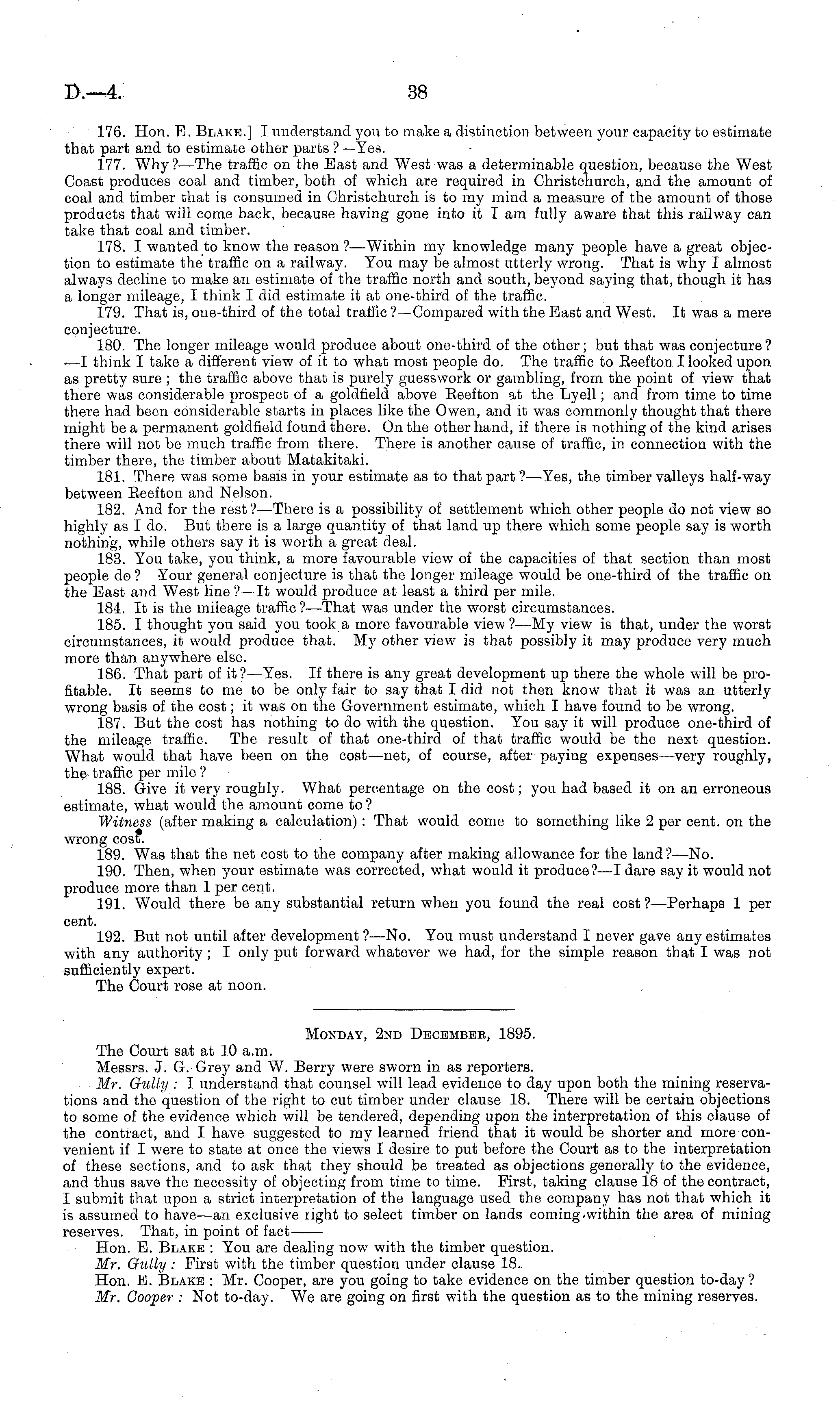 Monday, 2nd Decembbe, 1895. The Court sat at 10 a.m. Messrs. J. G. Grey and W. Berry were sworn in as reporters. Mr. Gully : I understand that counsel will lead evidence to day upon both the mining reservations and the question of the right to cut timber under clause 18. There will be certain objections to some of the evidence which will be tendered, depending upon the interpretation of this clause of the contract, and I have suggested to my learned friend that it would be shorter and more convenient if I were to state at once the views I desire to put before the Court as to the interpretation of these sections, and to ask that they should be treated as objections generally to the evidence, and thus save the necessity of objecting from time to time. First, taking clause 18 of the contract, I submit that upon a strict interpretation of the language used the company has not that which it is assumed to have—an exclusive right to select timber on lands coming-within the area of mining reserves. That, in point of fact Hon. B. Blake : You are dealing now with the timber question. Mr. Gully : First with the timber question under clause 18.. Hon. E. Blake : Mr. Cooper, are you going to take evidence on the timber question to-day? Mr. Cooper : Not to-day. We are going on first with the question as to the mining reserves.