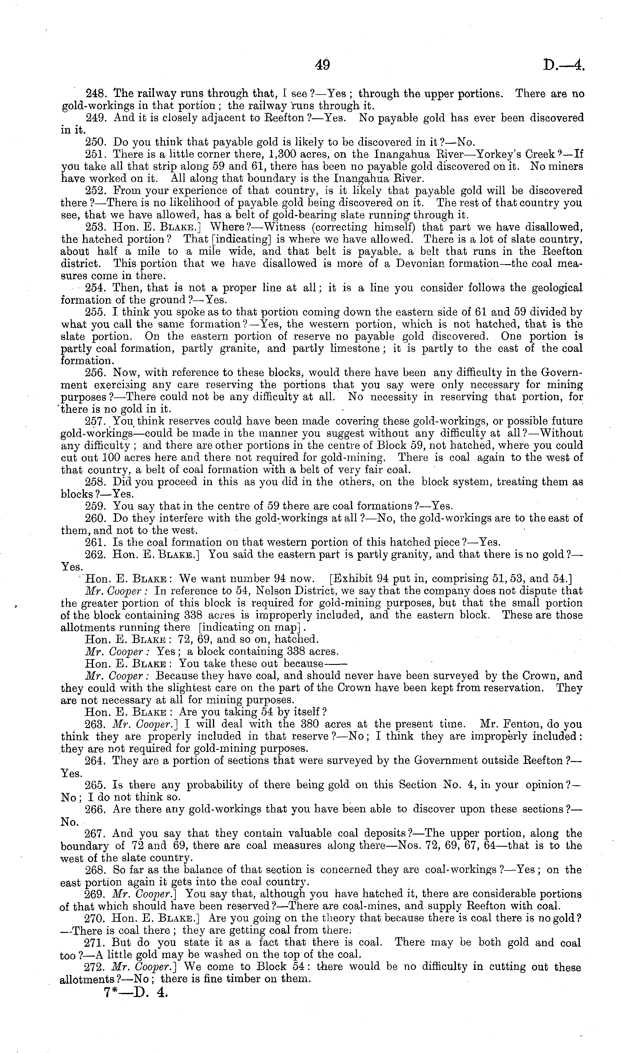 248. The railway runs through that, i see ?—Yes ; through the upper portions. There are no gold-workings in that portion ; the railway runs through it. 249. And it is closely adjacent to Eeefton ?—Yes. No payable gold has ever been discovered in it. 250. Do you think that payable gold is likely to be discovered in it ?—No. 251. There is a little corner there, 1,300 acres, on the Inangahua River —Yorkey's Creek ?—- If you take all that strip along 59 and 61, there has been no payable gold discovered on it. No miners have worked on it. All along that boundary is the Inangahua Eiver. 252. From your experience of that country, is it likely that payable gold will be discovered there ? —There, is no likelihood of payable gold being discovered on it. The rest of that country you see, that we have allowed, has a belt of gold-bearing slate running" through it. 253. Hon. E. Blake.] Where?— Witness (correcting himself) that part we have disallowed, the hatched portion ? That [indicating] is where we have allowed. There is a lot of slate country, about half a mile to a mile wide, and that belt is payable, a belt that runs in the Reefton district. This portion that we have disallowed is more of a Devonian formation—the coal measures come in there. 254. Then, that is not a proper line at all; it is a line you consider follows the geological formation of the ground ?—Yes. 255. I think you spoke as to that portion coming down the eastern side of 61 and 59 divided by what you call the same formation?— Yes, the western portion, which is not hatched, that is the slate portion. On the eastern portion of reserve no payable gold discovered. One portion is partly coal formation, partly granite, and partly limestone ; it is partly to the east of the coal formation. 256. Now, with reference to these blocks, would there have been any difficulty in the Government exercising any care reserving the portions that you say were only necessary for mining purposes ? —There could not be any difficulty at all. No necessity in reserving that portion, for 'there is no gold in it. 257. You think reserves could have been made covering these gold-workings, or possible future gold-workings —could be made in the manner you suggest without any difficulty at all?— Without any difficulty ; and there are other portions in the centre of Block 59, not hatched, where you could cut out 100 acres here and there not required for gold-mining. There is coal again to the west of that country, a belt of coal formation with a belt of very fair coal. 258. Did you proceed in this as you did in the others, on the block system, treating them as blocks ?—Yes. 259. You say that in the centre of 59 there are coal formations ?—Yes. 260. Do they interfere with the gold-workings at all ? —No, the gold-workings are to the east of them, and not to the west. 261. Is the coal formation on that western portion of this hatched piece?— Yes. 262. Hon. E. Blake.] You said the eastern part is partly granity, and that there is no gold?— Yes. Hon. E. Blake :We want number 94 now. [Exhibit 94 put in, comprising 51, 53, and 54.] Mr. Cooper : In reference to 54, Nelson District, we say that the company does not dispute that the greater portion of this block is required for gold-mining purposes, but that the small portion of the block containing 338 acres is improperly included, and the eastern block. These are those allotments running there [indicating on map]. Hon. E. Blake : 72, 69, and so on, hatched. Mr. Cooper : Yes ; a block containing 338 acres. Hon. E. Blake : You take these out because Mr. Cooper : Because they have coal, and should never have been surveyed by the Crown, and they could with the slightest care on the part of the Crown have been kept from reservation. They are not necessary at all for mining purposes. Hon. E. Blake : Are you taking 54 by itself ? 263. Mr. Cooper.'] I will deal with the 380 acres at the present time. Mr. Fenton, do you think they are properly included in that reserve ?—No; I think they are improperly included : they are not required for gold-mining purposes. 264. They are a portion of sections that were surveyed by the Government outside Reefton ?— Yes. 265. Is there any probability of there being gold on this Section No. 4, in your opinion?— No ; I do not think so. 266. Are there any gold-workings that you have been able to discover upon these sections ? — No. 267. And you say that they contain valuable coal deposits?— The upper portion, along the boundary of 72 and 69, there are coal measures along there—Nos. 72, 69, 67, 64—that is to the west of the slate country. 268. So far as the balance of that section is concerned they are coal-workings ?—Yes; on the east portion again it gets into the coal country. 269. Mr. Cooper.] You say that, although you have hatched it, there are considerable portions of that which should have been reserved?— There are coal-mines, and supply Reefton with coal. 270. Hon. E. Blake.] Are you going on the theory that because there is coal there is no gold? —There is coal there ; they are getting coal from there. 271. But do you state it as a fact that there is coal. There may be both gold and coal too ?—A little gold may be washed on the top of the coal. 272. Mr. Cooper.'] We come to Block 54: there would be no difficulty in cutting out these allotments? —No; there is fine timber on them. 7*—D. 4.