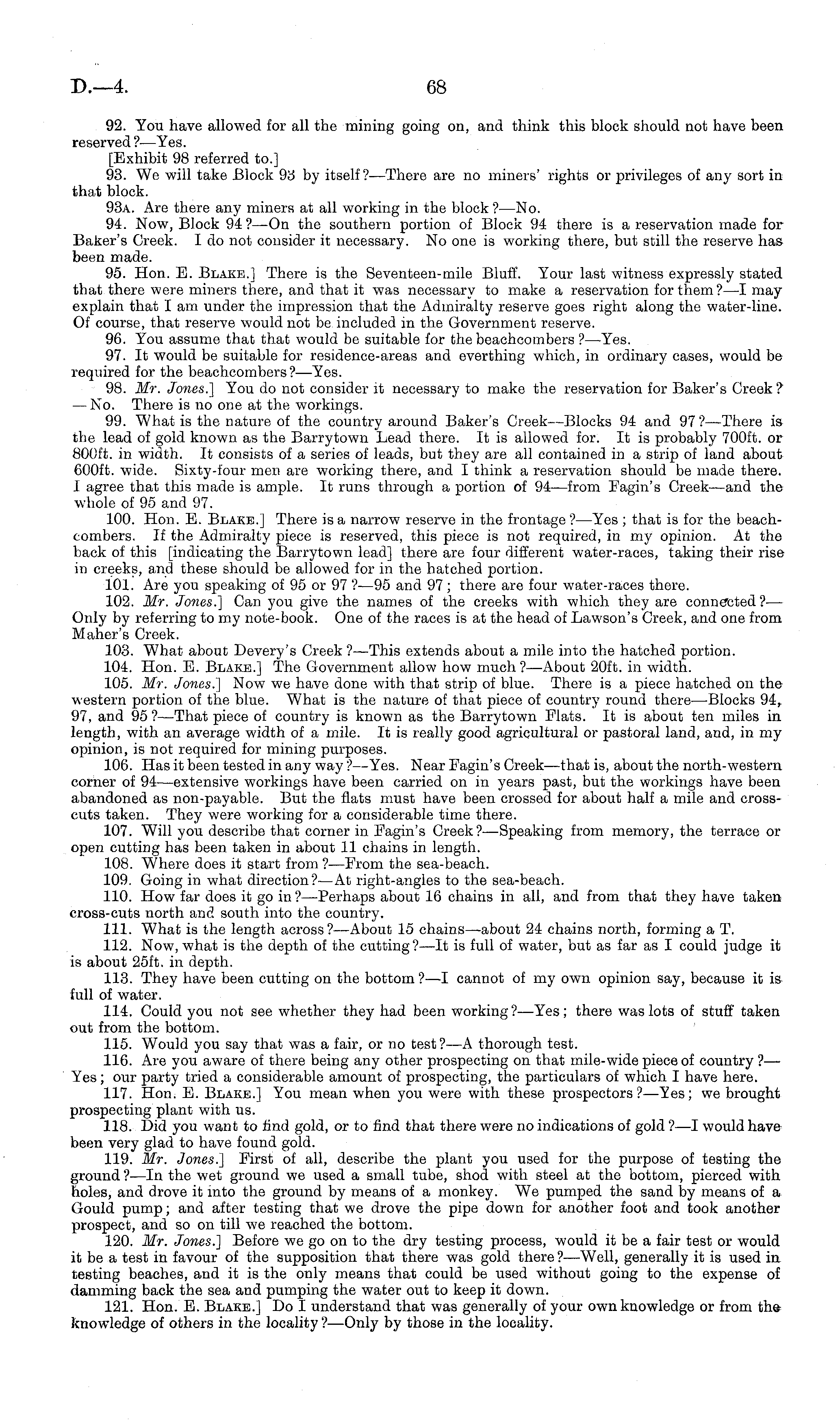 92. You have allowed for all the mining going on, and think this block should not have been reserved ? —Yes. [Exhibit 98 referred to.] 93. We will take Block 93 by itself?— There are no miners' rights or privileges of any sort in that block. 93a. Are there any miners at all working in the block ? —No. 94. Now, Block 94 ? —On the southern portion of Block 94 there is a reservation made for Baker's Creek. Ido not consider it necessary. No one is working there, but still the reserve has been made. 95. Hon. E. Blake.] There is the Seventeen-mile Bluff. Your last witness expressly stated that there were miners there, and that it was necessary to make a reservation for them? —I may explain that I am under the impression that the Admiralty reserve goes right along the water-line. Of course, that reserve would not be included in the Government reserve. 96. You assume that that would be suitable for the beachcombers ?—Yes. 97. It would be suitable for residence-areas and everthing which, in ordinary cases, would be required for the beachcombers ? —Yes. 98. Mr. Jones.] You do not consider it necessary to make the reservation for Baker's Creek? — No. There is no one at the workings. 99. What is the nature of the country around Baker's Creek—Blocks 94 and 97?— There is the lead of gold known as the Barrytown Lead there. It is allowed for. It is probably 700 ft. or 800 ft. in width. It consists of a series of leads, but they are all contained in a strip of land about 600 ft. wide. Sixty-four men are working there, and I think a reservation should be made there. I agree that this made is ample. It runs through a portion of 94—from Fagin's Creek —and the whole of 95 and 97. 100. Hon. E. Blake.] There is a narrow reserve in the frontage ? —Yes ; that is for the beachcombers. If the Admiralty piece is reserved, this piece is not required, in my opinion. At the back of this [indicating the Barrytown lead] there are four different water-races, taking their rise in creeks, and these should be allowed for in the hatched portion. 101. Are you speaking of 95 or 97 ?—95 and 97 ; there are four water-races there. 102. Mr. Jones.] Can you give the names of the creeks with which they are connected? — Only by referring to my note-book. One of the races is at the head of Lawson's Creek, and one from Maher's Creek. 103. What about Devery's Creek?— This extends about a mile into the hatched portion. 104. Hon. E. Blake.] The Government allow how much?— About 20ft. in width. 105. Mr. Jones.] Now we have done with that strip of blue. There is a piece hatched on the western portion of the blue. What is the nature of that piece of country round there —Blocks 94, 97, and 95 ?—That piece of country is known as the Barrytown Plats. It is about ten miles in length, with an average width of a mile. It is really good agricultural or pastoral land, and, in my opinion, is not required for mining purposes. 106. Has it been tested in any way ?—Yes. Near Fagin's Creek—that is, about the north-western corner of 94 —extensive workings have been carried on in years past, but the workings have been abandoned as non-payable. But the flats must have been crossed for about half a mile and crosscuts taken. They were working for a considerable time there. 107. Will you describe that corner in Fagin's Creek? —Speaking from memory, the terrace or open cutting has been taken in about 11 chains in length. 108. Where does it start from?— From the sea-beach. 109. Going in what direction?—At right-angles to the sea-beach. 110. How far does it go in ?—Perhaps about 16 chains in all, and from that they have taken cross-cuts north and south into the country. 111. What is the length across? —About 15 chains —about 24 chains north, forming a T. 112. Now, what is the depth of the cutting?—lt is full of water, but as far as I could judge it is about 25ft. in depth. 113. They have been cutting on the bottom ?—I cannot of my own opinion say, because it isfull of water. 114. Could you not see whether they had been working?— Yes; there was lots of stuff taken out from the bottom. 115. Would you say that was a fair, or no test? —A thorough test. 116. Are you aware of there being any other prospecting on that mile-wide piece of country ?— Yes; our party tried a considerable amount of prospecting, the particulars of which I have here. 117. Hon. E. Blake.] You mean when you were with these prospectors? —Yes; we brought prospecting plant with us. 118. Did you want to find gold, or to find that there were no indications of gold ?—I would have been very glad to have found gold. 119. Mr. Jones.] First of all, describe the plant you used for the purpose of testing the ground ? —ln the wet ground we used a small tube, shod with steel at the bottom, pierced with holes, and drove it into the ground by means of a monkey. We pumped the sand by means of a Gould pump; and after testing that we drove the pipe down for another foot and took another prospect, and so on till we reached the bottom. 120. Mr. Jones.] Before we go on to the dry testing process, would it be a fair test or would it be a test in favour of the supposition that there was gold there ?—Well, generally it is used in testing beaches, and it is the only means that could be used without going to the expense of damming back the sea and pumping the water out to keep it down. 121. Hon. E. Blake.] Do I understand that was generally of your own knowledge or from the knowledge of others in the locality ?—Only by those in the locality.