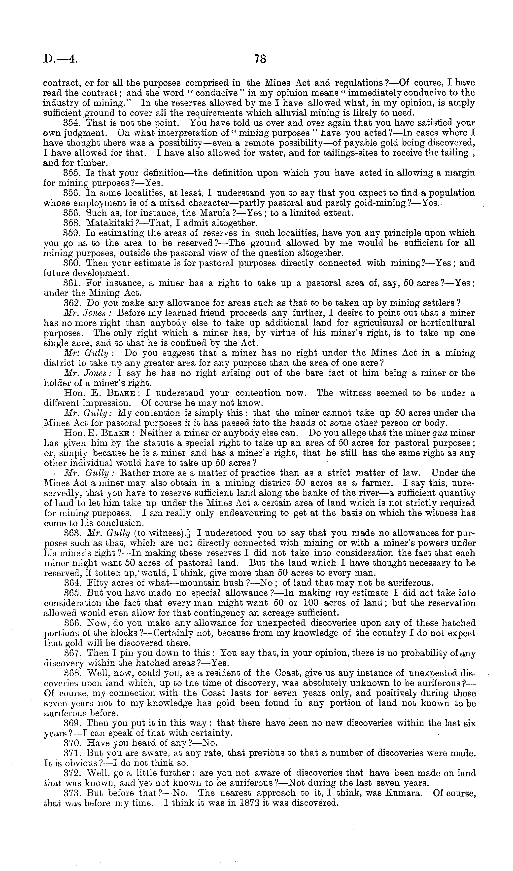 contract, or for all the purposes comprised in the Mines Act and regulations ?—Of course, I have read the contract; and the word " conducive "in my opinion means " immediately conducive to the industry of mining." In the reserves allowed by me I have allowed what, in my opinion, is amply sufficient ground to cover all the requirements which alluvial mining is likely to need. 354. That is not the point. You have told us over and over again that you have satisfied your own judgment. On what interpretation of " mining purposes " have you acted? —In cases where I have thought there was a possibility—even a remote possibility—of payable gold being discovered, I have allowed for that. I have also allowed for water, and for tailings-sites to receive the tailing , and for timber. 355. Is that your definition—the definition upon which you have acted in allowing a margin for mining purposes? —Yes. 356. In some localities, at least, I understand you to say that you expect to find a population whose employment is of a mixed character—partly pastoral and partly gold-mining? —'Yes.. 356. Such as, for instance, the Maruia?—Yes; to a limited extent. 358. Matakitaki ?—That, I admit altogether. 359. In estimating the areas of reserves in such localities, have you any principle upon which you go as to the area to be reserved ?—The ground allowed by me would be sufficient for all mining purposes, outside the pastoral view of the question altogether. 360. Then your estimate is for pastoral purposes directly connected with mining?— Yes; and future development. 361. For instance, a miner has a right to take up a pastoral area of, say, 50 acres?— Yes; under the Mining Act. 362. Do you make any allowance for areas such as that to be taken up by mining settlers ? Mr. Jones : Before my learned friend proceeds any further, I desire to point out that a miner has no more right than anybody else to take up additional land for agricultural or horticultural purposes. The only right which a miner has, by virtue of his miner's right, is to take up one single acre, and to that he is confined by the Act. Mr: Gully: Do you suggest that a miner has no right under the Mines Act in a mining district to take up any greater area for any purpose than the area of one acre ? Mr. Jones: I say he has no right arising out of the bare fact of him being a miner or the holder of a miner's right. Hon. B. Blake : I understand your contention now. The witness seemed to be under a different impression. Of course he may not know. Mr. Gully: My contention is simply this : that the miner cannot take up 50 acres under the Mines Act for pastoral purposes if it has passed into the hands of some other person or body. Hon. E. Blake : Neither a miner or anybody else can. Do you allege that the miner qua miner has given him by the statute a special right to take up an area of 50 acres for pastoral purposes; or, simply because he is a miner and has a miner's right, that he still has the same right as any other individual would have to take up 50 acres ? Mr. Gully : Bather more as a matter of practice than as a strict matter of law. Under the Mines Act a miner may also obtain in a mining district 50 acres as a farmer. I say this, unreservedly, that you have to reserve sufficient land along the banks of the river—a sufficient quantity of land to let him take up under the Mines Act a certain area of land which is not strictly required for mining purposes. lam really only endeavouring to get at the basis on which the witness has come to his conclusion. 363. Mr. Gully (to witness).] I understood you to say that you made no allowances for purposes such as that, which are not directly connected with mining or with a miner's powers under his miner's right ?—ln making these reserves I did not take into consideration the fact that each miner might want 50 acres of pastoral land. But the land which I have thought necessary to be reserved, if totted up,'would, I think, give more than 50 acres to every man. 364. Fifty acres of what —mountain bush ? —No; of land that may not be auriferous. 365. But you have made no special allowance ? —ln making my estimate I did not take into consideration the fact that every man might want 50 or 100 acres of land; but the reservation allowed would even allow for that contingency an acreage sufficient. 366. Now, do you make any allowance for unexpected discoveries upon any of these hatched portions of the blocks ?—Certainly not, because from my knowledge of the country I do not expect that gold will be discovered there. 367. Then I pin you down to this : You say that, in your opinion, there is no probability of any discovery within the hatched areas?— Yes. 368. Well, now, could you, as a resident of the Coast, give us any instance of unexpected discoveries upon land which, up to the time of discovery, was absolutely unknown to be auriferous?— Of course, my connection with the Coast lasts for seven years only, and positively during those seven years not to my knowledge has gold been found in any portion of land not known to be auriferous before. 369. Then you put it in this way : that there have been no new discoveries within the last six years ?—I can speak of that with certainty. 370. Have you heard of any?— No. 371. But you are aware, at any rate, that previous to that a number of discoveries were made. It is obvious? —I do not think so. 372. Well, go a little further : are you not aware of discoveries that have been made on land that was known, and'yet not known to be auriferous?— Not during the last seven years. 373. But before that?—-No. The nearest approach to it, I think, was Kumara. Of course, that was before my time. I think it was in 1872 it was discovered.