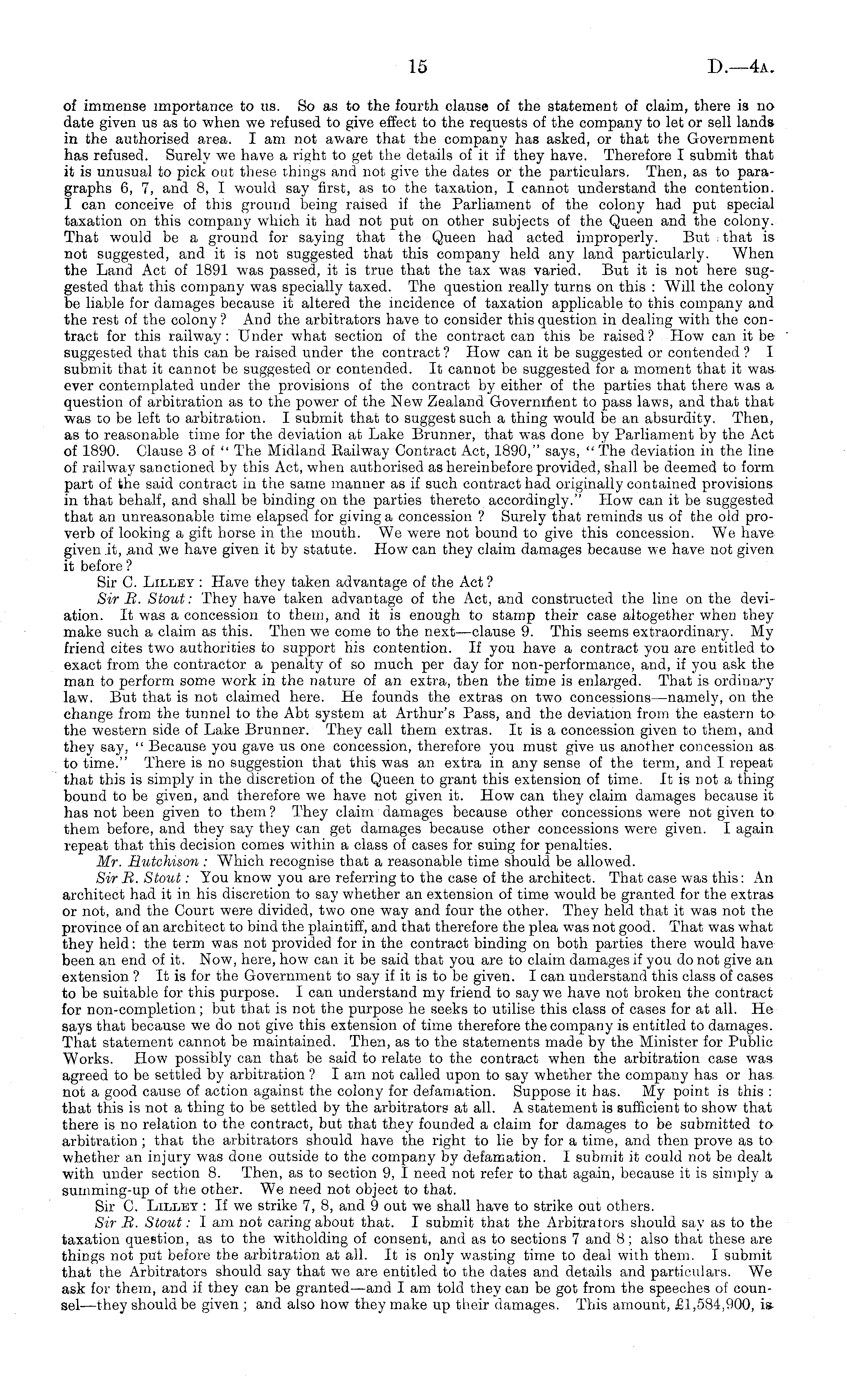 of immense importance to us. So as to the fourth clause of the statement of claim, there is no date given us as to when we refused to give effect to the requests of the company to let or sell lands in the authorised area. I am not aware that the company has asked, or that the Government has refused. Surely we have a right to get the details of it if they have. Therefore I submit that it is unusual to pick out these things and not give the dates or the particulars. Then, as to paragraphs 6, 7, and 8, I would say first, as to the taxation, I cannot understand the contention. I can conceive of this ground being raised if the Parliament of the colony had put special taxation on this company which it had not put on other subjects of the Queen and the colony. That would be a ground for saying that the Queen had acted improperly. But that is not suggested, and it is not suggested that this company held any land particularly. When the Land Act of 1891 was passed, it is true that the tax was varied. But it is not here suggested that this company was specially taxed. The question really turns on this : Will the colony be liable for damages because it altered the incidence of taxation applicable to this company and the rest of the colony ? And the arbitrators have to consider this question in dealing with the contract for this railway: Under what section of the contract can this be raised? How can it be suggested that this can be raised under the contract ? How can it be suggested or contended ? I submit that it cannot be suggested or contended. It cannot be suggested for a moment that it was ever contemplated under the provisions of the contract by either of the parties that there was a question of arbitration as to the power of the New Zealand Government to pass laws, and that that was to be left to arbitration. I submit that to suggest such a thing would be an absurdity. Then, as to reasonable time for the deviation at Lake Brunner, that was done by Parliament by the Act of 1890. Clause 3of " The Midland Bailway Contract Act, 1890," says, " The deviation in the line of railway sanctioned by this Act, when authorised as hereinbefore provided, shall be deemed to form part of the said contract in the same manner as if such contract had originally contained provisions in that behalf, and shall be binding on the parties thereto accordingly." How can it be suggested that an unreasonable time elapsed for giving a concession ? Surely that reminds us of the old proverb of looking a gift horse in the mouth. We were not bound to give this concession. We have given .it, and .we have given it by statute. How can they claim damages because we have not given it before ? Sir C. Lilley : Have they taken advantage of the Act ? Sir B. Stout: They have taken advantage of the Act, and constructed the line on the deviation. It was a concession to them, and it is enough to stamp their case altogether when they make such a claim as this. Then we come to the next—clause 9. This seems extraordinary. My friend cites two authorities to support his contention. If you have a contract you are entitled to exact from the contractor a penalty of so much per day for non-performance, and, if you ask the man to perform some work in the nature of an extra, then the time is enlarged. That is ordinary law. But that is not claimed here. He founds the extras on two concessions—namely, on the change from the tunnel to the Abt system at Arthur's Pass, and the deviation from the eastern to the western side of Lake Brunner. They call them extras. It is a concession given to them, and they say, " Because you gave us one concession, therefore you must give us another concession as to time." There is no suggestion that this was an extra in any sense of the term, and I repeat that this is simply in the discretion of the Queen to grant this extension of time. It is not a thing bound to be given, and therefore we have not given it. How can they claim damages because it has not been given to them ? They claim damages because other concessions were not given to them before, and they say they can get damages because other concessions were given. I again repeat that this decision comes within a class of cases for suing for penalties. Mr. Hutchison: Which recognise that a reasonable time should be allowed. Sir B. Stout: You know you are referring to the case of the architect. That case was this: An architect had it in his discretion to say whether an extension of time would be granted for the extras or not, and the Court were divided, two one way and four the other. They held that it was not the province of an architect to bind the plaintiff, and that therefore the plea was not good. That was what they held: the term was not provided for in the contract binding on both parties there would have been an end of it. Now, here, how can it be said that you are to claim damages if you do not give an extension ? It is for the Government to say if it is to be given. I can understand this class of cases to be suitable for this purpose. I can understand my friend to say we have not broken the contract for non-completion; but that is not the purpose he seeks to utilise this class of cases for at all. He says that because we do not give this extension of time therefore the company is entitled to damages. That statement cannot be maintained. Then, as to the statements made by the Minister for PublicWorks. How possibly can that be said to relate to the contract when the arbitration ease was agreed to be settled by arbitration ? lam not called upon to say whether the company has or has not a good cause of action against the colony for defamation. Suppose it has. My point is this : that this is not a thing to be settled by the arbitrators at all. A statement is sufficient to show that there is no relation to the contract, but that they founded a claim for damages to be submitted to arbitration ; that the arbitrators should have the right to lie by for a time, and 