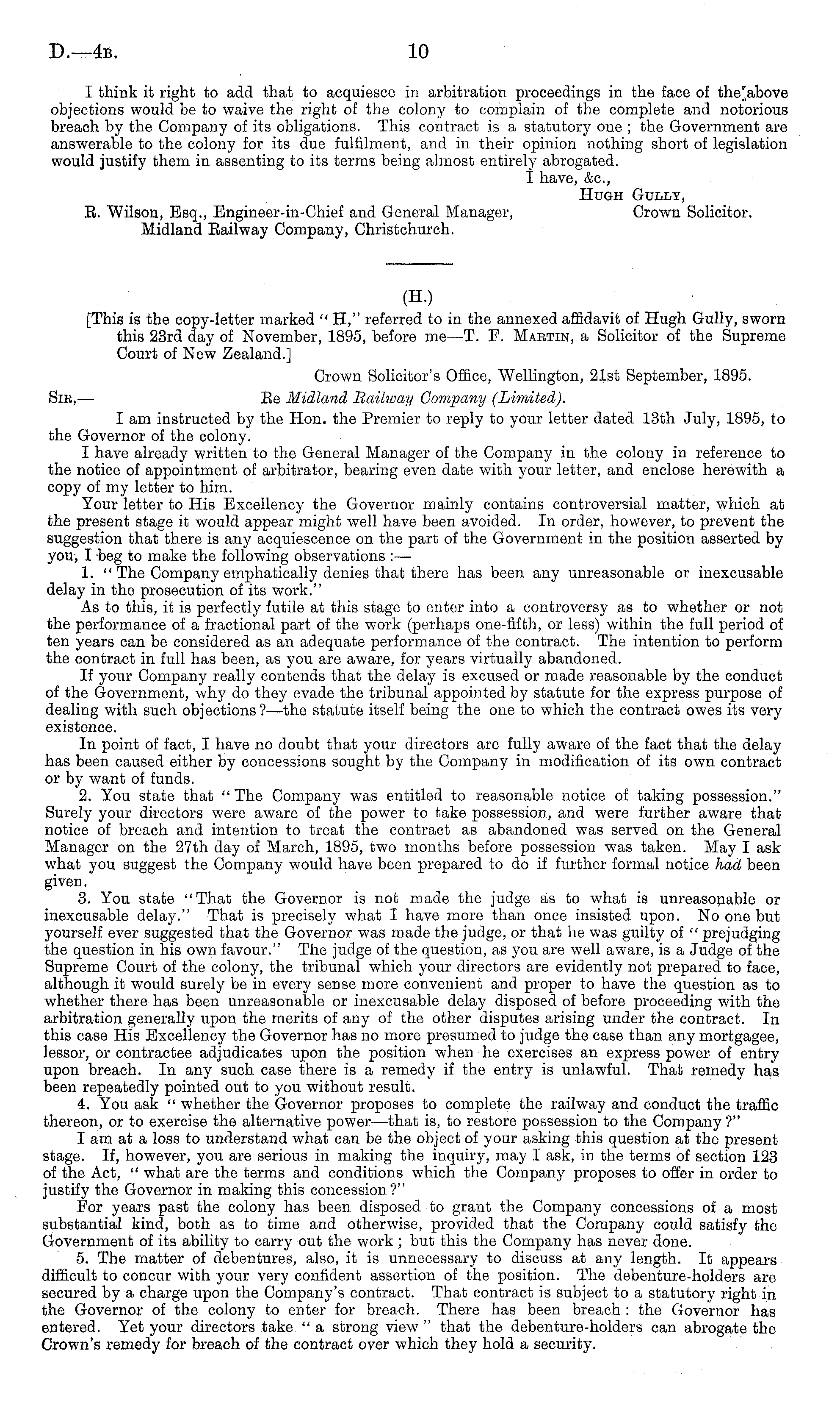 (H.) [This is the copy-letter marked " H," referred to in the annexed affidavit of Hugh Gully, sworn this 23rd day of November, 1895, before me—T. F. Maetin, a Solicitor of the Supreme Court of New Zealand.] Crown Solicitor's Office, Wellington, 21st September, 1895. Sic, — Be Midland Railway Company (Limited). I am instructed by the Hon. the Premier to reply to your letter dated 13th July, 1895, to the Governor of the colony. I have already written to the General Manager of the Company in the colony in reference to the notice of appointment of arbitrator, bearing even date with your letter, and enclose herewith a copy of my letter to him. Your letter to His Excellency the Governor mainly contains controversial matter, which at the present stage it would appear might well have been avoided. In order, however, to prevent the suggestion that there is any acquiescence on the part of the Government in the position asserted by you, I beg to make the following observations : — 1. " The Company emphatically denies that there has been any unreasonable or inexcusable delay in the prosecution of its work." As to this, it is perfectly futile at this stage to enter into a controversy as to whether or not the performance of a fractional part of the work (perhaps one-fifth, or less) within the full period of ten years can be considered as an adequate performance of the contract. The intention to perform the contract in full has been, as you are aware, for years virtually abandoned. If your Company really contends that the delay is excused or made reasonable by the conduct of the Government, why do they evade the tribunal appointed by statute for the express purpose of dealing with such objections? —the statute itself being the one to which the contract owes its very existence. In point of fact, I have no doubt that your directors are fully aware of the fact that the delay has been caused either by concessions sought by the Company in modification of its own contract or by want of funds. 2. You state that "The Company was entitled to reasonable notice of taking possession." Surely your directors were aware of the power to take possession, and were further aware that notice of breach and intention to treat the contract as abandoned was served on the General Manager on the 27th day of March, 1895, two months before possession was taken. May I ask what you suggest the Company would have been prepared to do if further formal notice had been given. 3. You state "That the Governor is not made the judge as to what is unreasonable or inexcusable delay." That is precisely what I have more than once insisted upon. No one but yourself ever suggested that the Governor was made the judge, or that he was guilty of " prejudging the question in his own favour." The judge of the question, as you are well aware, is a Judge of the Supreme Court of the colony, the tribunal which your directors are evidently not prepared to face, although it would surely be in every sense more convenient and proper to have the question as to whether there has been unreasonable or inexcusable delay disposed of before proceeding with the arbitration generally upon the merits of any of the other disputes arising under the contract. In this case His Excellency the Governor has no more presumed to judge the case than any mortgagee, lessor, or contractee adjudicates upon the position when he exercises an express power of entry upon breach. In any such case there is a remedy if the entry is unlawful. That remedy has been repeatedly pointed out to you without result. 4. You ask " whether the Governor proposes to complete the railway and conduct the traffic thereon, or to exercise the alternative power—that is, to restore possession to the Company ?" I am at a loss to understand what can be the object of your asking this question at the present stage. If, however, you are serious in making the inquiry, may I ask, in the terms of section 123 of the Act, " what are the terms and conditions which the Company proposes to offer in order to justify the Governor in making this concession?" For years past the colony has been disposed to grant the Company concessions of a most substantial kind, both as to time and otherwise, provided that the Company could satisfy the Government of its ability to carry out the work ; but this the Company has never done. 5. The matter of debentures, also, it is unnecessary to discuss at any length. It appears difficult to concur with your very confident assertion of the position. The debenture-holders are secured by a charge upon the Company's contract. That contract is subject to a statutory right in the Governor of the colony to enter for breach. There has been breach : the Governor has entered. Yet your directors take " a strong view " that the debenture-holders can abrogate the Crown's remedy for breach of the contract over which they hold a security.
