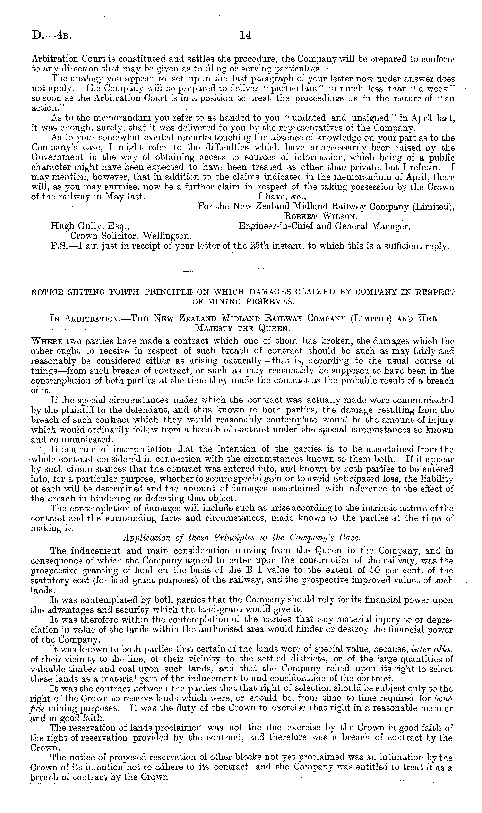 NOTICE SETTING FORTH PRINCIPLE ON WHICH DAMAGES CLAIMED BY COMPANY IN RESPECT OF MINING RESERVES. In Aebitbation.—The New Zealand Midland Eailway Company (Limited) and Hee Majesty the Queen. Wheee two parties have made a contract which one of them has broken, the damages which the other ought to receive in respect of such breach of contract should be such as may fairly and reasonably be considered either as arising naturally—that is, according to the usual course of things—from such breach of contract, or such as may reasonably be supposed to have been in the contemplation of both parties at the time they made the contract as the probable result of a breach of it. If the special circumstances under which the contract was actually made were communicated by the plaintiff to the defendant, and thus known to both parties, the damage resulting from the breach of such contract which they would reasonably contemplate would be the amount of injury which would ordinarily follow from a breach of contract under the special circumstances so known and communicated. It is a rule of interpretation that the intention of the parties is to be ascertained from the whole contract considered in connection with the circumstances known to them both. If it appear by such circumstances that the contract was entered into, and known by both parties to be entered into, for a particular purpose, whether to secure special gain or to avoid anticipated loss, the liability of each will be determined and the amount of damages ascertained with reference to the effect of the breach in hindering or defeating that object. The contemplation of damages will include such as arise according to the intrinsic nature of the contract and the surrounding facts and circumstances, made known to the parties at the time of making it. Application of these Principles to the Company's Case. The inducement and main consideration moving from the Queen to the Company, and in consequence of which the Company agreed to enter upon the construction of the railway, was the prospective granting of land on the basis of the B 1 value to the extent of 50 per cent, of the statutory cost (for land-grant purposes) of the railway, and the prospective improved values of such lands. It was contemplated by both parties that the Company should rely for its financial power upon the advantages and security which the land-grant would give it. It was therefore within the contemplation of the parties that any material injury to or depreciation in value of the lands within the authorised area would hinder or destroy the financial power of the Company. It was known to both parties that certain of the lands were of special value, because, inter alia, of their vicinity to the line, of their vicinity to the settled districts, or of the large quantities of valuable timber and coal upon such lands, and that the Company relied upon its right to select these lands as a material part of the inducement to and consideration of the contract. It was the contract between the parties that that right of selection should be subject only to the right of the Crown to reserve lands which were, or should be, from time to time required for bond fide mining purposes. It was the duty of the Crown to exercise that right in a reasonable manner and in good faith. The reservation of lands proclaimed was not the due exercise by the Crown in good faith of the right of reservation provided by the contract, and therefore was a breach of contract by the Crown. The notice of proposed reservation of other blocks not yet proclaimed was an intimation by the Crown of its intention not to adhere to its contract, and the Company was entitled to treat it as a breach of contract by the Crown.