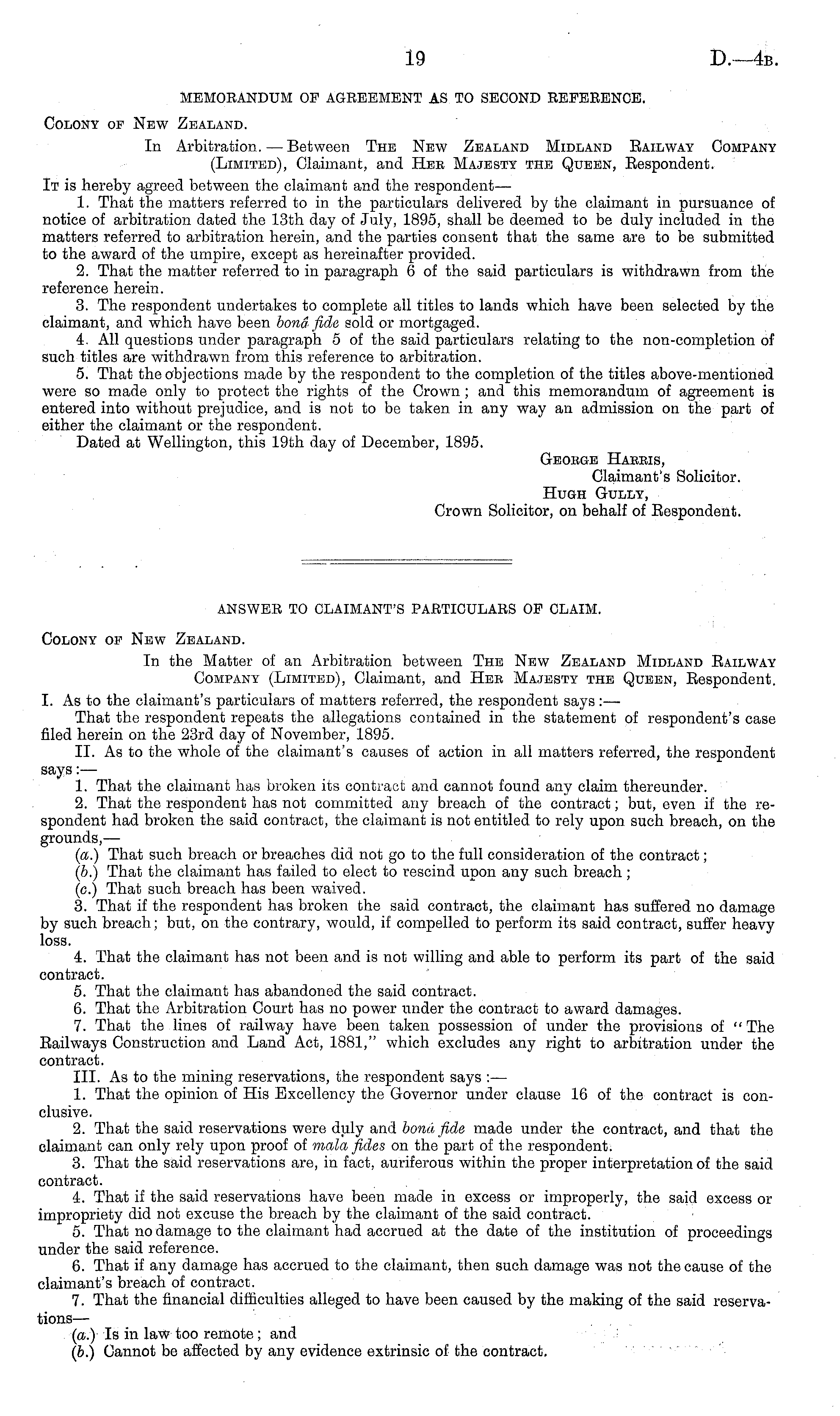 MEMORANDUM OF AGREEMENT AS TO SECOND REFERENCE. Colony op New Zealand. In Arbitration.—Between The New Zealand Midland Eailway Company (Limited), Claimant, and Hee Majesty the Queen, Eespondent. It is hereby agreed between the claimant and the respondent— 1. That the matters referred to in the particulars delivered by the claimant in pursuance of notice of arbitration dated the 13th day of July, 1895, shall be deemed to be duly included in the matters referred to arbitration herein, and the parties consent that the same are to be submitted to the award of the umpire, except as hereinafter provided. 2. That the matter referred to in paragraph 6 of the said particulars is withdrawn from the reference herein. 3. The respondent undertakes to complete all titles to lands which have been selected by the claimant, and which have been bond fide sold or mortgaged. 4. All questions under paragraph 5 of the said particulars relating to the non-completion of such titles are withdrawn from this reference to arbitration. 5. That the objections made by the respondent to the completion of the titles above-mentioned were so made only to protect the rights of the Crown ; and this memorandum of agreement is entered into without prejudice, and is not to be taken in any way an admission on the part of either the claimant or the respondent. Dated at Wellington, this 19th day of December, 1895. Geoege Haeeis, Claimant's Solicitor. Hugh Gully, Crown Solicitor, on behalf of Eespondent.