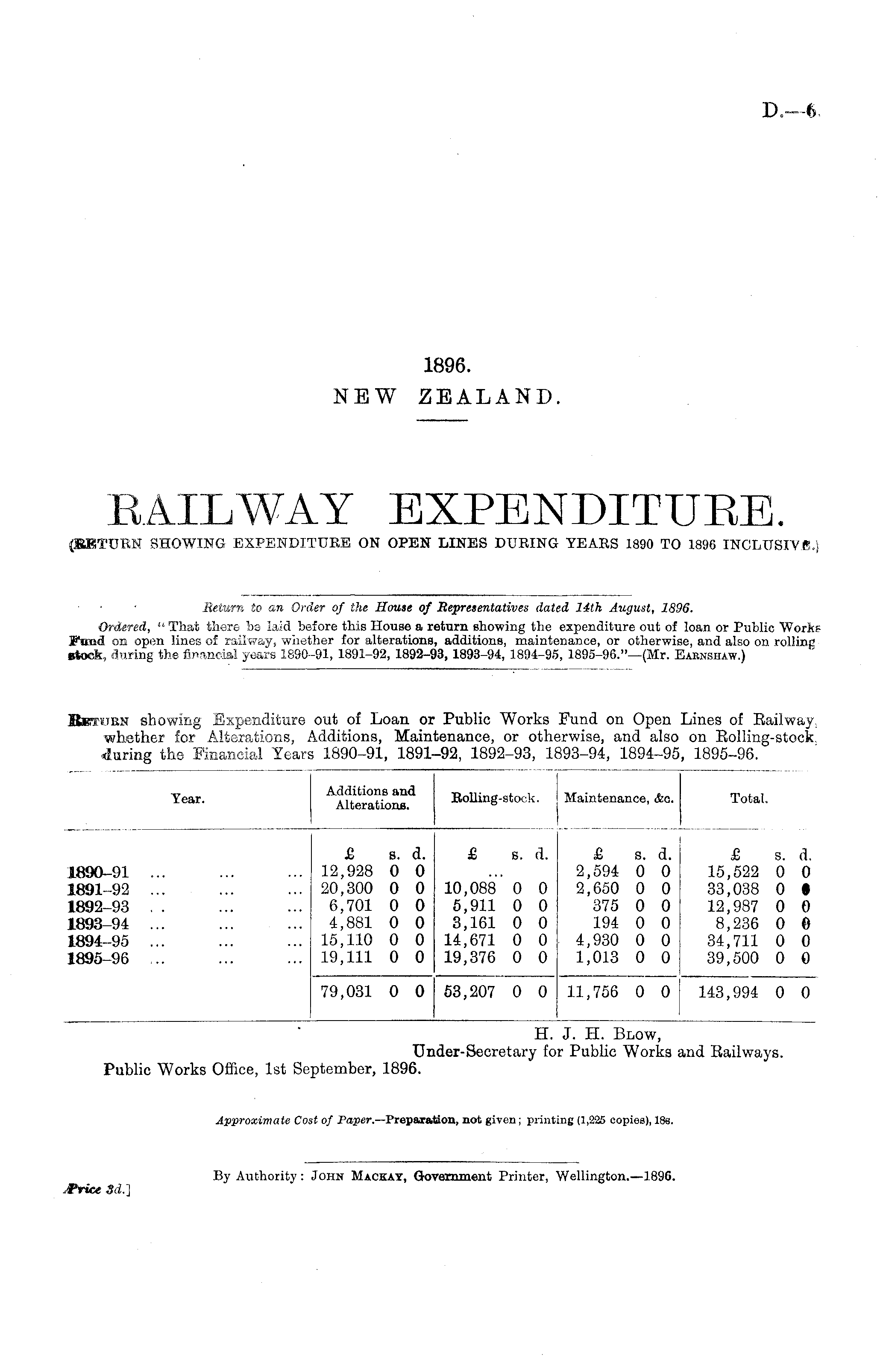 H. J. H. Blow, Under-Secretary for Public Works and Eailways. Public Works Office, Ist September, 1896.