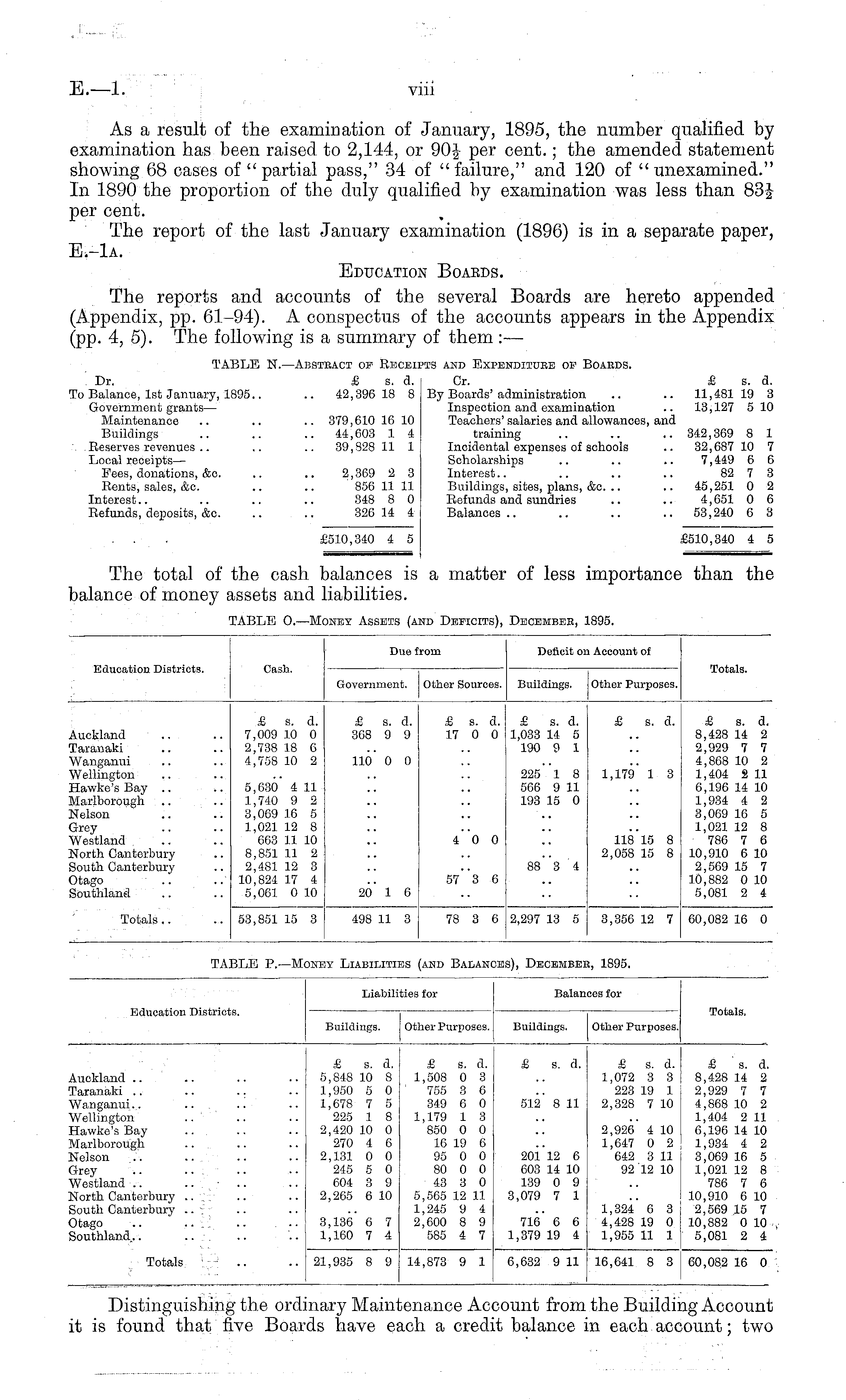 As a result of the examination of January, 1895, the number qualified by examination has been raised to 2,144, or 90J per cent.; the amended statement showing 68 cases of "partial pass," 34 of "failure," and 120 of "unexamined." In 1890 the proportion of the duly qualified by examination was less than 83J per cent. The report of the last January examination (1896) is in a separate paper, E.-la. Education Boards. The reports and accounts of the several Boards are hereto appended (Appendix, pp. 61-94). A conspectus of the accounts appears in the Appendix (pp. 4, 5). The following is a summary of them:— TABLE N. —Abstract of Receipts and Expenditure of Boards. Dr. £ s. d. Cr. £ s. d. To Balance, Ist January, 1895.. .. 42,396 18 8 By Boards'administration .. .. 11,481 19 3 Government grants— Inspection and examination .. 13,127 510 Maintenance .. .. .. 379,610 16 10 Teachers'salaries and allowances, and Buildings .. .. .. 44,603 1 4 training .. .. .. 342,369 8 1 Reserves revenues .. .. .. 39,828 11 1 Incidental expenses of schools .. 32,687 10 7 Local receipts— Scholarships .. .. .. 7,449 6 6 Fees, donations, &c. .. .. 2,369 2 3 Interest.. .. .. .. 82 7 3 Rents, sales, &c. .. .. 856 11 11 Buildings, sites, plans, &c. .. .. 45,251 0 2 Interest.. .. .. .. 848 8 0 Refunds and sundries .. .. 4,651 0 6 Refunds, deposits, &c. .. .. 326 14 4 Balances.. .. .. .. 53,240 6 3 . . . £510,340 4 5 £510,340 4 5 The total of the cash balances is a matter of less importance than the balance of money assets and liabilities.