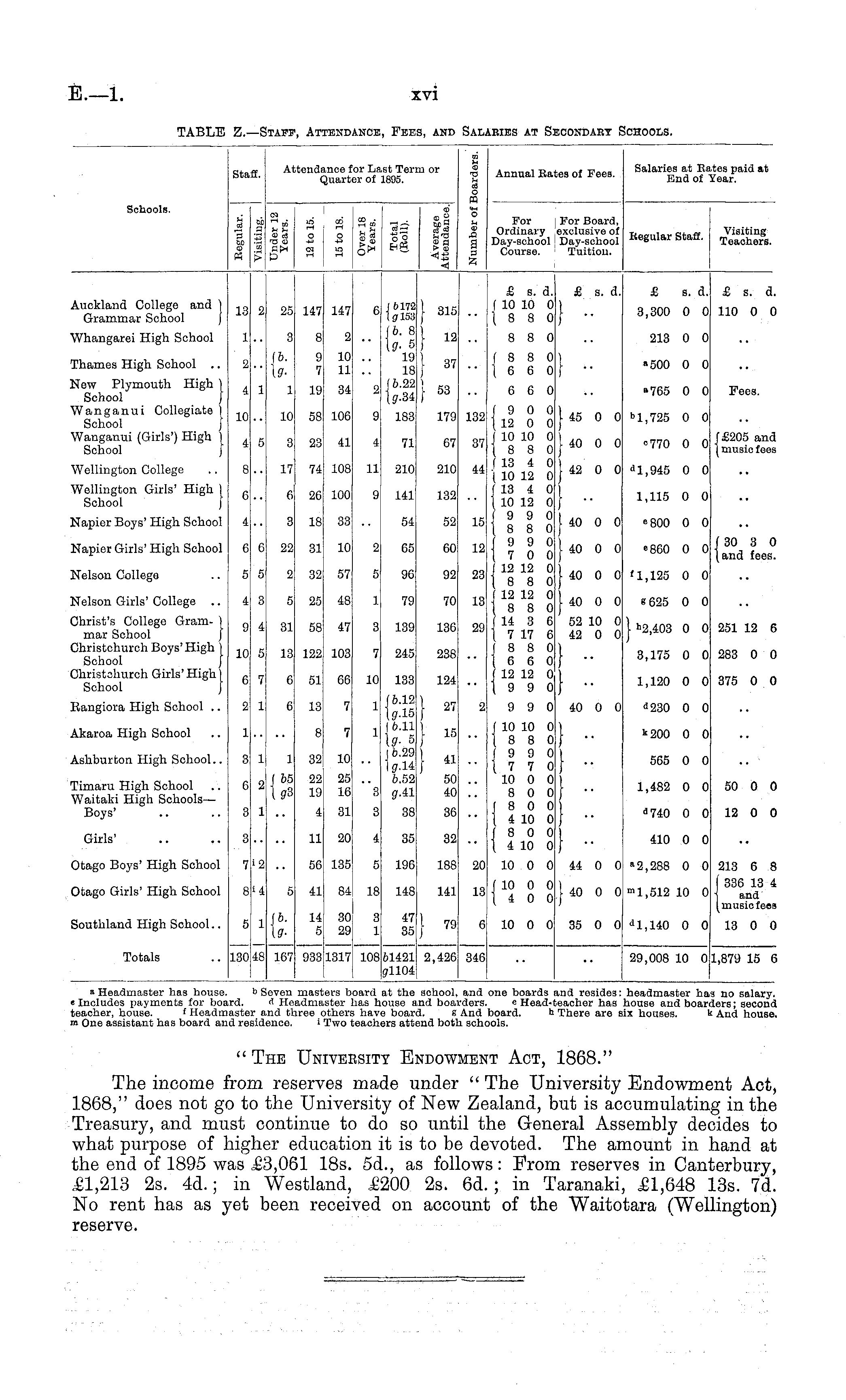 Schools. Staff. itendr rnce fi Juarte 3r Lai ir of 1 st Term or L895. B__ li ~ -5 J OD >4 <D ■a 3 o cq o « a Annual Rates of Fees. Salaries at Ri End of _tes paid at Year. a 3 © TO cm © d fd © O en od o in CO - For Ordinary Day-school Course. For Board, exclusive of Day-school Tuition. Regular Staff. Visiting Teachers. £ s. a. j 10 10 0 18 8 0 £ s. a. £ s. d. £ s. a. Auckland College and } Grammar School j 13 25 147 147 I 6172 Iff 163 lb. 8 \9- 5 19 18 J 6.22 tsr.34 l 315 i » j 37 1 53 I - 3,300 0 0 110 0 0 Whangarei High School 1 3 8 2 8 8 0 213 0 0 Thames High School .. ib. \g9 7 10 11 (880 (660 I - "500 0 0 New Plymouth High ) School Wanganui Collegiate ) School Wanganui (Girls') High 1 School j 4 10 1 10 19 58 34 106 2 9 183 179 132 6 6 0 (900 \12 0 0 ( 10 10 0 (880 ( 13 4 0 \ 10 12 0 J 13 4 0 1 10 12 0 j 9 9 0 (880 9 9 0 (700 J 12 12 0 (880 ] 12 12 0 (880 j 14 3 6 I 7 17 6 (880 (660 j 12 12 0 (990 t 45 0 0 j 40 0 0 I 42 0 0 I - I 40 0 0 I 40 0 0 I 40 0 0 j 40 0 0 »765 0 0 »> 1,725 0 0 Fees. 4 3 23 41 4 71 67 37 "770 0 0 (£205 and I music fees Wellington College 17 74 108 11 210 210 44 <>1,945 0 0 Wellington Girls' High 1 School } Napier Boys' High School 6 3 26 100 33 9 141 132 1,115 0 0 18 54 52 15 ■■800 0 0 Napier Girls' High School 22 31 10 2 65 60 12 "860 0 0 130 3 0 (and fees. Nelson College 2 32 57 5 96 92 23 '1,125 0 0 Nelson Girls' College .. Christ's College Gram- 1 mar School } Christehurch Boys'High ) School J Christehurch Girls'High) School J 6 25 48 1 79 70 13 8 625 0 0 9 31 58 47 3 139 136 29 52 10 0 42 0 0 j h 2,403 0 0 251 12 6 10 13 122 103 245 238 1 - 1 - 3,175 0 0 283 0 0 6 6 51 66 10 133 124 1,120 0 0 375 0 0 Bangiora High School .. Akaroa High School 6 13 8 7 7 1 (6.12 \g.lB 16.11 \9- 5 16.29 la.14 6.52 S .41 I „ j __ 2 9 9 0 j 10 10 0 (880 j 9 9 0 (770 10 0 0 8 0 0 (800 I 4.10 0 (800 1 4 10 0 40 0 0 ) - I - ) - . - I - d 230 0 0 k 200 0 0 Ashburton High School.. 1 32 10 565 0 0 Timaru High School Waitaki High Schools— Boys' I 65 US 22 19 25 16 "3 50 40 1,482 0 0 50 0 0 4 31 3 38 36 a 740 0 0 12 0 0 Girls' 11 20 35 32 410 0 0 Otago Boys' High Sohool i 2 : 56 135 6 196 188 20 10 0 0 44 0 0 "2,288 0 0 213 6 .8 f 336 13 4 1 and [ music fees Otago Girls' High School n 5 41 84 18 148 141 13 (10 0 0 (400 I 40 0 0 "1,512 10 0 Southland High School.. 5 (6. (914 5 30 29 3 1 47 35 j 79 10 0 0 35 0 0 01,140 0 0 13 0 0 Totals 130 48 933 1317 167 108 61421 (7ll04| 2,426 346 29,008 10 0i 1,879 15 6 a Headmaster has house. : Includes payments for boa seacher, house. i Headm n One assistant has board an urd. raster id res .even tl Her ind tl. lence. masi adm_ tree r i rers b ister others Two 1 oard at th< has house 5 have boa: teachers at" 3 school, and boai rd. S .end botl and rders, And bi sch( one boards i e Head-t board. h ools. and resides: .eacher has There are s headmaster ha house and boarr six houses. 1 ,s no salary, ders; second k And house. iii
