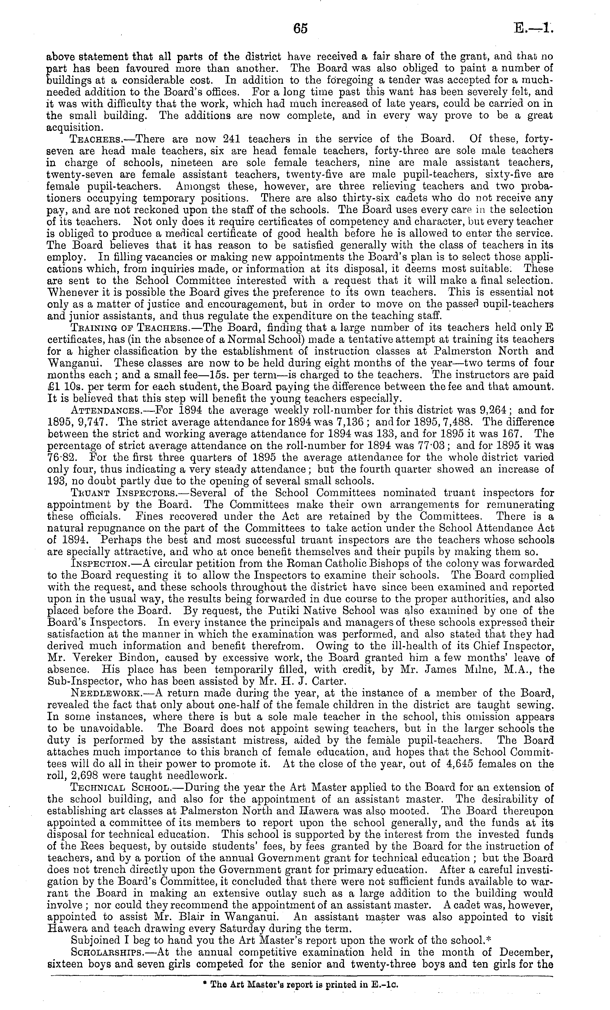 above statement that all parts of the district have received a fair share of the grant, and that no part has been favoured more than another. The Board was also obliged to paint a number of buildings at a considerable cost. In addition to the foregoing a tender was accepted for a muchneeded addition to the Board's offices. For a long time past this want has been severely felt, and it was with difficulty that the work, which had much increased of late years, could be carried on in the small building. The additions are now complete, and in every way prove to be a great acquisition. Teachers. —There are now 241 teachers in the service of the Board. Of these, fortyseven are head male teachers, six are head female teachers, forty-three are sole male teachers in charge of schools, nineteen are sole female teachers, nine are male assistant teachers, twenty-seven are female assistant teachers, twenty-five are male pupil-teachers, sixty-five are female pupil-teachers. Amongst these, however, are three relieving teachers and two probationers occupying temporary positions. There are also thirty-six cadets who do not receive any pay, and are not reckoned upon the staff of the schools. The Board uses every care in the selection of its teachers. Not only does it require certificates of competency and character, but every teacher is obliged to produce a medical certificate of good health before he is allowed to enter the service. The Board believes that it has reason to be satisfied generally with the class of teachers in its employ. In filling vacancies or making new appointments the Board's plan is to select those applications which, from inquiries made, or information at its disposal, it deems most suitable. These are sent to the School Committee interested with a request that it will make a final selection. Whenever it is possible the Board gives the preference to its own teachers. This is essential not only as a matter of justice and encouragement, but in order to move on the passed rjupil-teachers and junior assistants, and thus regulate the expenditure on the teaching staff. Training op Teachers. —The Board, finding that a large number of its teachers held only E certificates, has (in the absence of a Normal School) made a tentative attempt at training its teachers for a higher classification by the establishment of instruction classes at Palmerston North and Wanganui. These classes are now to be held during eight months of the year —two terms of four months each ; and a small fee—lss. per term —is charged to the teachers. The instructors are paid £1 10s. per term for each student, the Board paying the difference between the fee and that amount. It is believed that this step will benefit the young teachers especially. Attendances. —For 1894 the average weekly roll-number for this district was 9,264; and for 1895, 9,747. The strict average attendance for 1894 was 7,136 ; and for 1895, 7,488. The difference between the strict and working average attendance for 1894 was 133, and for 1895 it was 167. The percentage of strict average attendance on the roll-number for 1894 was 77*03; and for 1895 it was 76*82. For the first three quarters of 1895 the average attendance for the whole district varied only four, thus indicating a very steady attendance; but the fourth quarter showed an increase of 193, no doubt partly due to the opening of several small schools. Truant Inspectors.—Several of the School Committees nominated truant inspectors for appointment by the Board. The Committees make their own arrangements for remunerating these officials. Fines recovered under the Act are retained by the Committees. There is a natural repugnance on the part of the Committees to take action under the School Attendance Act of 1894. Perhaps the best and most successful truant inspectors are the teachers whose schools are specially attractive, and who at once benefit themselves and their pupils by making them so. Inspection.—A circular petition from the Roman Catholic Bishops of the colony was forwarded to the Board requesting it to allow the Inspectors to examine their schools. The Board complied with the request, and these schools throughout the district have since been examined and reported upon in the usual way, the results being forwarded in due course to the proper authorities, and also placed before the Board. By request, the Putiki Native School was also examined by one of the Board's Inspectors. In every instance the principals and managers of these schools expressed their satisfaction at the manner in which the examination was performed, and also stated that they had derived much information and benefit therefrom. Owing to the ill-health of its Chief Inspector, Mr. Vereker Bindon, caused by excessive work, the Board granted him a few months' leave of absence. His place has been temporarily filled, with credit, by Mr. James Milne, M.A., the Sub-Inspector, who has been assisted, by Mr. H. J. Carter. Needlework.—A return made during the year, at the instance of a member of the Board, revealed the fact that only about one-half of the female children in the district are taught sewing. In some instances, where there is but a sole male teacher in the school, this omission appears to be unavoidable. The Board does not appoint sewing teachers, but in the larger schools the duty is performed by the assistant mistress, aided by the female pupil-teachers. The Board attaches much importance to this branch cf female education, and hopes that the School Committees will do all in their power to promote it. At the close of the year, out of 4,645 females on the roll, 2,698 were taught needlework. Technical School.—During the year the Art Master applied to the Board for an extension of the school building, and also for the appointment of an assistant master. The desirability of establishing art classes at Palmerston North and Hawera was also mooted. The Board thereupon appointed a committee of its members 