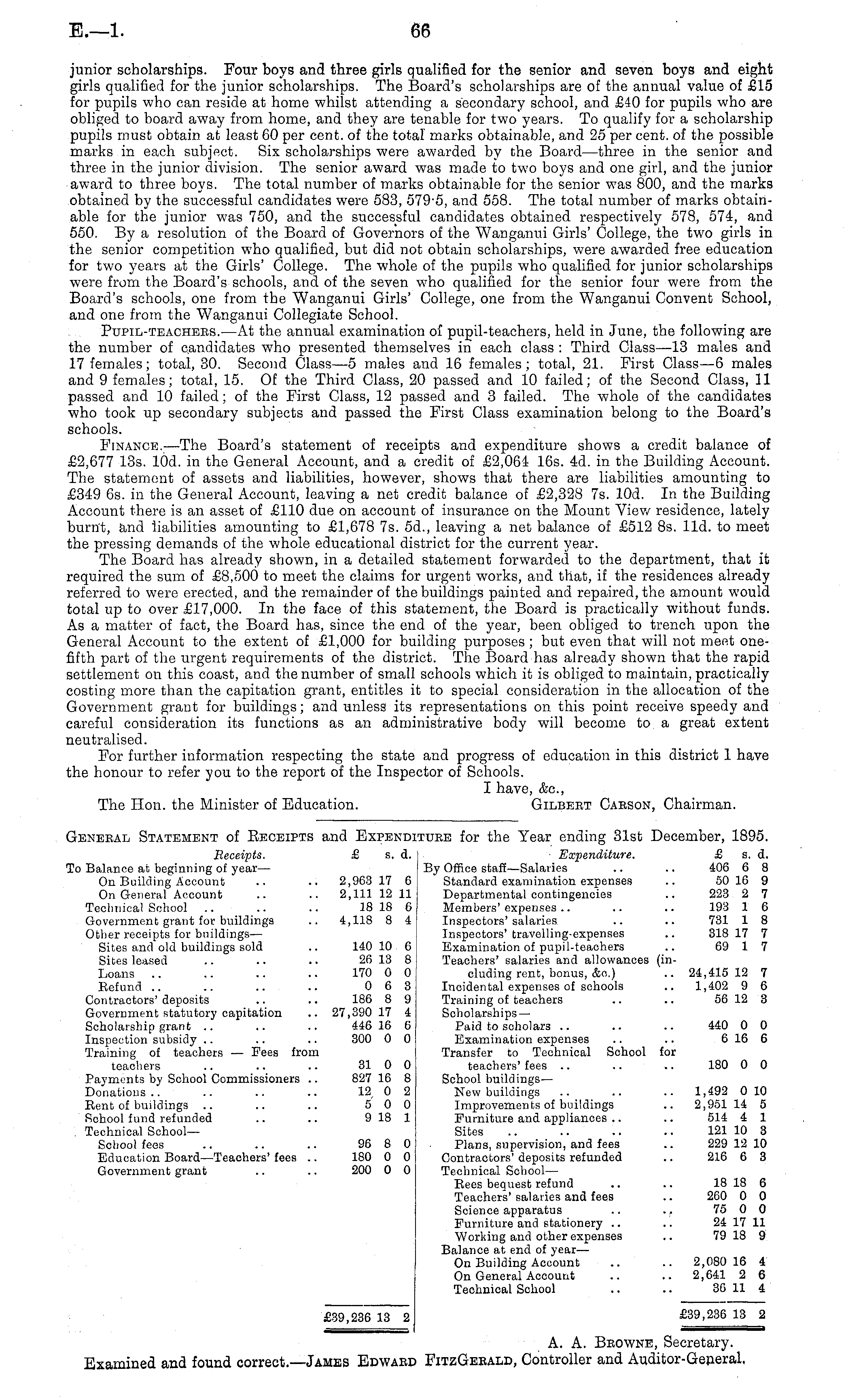 General Statement of Receipts and Expenditure for the Tear ending 31st December, 1895. Receipts. £ s. d. Expenditure. £ s. d. To Balance at beginning of year— By Office staff —Salaries .. .. 406 6 8 On Building Account .. .. 2,963 17 6 Standard examination expenses .. 50 16 9 On General Account .. .. 2,111 12 11 Departmental contingencies .. 223 2 7 Technical School .. .. .. 18 18 6 j Members' expenses .. .. .. 193 1 6 Government grant for buildings .. 4,118 8 4 Inspectors'salaries .. .. 731 1 8 Other receipts for buildings— Inspectors'travelling-expenses .. 318 17 7 Sites and old buildings sold .. 140 10 6 Examination of pupil-teachers .. 69 1 7 Sites leased .. .. .. 26 13 8 Teachers' salaries and allowances (inLoans .. .. .. .. 170 0 0 eluding rent, bonus, &c.) .. 24,415 12 7 Refund .. .. .. .. 0 6 3 Incidental expenses of schools .. 1,402 9 6 Contractors'deposits .. .. 186 8 9 Training of teachers .. .. 56 12 3 Government statutory capitation .. 27,390 17 4 Scholarships — Scholarship grant .. .. .. 446 16 6 Paid to scholars .. .. .. 440 0 0 Inspection subsidy .. .. .. 300 0 0 Examination expenses .. .. 616 6 Training of teachers — Fees from Transfer to Technical School for teachers .. .. .. 31 0 0 teachers' fees .. .. .. 180 0 0 Payments by School Commissioners .. 827 16 8 School buildings— Donations.. .. .. .. 12 0 2 New buildings .. .. .. 1,492 010 Rent of buildings .. .. .. 5 0 0 Improvements of buildings .. 2,951 14 5 School fund refunded .. .. 9 18 1 Furniture and appliances .. .. 514 4 1 . Technical School— Sites .. .. .. .. 121 10 3 School fees .. .. .. 96 8 0 Plans, supervision, and fees .. 229 12 10 Education Board—Teachers'fees .. 180 0 0 Contractors'deposits refunded .. 216 6 3 Government grant .. .. 200 0 0 Technical School — Rees bequest refund .. .. 18 18 6 Teachers' salaries and fees .. 260 0 0 Science apparatus .. .. 75 0 0 Furniture and stationery .. .. 24 17 11 Working and other expenses .. 79 18 9 Balance at end of year— On Building Account .. .. 2,080 16 4 On General Account .. .. 2,641 2 6 Technical School .. .. 36 11 4 £39,236 13 2 £39,236 13 2 A. A. Browne, Secretary. Examined and found correct.—James Edward FitzGerald, Controller and Auditor-General,