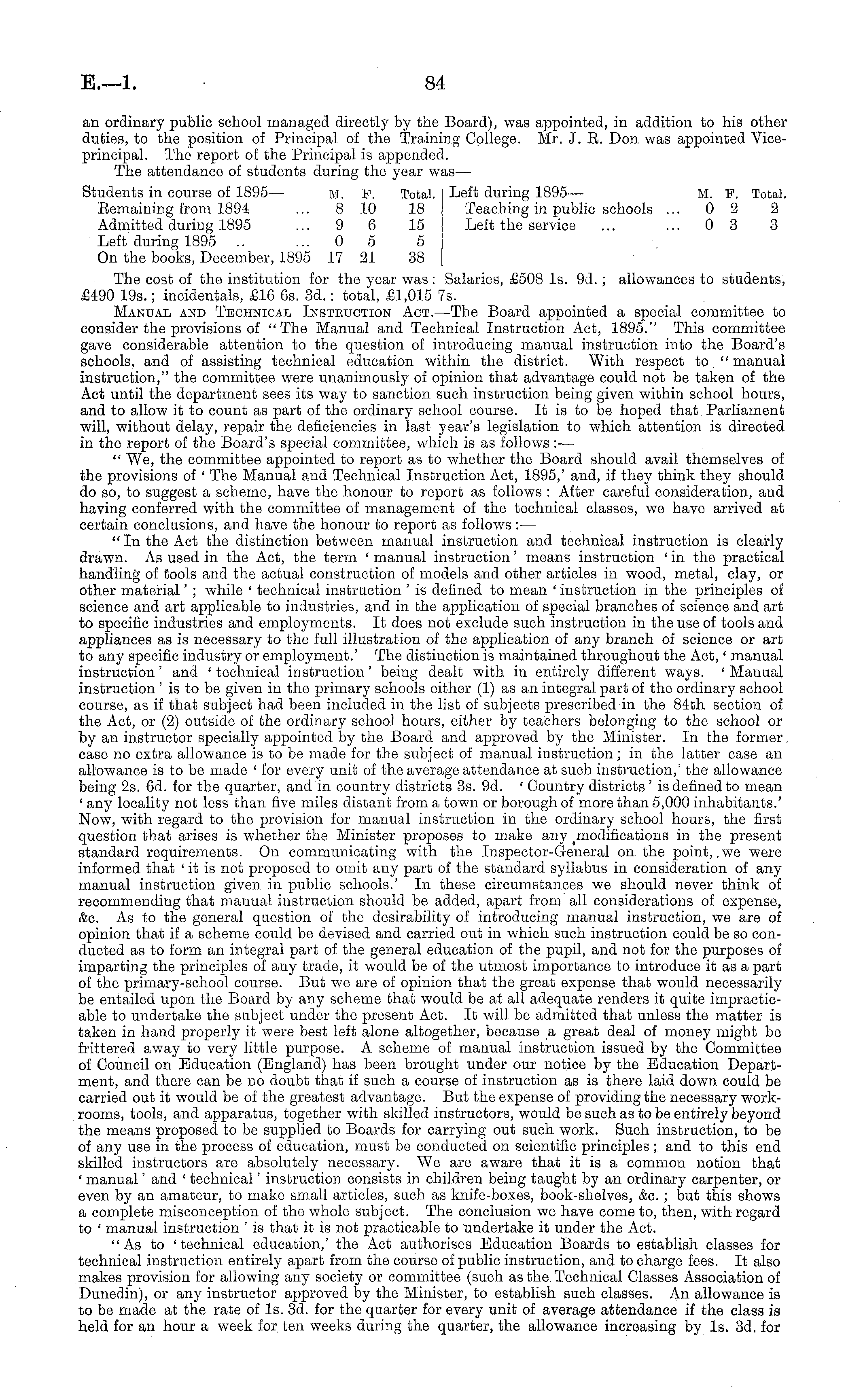 an ordinary public school managed directly by the Board), was appointed, in addition to his other duties, to the position of Principal of the Training College. Mr. J. R. Don was appointed Viceprincipal. The report of the Principal is appended. The attendance of students during the year was— Students in course of 1895 — M. F. Total. Left during 1895 — M. F. Total. Remaining from 1894 ... 8 10 18 Teaching in public schools ... 02 2 Admitted during 1895 ... 9 6 15 Left the service ... ... 03 3 Left during 1895 ..... 0 5 5 On the books, December, 1895 17 21 38 The cost of the institution for the year was: Salaries, £508 Is. 9d.; allowances to students, £490 195.; incidentals, £16 6s. 3d.: total, £1,015 7s. Manual and Technical Instruction Act. —The Board appointed a special committee to consider the provisions of "The Manual and Technical Instruction Act, 1895." This committee gave considerable attention to the question of introducing manual instruction into the Board's schools, and of assisting technical education within the district. With respect to " manual instruction," the committee were unanimously of opinion that advantage could not be taken of the Act until the department sees its way to sanction such instruction being given within school hours, and to allow it to count as part of the ordinary school course. It is to be hoped that Parliament will, without delay, repair the deficiencies in last year's legislation to which attention is directed in the report of the Board's special committee, which is as follows : — " We, the committee appointed to report as to whether the Board should avail themselves of the provisions of ' The Manual and Technical Instruction Act, 1895,' and, if they think they should do so, to suggest a scheme, have the honour to report as follows : After careful consideration, and having conferred with the committee of management of the technical classes, we have arrived at certain conclusions, and have the honour to report as follows : — "In the Act the distinction between manual instruction and technical instruction is clearly drawn. As used in the Act, the term ' manual instruction' means instruction 'in the practical handling of fools and the actual construction of models and other articles in wood, metal, clay, or other material' ; while ' technical instruction 'is defined to mean ' instruction in the principles of science and art applicable to industries, and in the application of special branches of science and art to specific industries and employments. It does not exclude such instruction in the use of tools and appliances as is necessary to the full illustration of the application of any branch of science or art to any specific industry or employment.' The distinction is maintained throughout the Act,' manual instruction' and ' technical instruction' being dealt with in entirely different ways. ' Manual instruction ' is to be given in the primary schools either (1) as an integral part of the ordinary school course, as if that subject had been included in the list of subjects prescribed in the 84th section of the Act, or (2) outside of the ordinary school hours, either by teachers belonging to the school or by an instructor specially appointed by the Board and approved by the Minister. In the former, case no extra allowance is to be made for the subject of manual instruction; in the latter case an allowance is to be made ' for every unit of the average attendance at such instruction,' the allowance being 2s. 6d. for the quarter, and in country districts 3s. 9d. ' Country districts 'is defined to mean ' any locality not less than five miles distant from a town or borough of more than 5,000 inhabitants.' Now, with regard to the provision for manual instruction in the ordinary school hours, the first question that arises is whether the Minister proposes to make any modifications in the present standard requirements. On communicating with the Inspector-General on the point, .we were informed that ' it is not proposed to omit any part of the standard syllabus in consideration of any manual instruction given in public schools.' In these circumstances we should never think of recommending that manual instruction should be added, apart from all considerations of expense, &c. As to the general question of the desirability of introducing manual instruction, we are of opinion that if a scheme could be devised and carried out in which such instruction could be so conducted as to form an integral part of the general education of the pupil, and not for the purposes of imparting the principles of any trade, it would be of the utmost importance to introduce it as a part of the primary-school course. But we are of opinion that the great expense that would necessarily be entailed upon the Board by any scheme that would be at all adequate renders it quite impracticable to undertake the subject under the present Act. It will be admitted that unless the matter is taken in hand properly it were best left alone altogether, because a great deal of money might be frittered away to very little purpose. A scheme of manual instruction issued by the Committee of Council on Education (England) has been brought under our notice by the Education Department, and there can be no doubt that if such a course of instruction as is there laid down could be carried out it would be of the greatest advantage. But the expense of providing the necessary workrooms, tools, and apparatus, together with skilled instructors, would be such as to be entirely beyond the means proposed to be supplied to Boards for carrying out such work. Such instruction, to be of any use in the process of education, must be conducted on scientific principles; and to this end skilled instructors are absolutely necessary. We are aware that it is a common notion that ' manual' and ' technical' instruction consists in children being taught by an ordinary carpenter, or even by an amateur, to make small articles, s