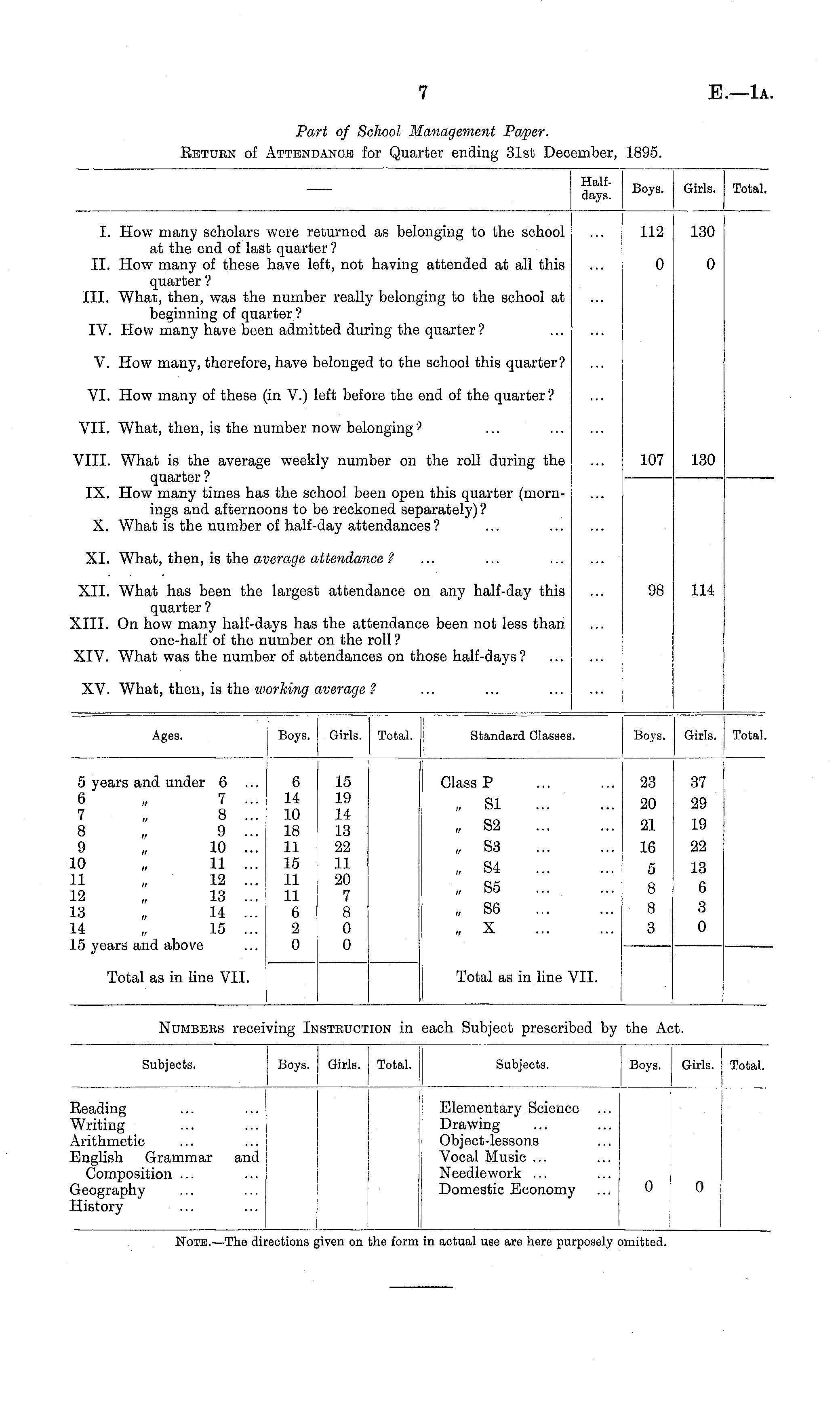 Boys. Girls. Total. I. How many scholars were returned as belonging to the school at the end of last quarter ? II. How many of these have left, not having attended at all this quarter ? III. What, then, was the number really belonging to the school at beginning of quarter ? IV. How many have been admitted during the quarter? 112 0 130 0 V. How many, therefore, have belonged to the school this quarter? VI. How many of these (in V.) left before the end of the quarter? VII. "What, then, is the number now belonging? VIII. What is the average weekly number on the roll during the quarter ? IX. How many times has the school been open this quarter (mornings and afternoons to be reckoned separately) ? X. What is the number of half-day attendances ? 107 130 XI. What, then, is the average attendance ? XII. What has been the largest attendance on any half-day this quarter ? XIII. On how many half-days has the attendance been not less than one-half of the number on the roll ? XIV. What was the number of attendances on those half-days? 98 114 XV. What, then, is the working average ? Ages. Boys. Girls. Total. I Standard Classei Boys. Girls. Total. i 5 years and under 6 6 „ 7 ... 7 „ 8 ... 8 „ 9 ... 9 „ 10 ... 0 „ 11 ... .1 „ 12 ... .2 „ 13 ... .3 „ 14 ... A „ 15 ... .5 years and above 6 14 10 18 11 15 11 11 6 2 0 15 19 14: 18 22 11 20 7 8 0 0 Class P „ SI „ S2 „ S3 „ S4 23 20 21 16 5 37 29 19 22 13 „ S5 8 6 „ S6 8 3 „ X 3 0 Total as in line VII. Total as in line VII.