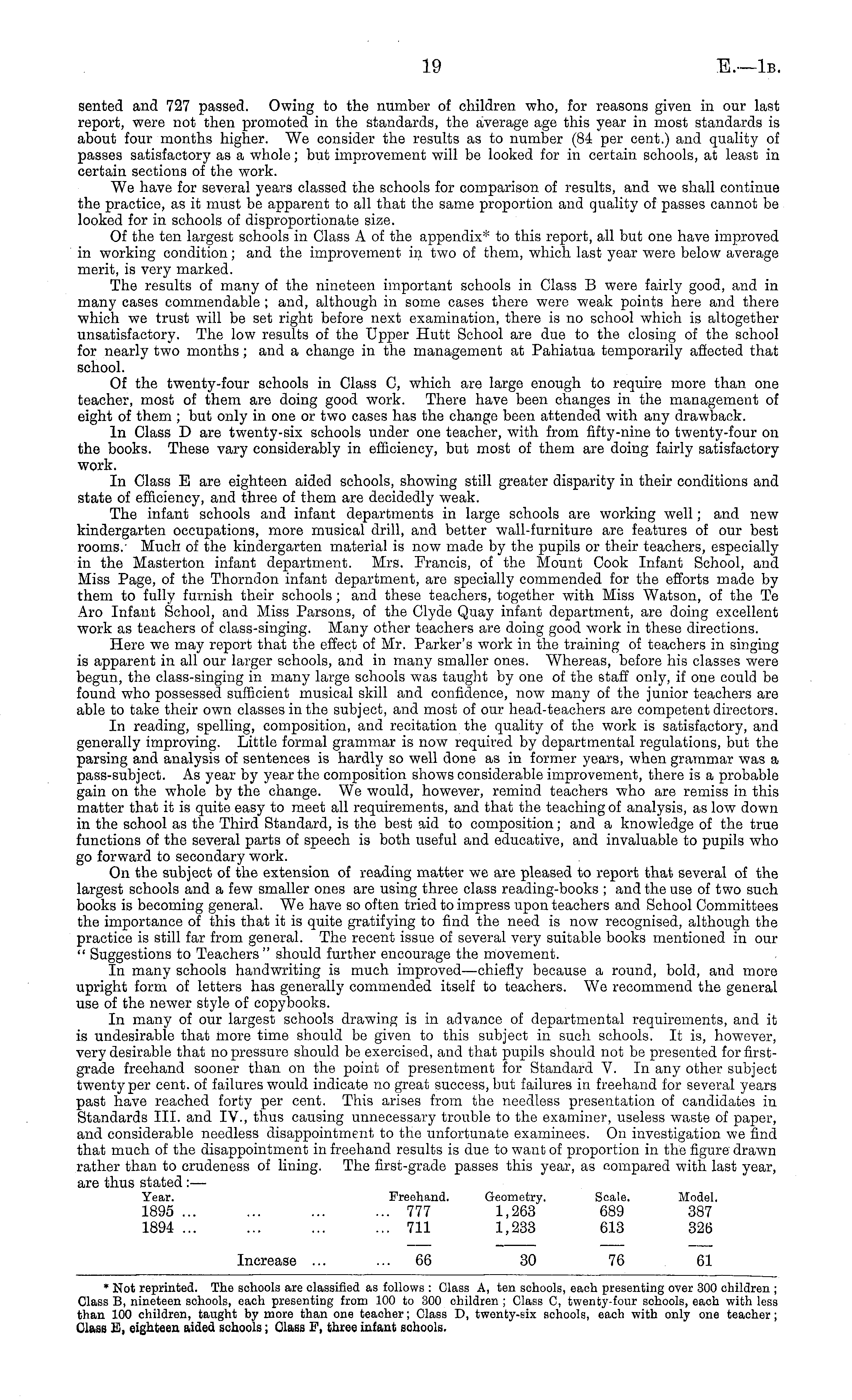 sented and 727 passed. Owing to the number of children who, for reasons given in our last report, were not then promoted in the standards, the average age this year in most standards is about four months higher. We consider the results as to number (84 per cent.) and quality of passes satisfactory as a whole; but improvement will be looked for in certain schools, at least in certain sections of the work. We have for several years classed the schools for comparison of results, and we shall continue the practice, as it must be apparent to all that the same proportion and quality of passes cannot be looked for in schools of disproportionate size. Of the ten largest schools in Class A of the appendix* to this report, all but one have improved in working condition; and the improvement in two of them, which last year were below average merit, is very marked. The results of many of the nineteen important schools in Class B were fairly good, and in many cases commendable ; and, although in some cases there were weak points here and there which we trust will be set right before next examination, there is no school which is altogether unsatisfactory. The low results of the Upper Hutt School are due to the closing of the school for nearly two months; and a change in the management at Pahiatua temporarily affected that school. Of the twenty-four schools in Class C, which are large enough to require more than one teacher, most of them are doing good work. There have been changes in the management of eight of them ; but only in one or two cases has the change been attended with any drawback. In Class D are twenty-six schools under one teacher, with from fifty-nine to twenty-four on the books. These vary considerably in efficiency, but most of them are doing fairly satisfactory work. In Class E are eighteen aided schools, showing still greater disparity in their conditions and state of efficiency, and three of them are decidedly weak. The infant schools and infant departments in large schools are working well; and new kindergarten occupations, more musical drill, and better wall-furniture are features of our best rooms. Much of the kindergarten material is now made by the pupils or their teachers, especially in the Masterton infant department. Mrs. Francis, of the Mount Cook Infant School, and Miss Page, of the Thorndon infant department, are specially commended for the efforts made by them to fully furnish their schools; and these teachers, together with Miss Watson, of the Te Aro Infant School, and Miss Parsons, of the Clyde Quay infant department, are doing excellent work as teachers of class-singing. Many other teachers are doing good work in these directions. Here we may report that the effect of Mr. Parker's work in the training of teachers in singing is apparent in all our larger schools, and in many smaller ones. Whereas, before his classes were begun, the class-singing in many large schools was taught by one of the staff only, if one could be found who possessed sufficient musical skill and confidence, now many of the junior teachers are able to take their own classes in the subject, and most of our head-teachers are competent directors. In reading, spelling, composition, and recitation the quality of the work is satisfactory, and generally improving. Little formal grammar is now required by departmental regulations, but the parsing and analysis of sentences is hardly so well done as in former years, when grammar was a pass-subject. As year by year the composition shows considerable improvement, there is a probable gain on the whole by the change. We would, however, remind teachers who are remiss in this matter that it is quite easy to meet all requirements, and that the teaching of analysis, as low down in the school as the Third Standard, is the best aid to composition; and a knowledge of the true functions of the several parts of speech is both useful and educative, and invaluable to pupils who go forward to secondary work. On the subject of the extension of reading matter we are pleased to report that several of the largest schools and a few smaller ones are using three class reading-books ; and the use of two such books is becoming general. We have so often tried to impress upon teachers and School Committees the importance of this that it is quite gratifying to find the need is now recognised, although the practice is still far from general. The recent issue of several very suitable books mentioned in our " Suggestions to Teachers" should further encourage the movement. In many schools handwriting is much improved—chiefly because a round, bold, and more upright form of letters has generally commended itself to teachers. We recommend the general use of the newer style of copybooks. In many of our largest schools drawing is in advance of departmental requirements, and it is undesirable that more time should be given to this subject in such schools. It is, however, very desirable that no pressure should be exercised, and that pupils should not be presented for firstgrade freehand sooner than on the point of presentment for Standard V. In any other subject twenty per cent, of failures would indicate no great success, but failures in freehand for several years past have reached forty per cent. This arises from the needless presentation of candidates in Standards 111. and IV., thus causing unnecessary trouble to the examiner, useless waste of paper, and considerable needless disappointment to the unfortunate examinees. On investigation we find that much of the disappointment in freehand results is due to want of proportion in the figure drawn rather than to crudeness of lining. The first-grade passes this year, as compared with last year, are thus stated :— Year. Freehand. Geometry. Scale. Model. 1895 ... ... ... ... 777 1,263 689 387 1894 711 1,233 613 326 Increase ... ... 66 30 76 61