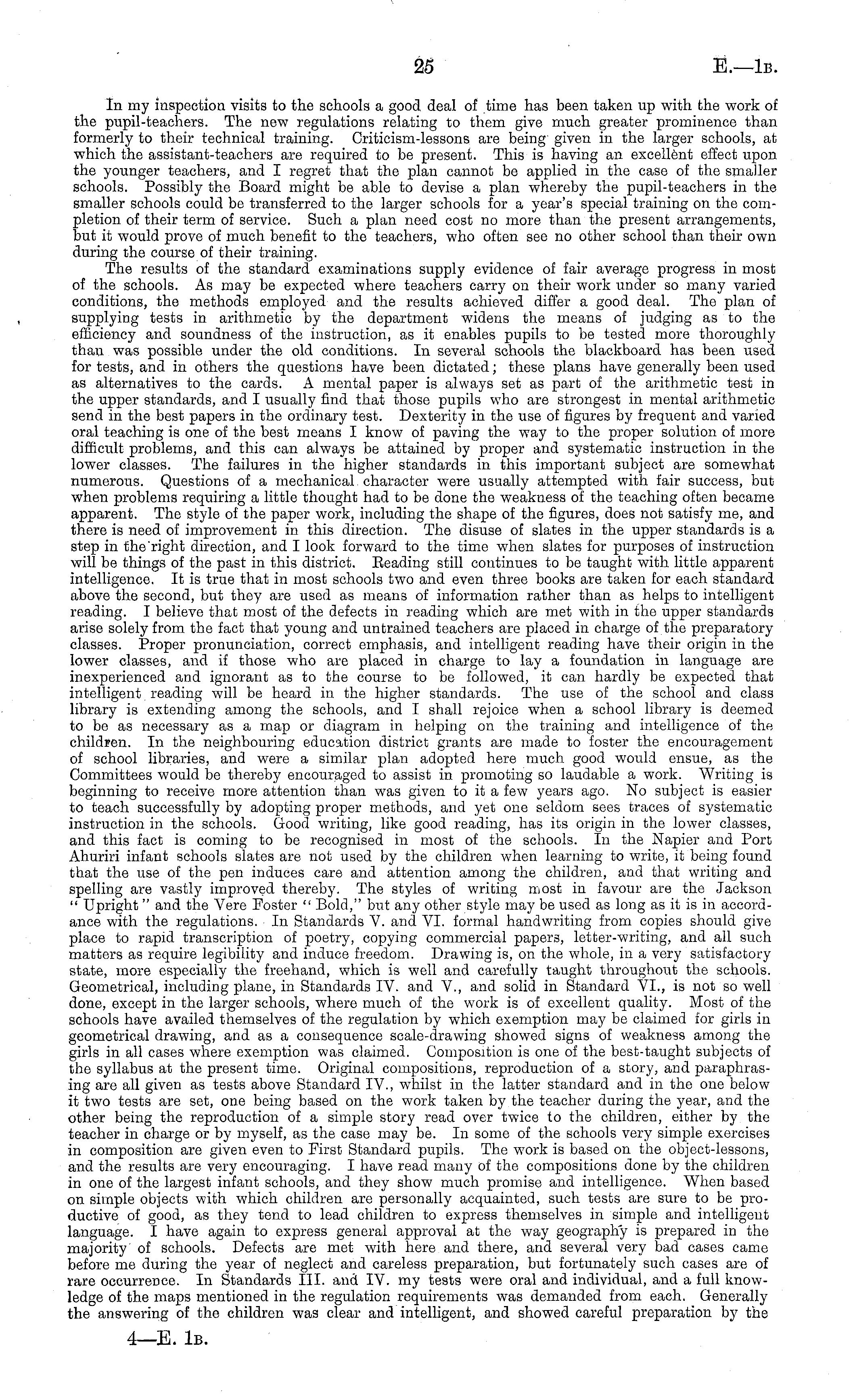 In my inspection visits to the schools a good deal of time has been taken up with the work of the pupil-teachers. The new regulations relating to them give much greater prominence than formerly to their technical training. Criticism-lessons are being given in the larger schools, at which the assistant-teachers are required to be present. This is having an excellent effect upon the younger teachers, and I regret that the plan cannot be applied in the case of the smaller schools. Possibly the Board might be able to devise a plan whereby the pupil-teachers in the smaller schools could be transferred to the larger schools for a year's special training on the completion of their term of service. Such a plan need cost no more than the present arrangements, But it would prove of much benefit to the teachers, who often see no other school than their own during the course of their training. The results of the standard examinations supply evidence of fair average progress in most of the schools. As may be expected where teachers carry on their work under so many varied conditions, the methods employed and the results achieved differ a good deal. The plan of supplying tests in arithmetic by the department widens the means of judging as to the efficiency and soundness of the instruction, as it enables pupils to be tested more thoroughly than was possible under the old conditions. In several schools the blackboard has been used for tests, and in others the questions have been dictated; these plans have generally been used as alternatives to the cards. A mental paper is always set as part of the arithmetic test in the upper standards, and I usually find that those pupils who are strongest in mental arithmetic send in the best papers in the ordinary test. Dexterity in the use of figures by frequent and varied oral teaching is one of the best means I know of paving the way to the proper solution of more difficult problems, and this can always be attained by proper and systematic instruction in the lower classes. The failures in the higher standards in this important subject are somewhat numerous. Questions of a mechanical character were usually attempted with fair success, but when problems requiring a little thought had to be done the weakness of the teaching often became apparent. The style of the paper work, including the shape of the figures, does not satisfy me, and there is need of improvement in this direction. The disuse of slates in the upper standards is a step in the'right direction, and I look forward to the time when slates for purposes of instruction will be things of the past in this district. Beading still continues to be taught with little apparent intelligence. It is true that in most schools two and even three books are taken for each standard above the second, but they are used as means of information rather than as helps to intelligent reading. I believe that most of the defects in reading which are met with in the upper standards arise solely from the fact that young and untrained teachers are placed in charge of the preparatory classes. Proper pronunciation, correct emphasis, and intelligent reading have their origin in the lower classes, and if those who are placed in charge to lay a foundation in language are inexperienced and ignorant as to the course to be followed, it can hardly be expected that intelligent reading will be heard in the higher standards. The use of the school and class library is extending among the schools, and I shall rejoice when a school library is deemed to be as necessary as a map or diagram in helping on the training and intelligence of the children. In the neighbouring education district grants are made to foster the encouragement of school libraries, and were a similar plan adopted here much good would ensue, as the Committees would be thereby encouraged to assist in promoting so laudable a work. Writing is beginning to receive more attention than was given to it a few years ago. No subject is easier to teach successfully by adopting proper methods, and yet one seldom sees traces of systematic instruction in the schools. Good writing, like good reading, has its origin in the lower classes, and this fact is coming to be recognised in most of the schools. In the Napier and Port Ahuriri infant schools slates are not used by the children when learning to write, it being found that the use of the pen induces care and attention among the children, and that writing and spelling are vastly improved thereby. The styles of writing niost in favour are the Jackson " Upright " and the Vere Foster " Bold," but any other style may be used as long as it is in accordance with the regulations. In Standards V. and VI. formal handwriting from copies should give place to rapid transcription of poetry, copying commercial papers, letter-writing, and all such matters as require legibility and induce freedom. Drawing is, on the whole, in a very satisfactory state, more especially the freehand, which is well and carefully taught throughout the schools. Geometrical, including plane, in Standards IV. and V., and solid in Standard VI., is not so well done, except in the larger schools, where much of the work is of excellent quality. Most of the schools have availed themselves of the regulation by which exemption may be claimed for girls in geometrical drawing, and as a consequence scale-drawing showed signs of weakness among the girls in all cases where exemption was claimed. Composition is one of the best-taught subjects of the syllabus at the present time. Original compositions, reproduction of a story, and paraphrasing are all given as tests above Standard IV., whilst in the latter standard and in the one below it two tests are set, one being based on the work taken by the teacher during the year, and the other being the reproduction of a simple story read over twice to the children, either by the teacher in charge or by myself, as the case may be. In some of the schools very 