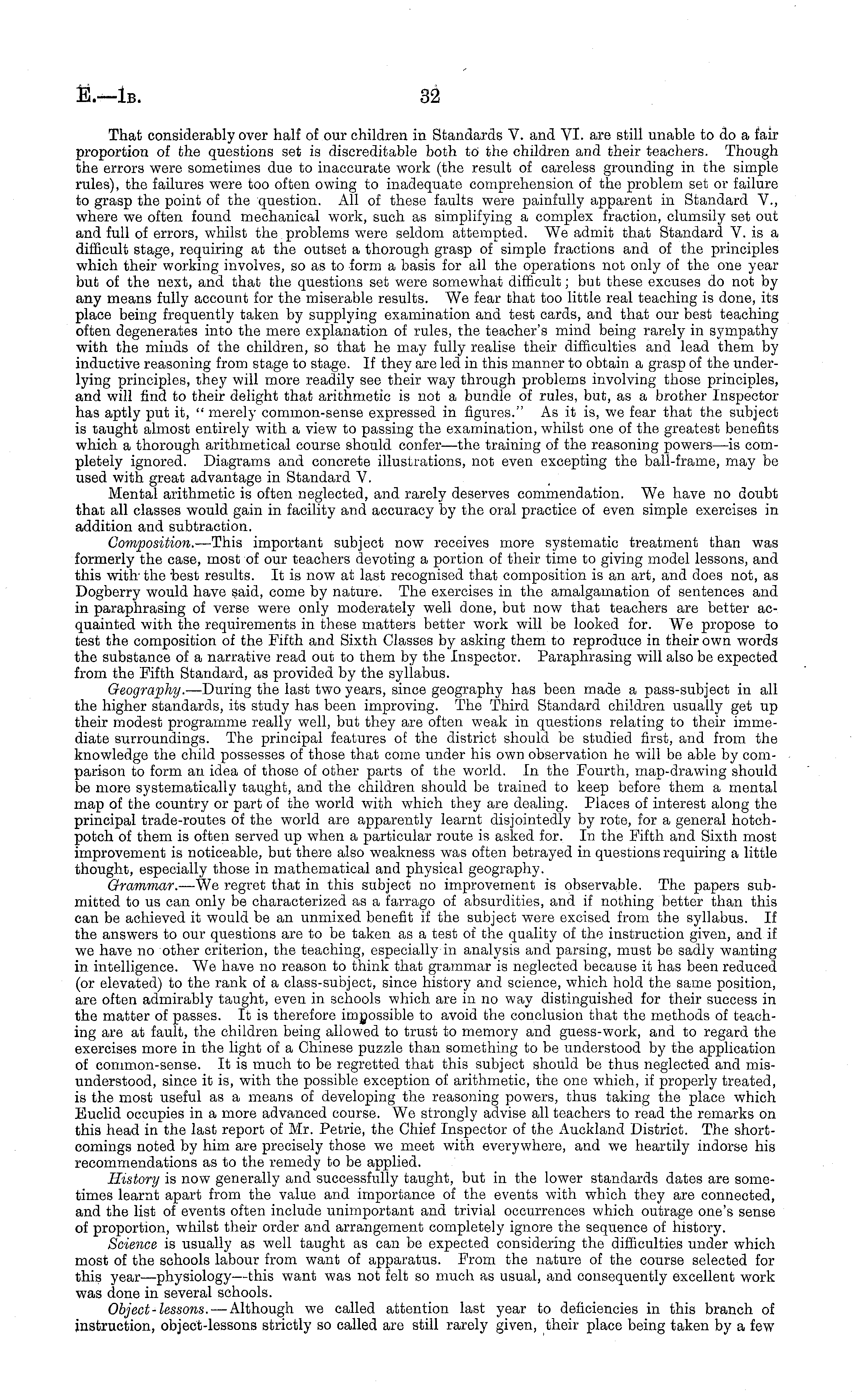 That considerably over half of our children in Standards V. and VI. are still unable to do a fair proportion of the questions set is discreditable both to the children and their teachers. Though the errors were sometimes due to inaccurate work (the result of careless grounding in the simple rules), the failures were too often owing to inadequate comprehension of the problem set or failure to grasp the point of the question. All of these faults were painfully apparent in Standard V., where we often found mechanical work, such as simplifying a complex fraction, clumsily set out and full of errors, whilst the problems were seldom attempted. We admit that Standard V. is a difficult stage, requiring at the outset a thorough grasp of simple fractions and of the principles which their working involves, so as to form a basis for all the operations not only of the one year but of the next, and that the questions set were somewhat difficult; but these excuses do not by any means fully account for the miserable results. We fear that too little real teaching is done, its place being frequently taken by supplying examination and test cards, and that our best teaching often degenerates into the mere explanation of rules, the teacher's mind being rarely in sympathy with the minds of the children, so that he may fully realise their difficulties and lead them by inductive reasoning from stage to stage. If they are led in this manner to obtain a grasp of the underlying principles, they will more readily see their way through problems involving those principles, and will find to their delight that arithmetic is not a bundle of rules, but, as a brother Inspector has aptly put it, " merely common-sense expressed in figures." As it is, we fear that the subject is taught almost entirely with a view to passing the examination, whilst one of the greatest benefits which a thorough arithmetical course should confer—the training of the reasoning powers—is completely ignored. Diagrams and concrete illustrations, not even excepting the ball-frame, may be used with great advantage in Standard V. Mental arithmetic is often neglected, and rarely deserves commendation. We have no doubt that all classes would gain in facility and accuracy by the oral practice of even simple exercises in addition and subtraction. Composition. —This important subject now receives more systematic treatment than was formerly the case, most of our teachers devoting a portion of their time to giving model lessons, and this with , the 'best results. It is now at last recognised that composition is an art, and does not, as Dogberry would have said, come by nature. The exercises in the amalgamation of sentences and in paraphrasing of verse were only moderately well done, but now that teachers are better acquainted with the requirements in these matters better work will be looked for. We propose to test the composition of the Fifth and Sixth Classes by asking them to reproduce in their own words the substance of a narrative read out to them by the Inspector. Paraphrasing will also be expected from the Fifth Standard, as provided by the syllabus. Geography. —During the last two years, since geography has been made a pass-subject in all the higher standards, its study has been improving. The Third Standard children usually get up their modest programme really well, but they are often weak in questions relating to their immediate surroundings. The principal features of the district should be studied first, and from the knowledge the child possesses of those that come under his own observation he will be able by comparison to form an idea of those of other parts of the world. En the Fourth, map-drawing should be more systematically taught, and the children should be trained to keep before them a mental map of the country or part of the world with which they are dealing. Places of interest along the principal trade-routes of the world are apparently learnt disjointedly by rote, for a general hotchpotch of them is often served up when a particular route is asked for. In the Fifth and Sixth most improvement is noticeable, but there also weakness was often betrayed in questions requiring a little thought, especially those in mathematical and physical geography. Grammar. —We regret that in this subject no improvement is observable. The papers submitted to us can only be characterized as a farrago of absurdities, and if nothing better than this can be achieved it would be an unmixed benefit if the subject were excised from the syllabus. If the answers to our questions are to be taken as a test of the quality of the instruction given, and if we have no other criterion, the teaching, especially in analysis and parsing, must be sadly wanting in intelligence. We have no reason to think that grammar is neglected because it has been reduced (or elevated) to the rank of a class-subject, since history and science, which hold the same position, are often admirably taught, even in schools which are in no way distinguished for their success in the matter of passes. It is therefore impossible to avoid the conclusion that the methods of teaching are at fault, the children being allowed to trust to memory and guess-work, and to regard the exercises more in the light of a Chinese puzzle than something to be understood by the application of common-sense. It is much to be regretted that this subject should be thus neglected and misunderstood, since it is, with the possible exception of arithmetic, the one which, if properly treated, is the most useful as a means of developing the reasoning powers, thus taking the place which Euclid occupies in a more advanced course. We strongly advise all teachers to read the remarks on this head in the last report of Mr. Petrie, the Chief Inspector of the Auckland District. The shortcomings noted by him are precisely those we meet with everywhere, and we heartily indorse his recommendations as to the remedy to be applied. History