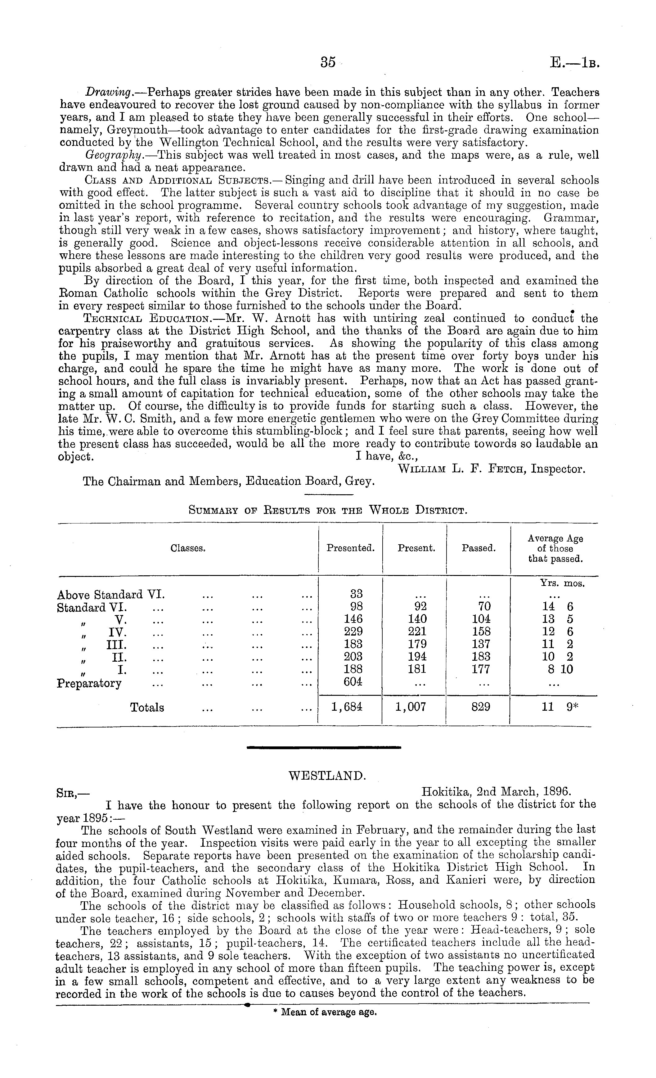 WBSTLAND. Sib,— Hokitika, 2nd March, 1896. I have the honour to present the following report on the schools of the district for the year 1895 :— The schools of South Westland were examined in February, and the remainder during the last four months of the year. Inspection visits were paid early in the year to all excepting the smaller aided schools. Separate reports have been presented on the examination of the scholarship candidates, the pupil-teachers, and the secondary class of the Hokitika District High School. In addition, the four Catholic schools at Hokitika, Kumara, Eoss, and Kanieri were, by direction of the Board, examined during November and December. The schools of the district may be classified as follows: Household schools, 8; other schools under sole teacher, 16 ; side schools, 2; schools with staffs of two or more teachers 9 : total, 35. The teachers employed by the Board at the close of the year were: Head-teachers, 9 ; sole teachers, 22 ; assistants, 15 ; pupil-teachers, 14. The certificated teachers include all the headteachers, 13 assistants, and 9 sole teachers. With the exception of two assistants no uncertificated adult teacher is employed in any school of more than fifteen pupils. The teaching power is, except in a few small schools, competent and effective, and to a very large extent any weakness to be recorded in the work of the schools is due to causes beyond the control of the teachers.