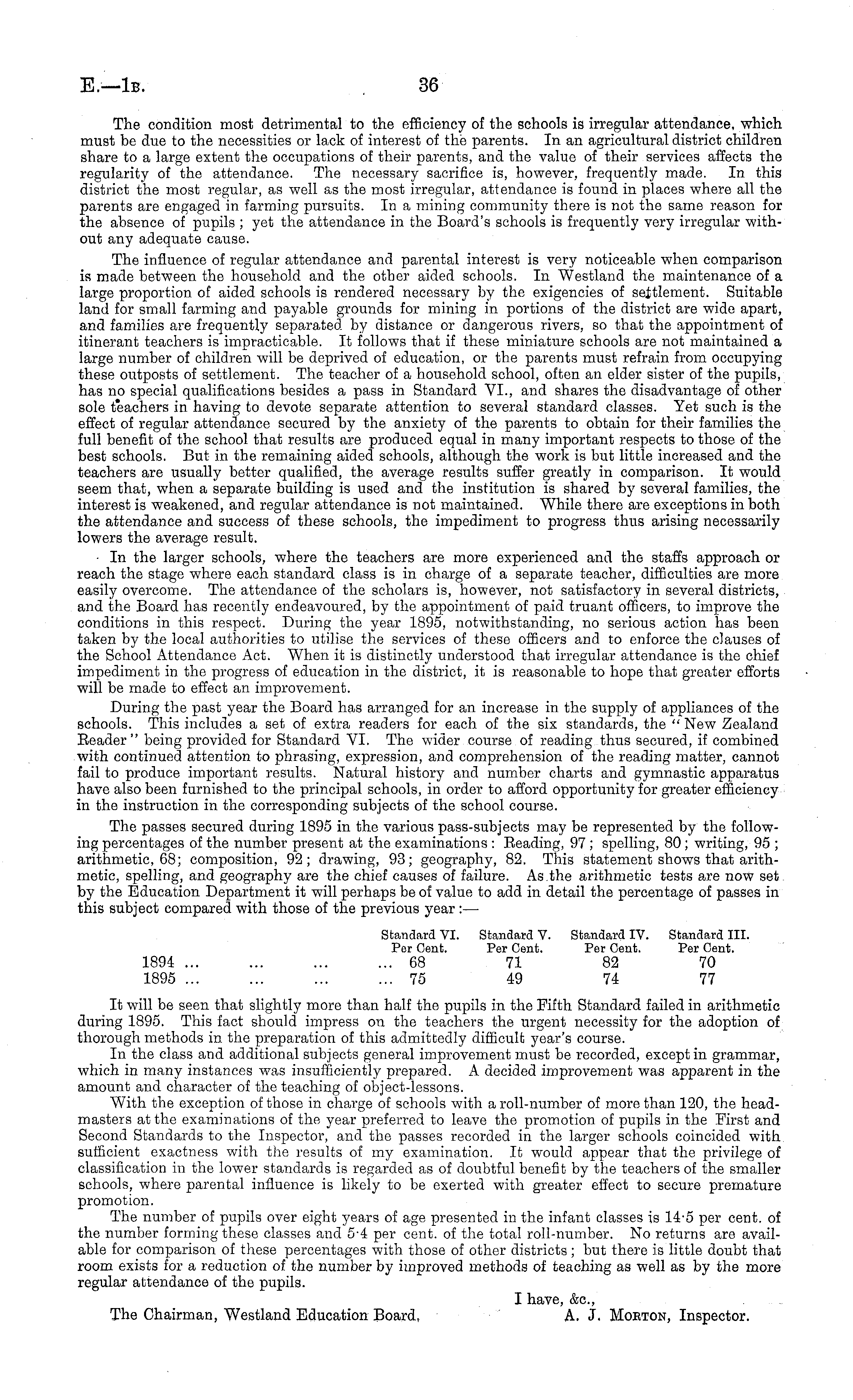 The condition most detrimental to the efficiency of the schools is irregular attendance, which must be due to the necessities or lack of interest of the parents. In an agricultural district children share to a large extent the occupations of their parents, and the value of their services affects the regularity of the attendance. The necessary sacrifice is, however, frequently made. In this district the most regular, as well as the most irregular, attendance is found in places where all the parents are engaged in farming pursuits. In a mining community there is not the same reason for the absence of pupils ; yet the attendance in the Board's schools is frequently very irregular without any adequate cause. The influence of regular attendance and parental interest is very noticeable when comparison is made between the household and the other aided schools. In Westland the maintenance of a large proportion of aided schools is rendered necessary by the exigencies of settlement. Suitable land for small farming and payable grounds for mining in portions of the district are wide apart, and families are frequently separated by distance or dangerous rivers, so that the appointment of itinerant teachers is impracticable. It follows that if these miniature schools are not maintained a large number of children will be deprived of education, or the parents must refrain from occupying these outposts of settlement. The teacher of a household school, often an elder sister of the pupils, has no special qualifications besides a pass in Standard VI., and shares the disadvantage of other sole teachers in having to devote separate attention to several standard classes. Yet such is the effect of regular attendance secured by the anxiety of the parents to obtain for their families the full benefit of the school that results are produced equal in many important respects to those of the best schools. But in the remaining aided schools, although the work is but little increased and the teachers are usually better qualified, the average results suffer greatly in comparison. It would seem that, when a separate building is used and the institution is shared by several families, the interest is weakened, and regular attendance is not maintained. While there are exceptions in both the attendance and success of these schools, the impediment to progress thus arising necessarily lowers the average result. In the larger schools, where the teachers are more experienced and the staffs approach or reach the stage where each standard class is in charge of a separate teacher, difficulties are more easily overcome. The attendance of the scholars is, however, not satisfactory in several districts, and the Board has recently endeavoured, by the appointment of paid truant officers, to improve the conditions in this respect. During the year 1895, notwithstanding, no serious action has been taken by the local authorities to utilise the services of these officers and to enforce the clauses of the School Attendance Act. When it is distinctly understood that irregular attendance is the chief impediment in the progress of education in the district, it is reasonable to hope that greater efforts will be made to effect an improvement. During the past year the Board has arranged for an increase in the supply of appliances of the schools. This includes a set of extra readers for each of the six standards, the " New Zealand Eeader" being provided for Standard VI. The wider course of reading thus secured, if combined with continued attention to phrasing, expression, and comprehension of the reading matter, cannot fail to produce important results. Natural history and number charts and gymnastic apparatus have also been furnished to the principal schools, in order to afford opportunity for greater efficiency in the instruction in the corresponding subjects of the school course. The passes secured during 1895 in the various pass-subjects may be represented by the following percentages of the number present at the examinations : Beading, 97 ; spelling, 80; writing, 95 ; arithmetic, 68; composition, 92; drawing, 93; geography, 82. This statement shows that arithmetic, spelling, and geography are the chief causes of failure. As.the arithmetic tests are now set. by the Education Department it will perhaps be of value to add in detail the percentage of passes in this subject compared with those of the previous year : — Standard VI. Standard V. Standardly. Standard 111. Per Cent. Per Cent. Per Cent. Per Cent. 1894 ... ... ... ... 68 71 82 70 1895 ... ... ... ... 75 49 74 77 It will be seen that slightly more than half the pupils in the Fifth Standard failed in arithmetic during 1895. This fact should impress on the teachers the urgent necessity for the adoption of thorough methods in the preparation of this admittedly difficult year's course. In the class and additional subjects general improvement must be recorded, except in grammar, which in many instances was insufficiently prepared. A decided improvement was apparent in the amount and character of the teaching of object-lessons. With the exception of those in charge of schools with a roll-number of more than 120, the headmasters at the examinations of the year preferred to leave the promotion of pupils in the First and Second Standards to the Inspector, and the passes recorded in the larger schools coincided with sufficient exactness with the results of my examination. It would appear that the privilege of classification in the lower standards is regarded as of doubtful benefit by the teachers of the smaller schools, where parental influence is likely to be exerted with greater effect to secure premature promotion. The number of pupils over eight years of age presented in the infant classes is 14-5 per cent, of the number forming these classes and 5-4 per cent, of the total roll-number. No returns are available for comparison of these percentages with those of other districts; but there is little