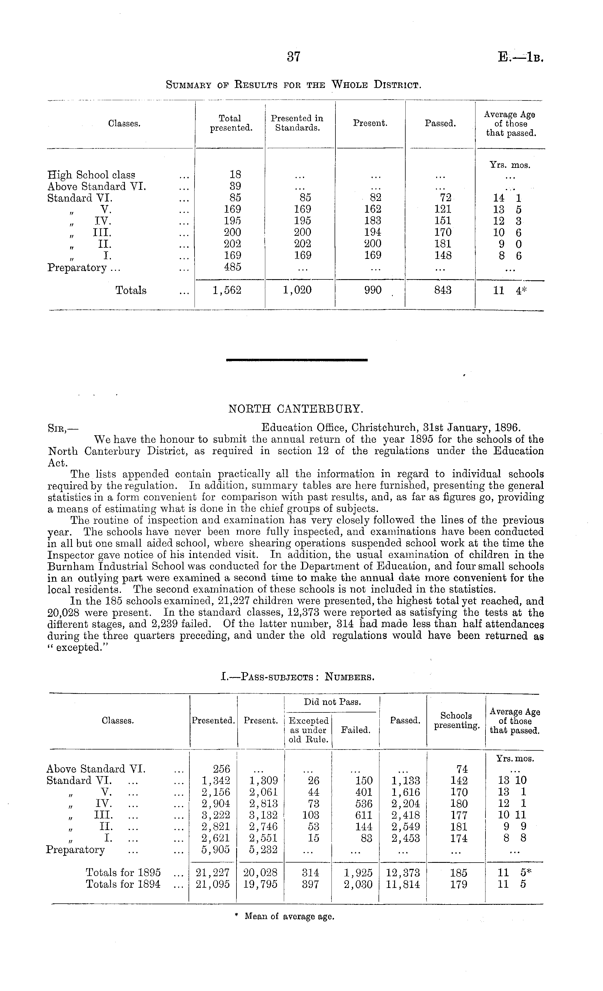 NOETH CANTBEBUEY. Sir, — Education Office, Christchurch, 31st January, 1896. We have the honour to submit the annual return of the year 1895 for the schools of the North Canterbury District, as required in section 12 of the regulations under the Education Act. The lists appended contain practically all the information in regard to individual schools required by the regulation. In addition, summary tables are here furnished, presenting the general statistics in a form convenient for comparison with past results, and, as far as figures go, providing a means of estimating what is done in the chief groups of subjects. The routine of inspection and examination has very closely followed the lines of the previous year. The schools have never been more fully inspected, and examinations have been conducted in all but one small aided school, where shearing operations suspended school work at the time the Inspector gave notice of his intended visit. In addition, the usual examination of children in the Burnham Industrial School was conducted for the Department of Education, and four small schools in an outlying part were examined a second time to make the annual date more convenient for the local residents. The second examination of these schools is not included in the statistics. In the 185 schools examined, 21,227 children were presented, the highest total yet reached, and 20,028 were present. In the standard classes, 12,373 were reported as satisfying the tests at the different stages, and 2,239 failed. Of the latter number, 314 had made less than half attendances during the three quarters preceding, and under the old regulations would have been returned as " excepted."